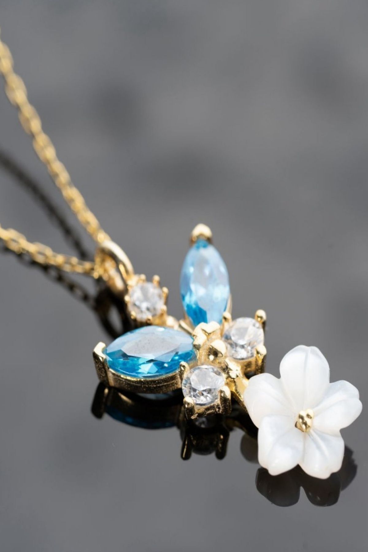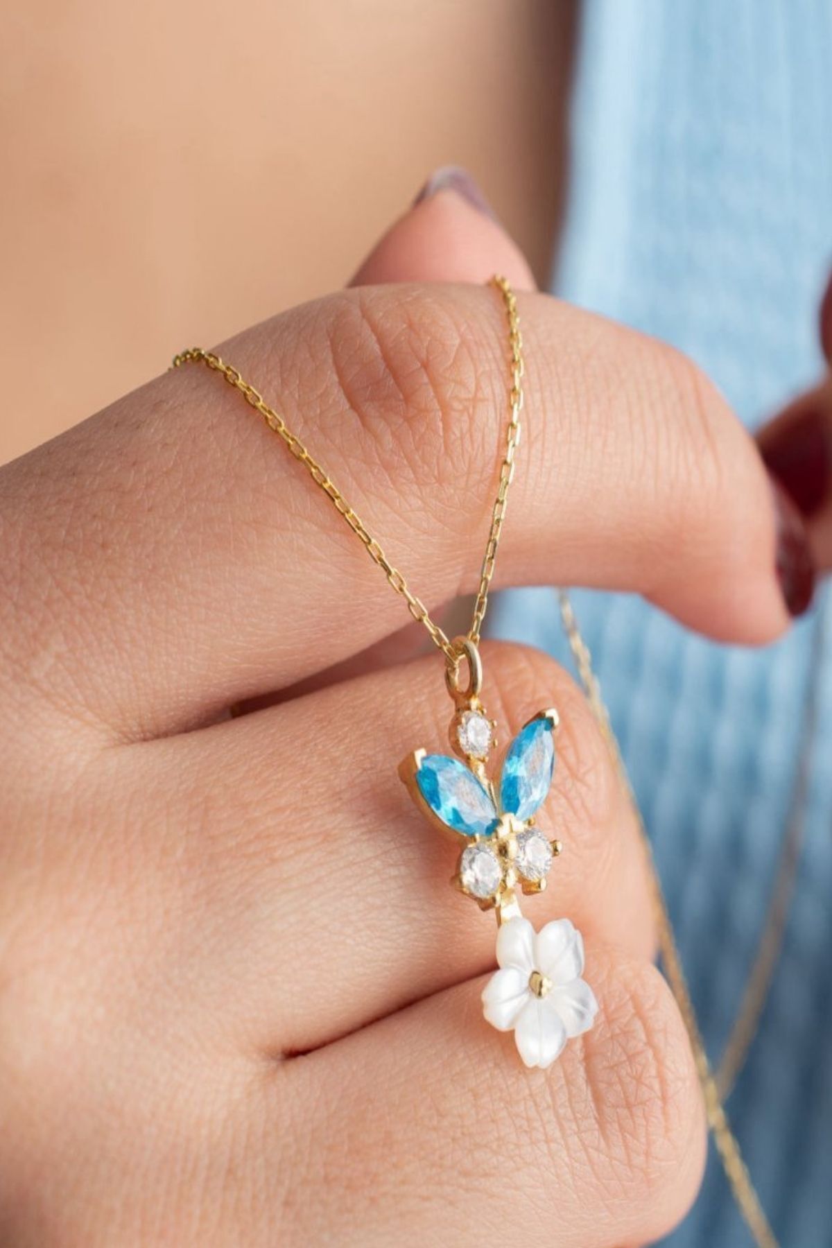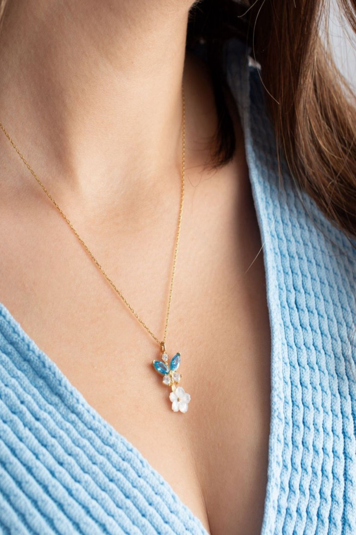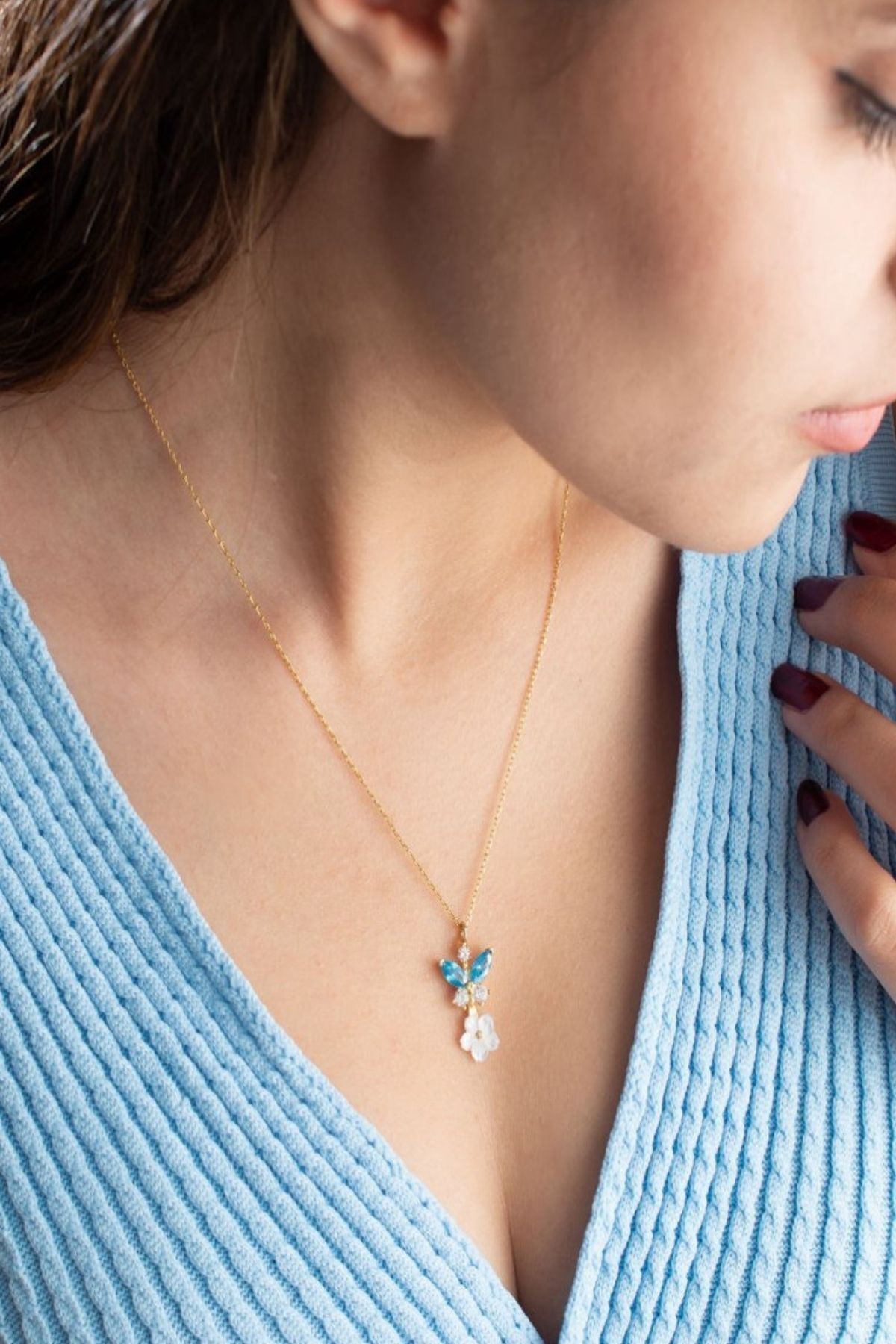 925 Ayar Gold Sedefli Gül Mavi Taşlı Kelebek Gümüş Kolye