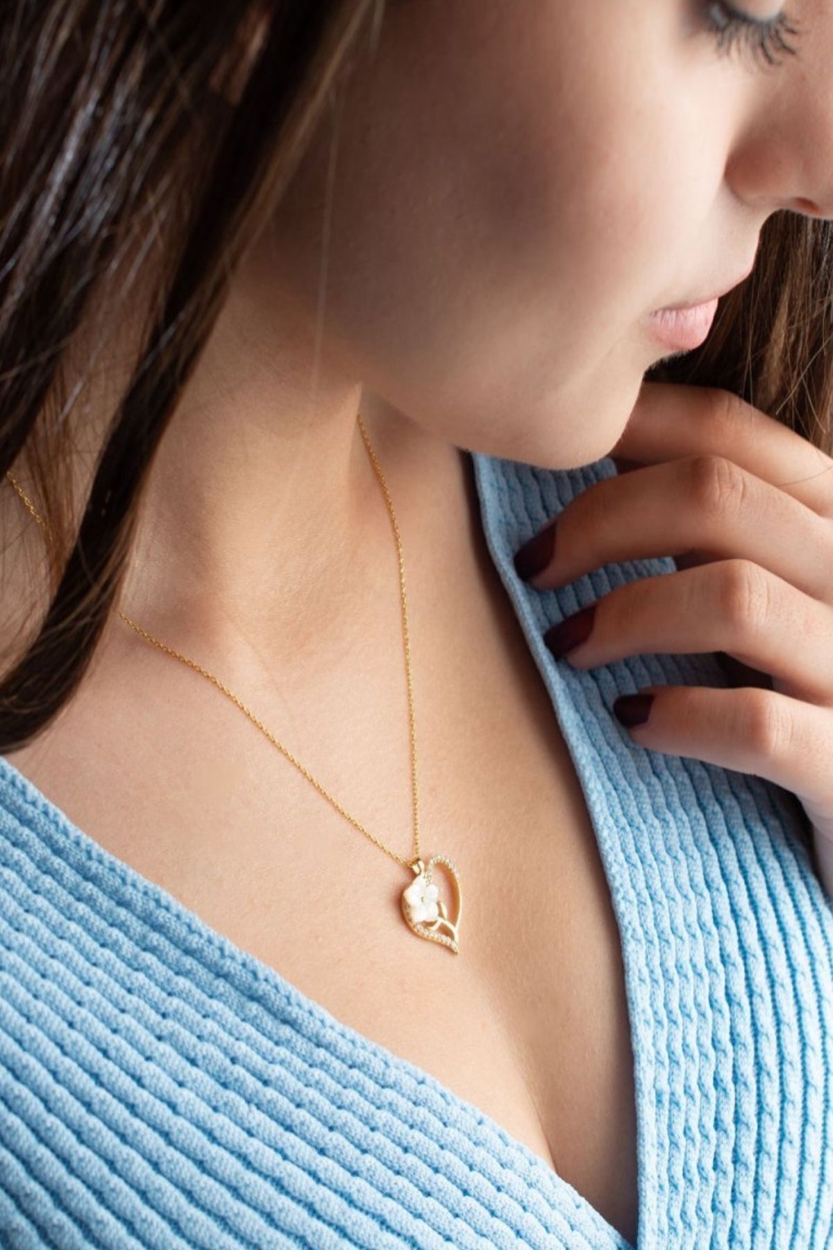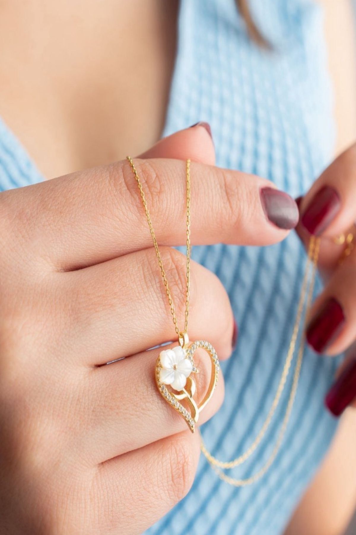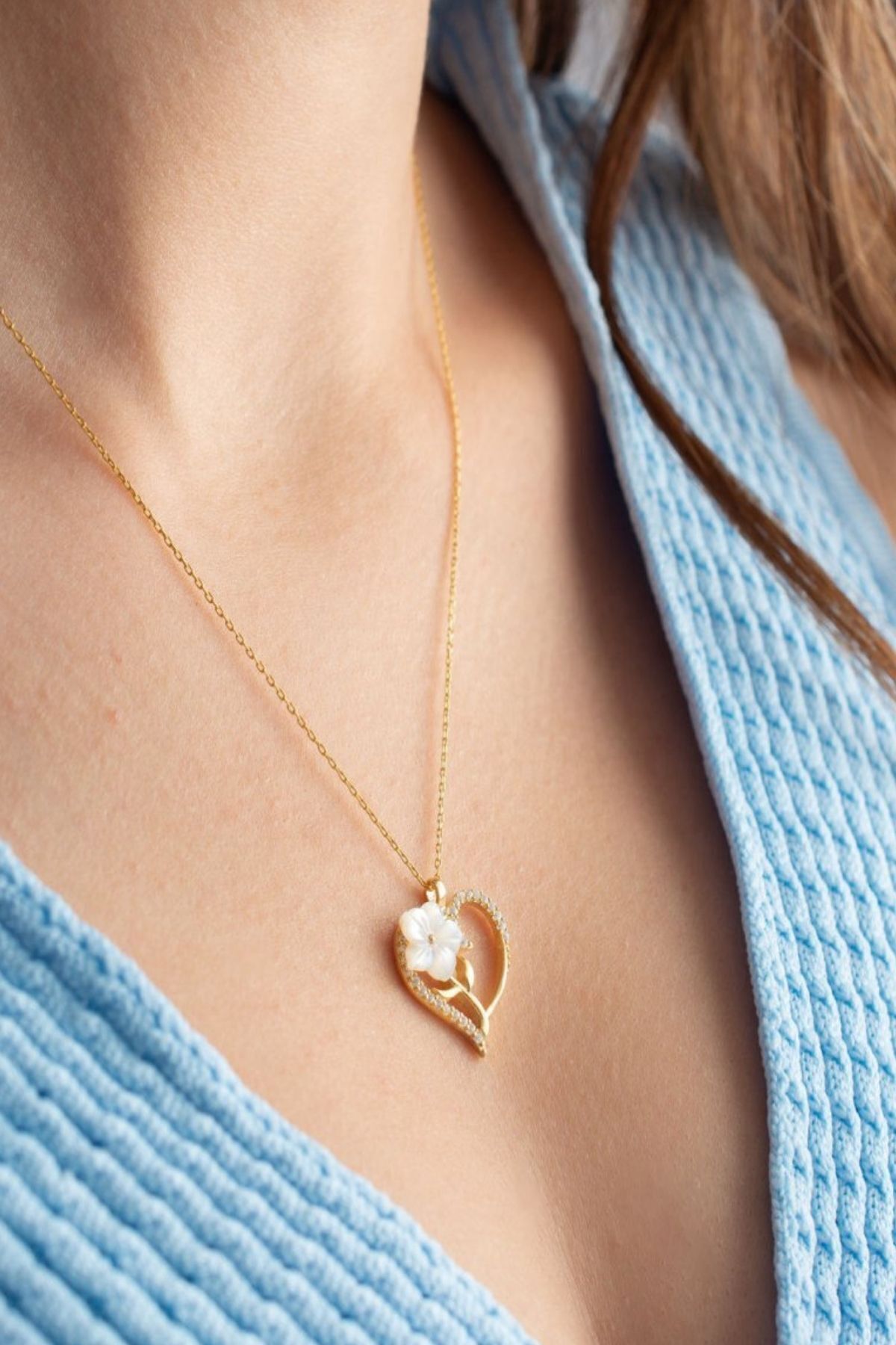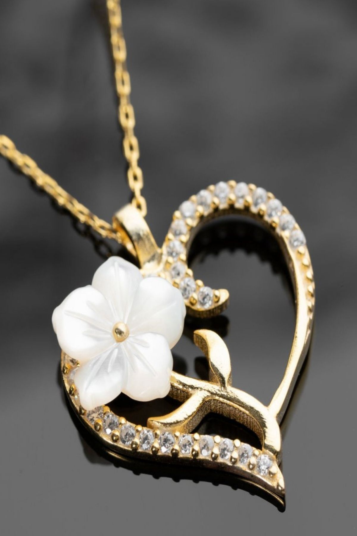 925 Ayar Gold Zirkon Taşlı Sedefli Kalp Gümüş Kolye