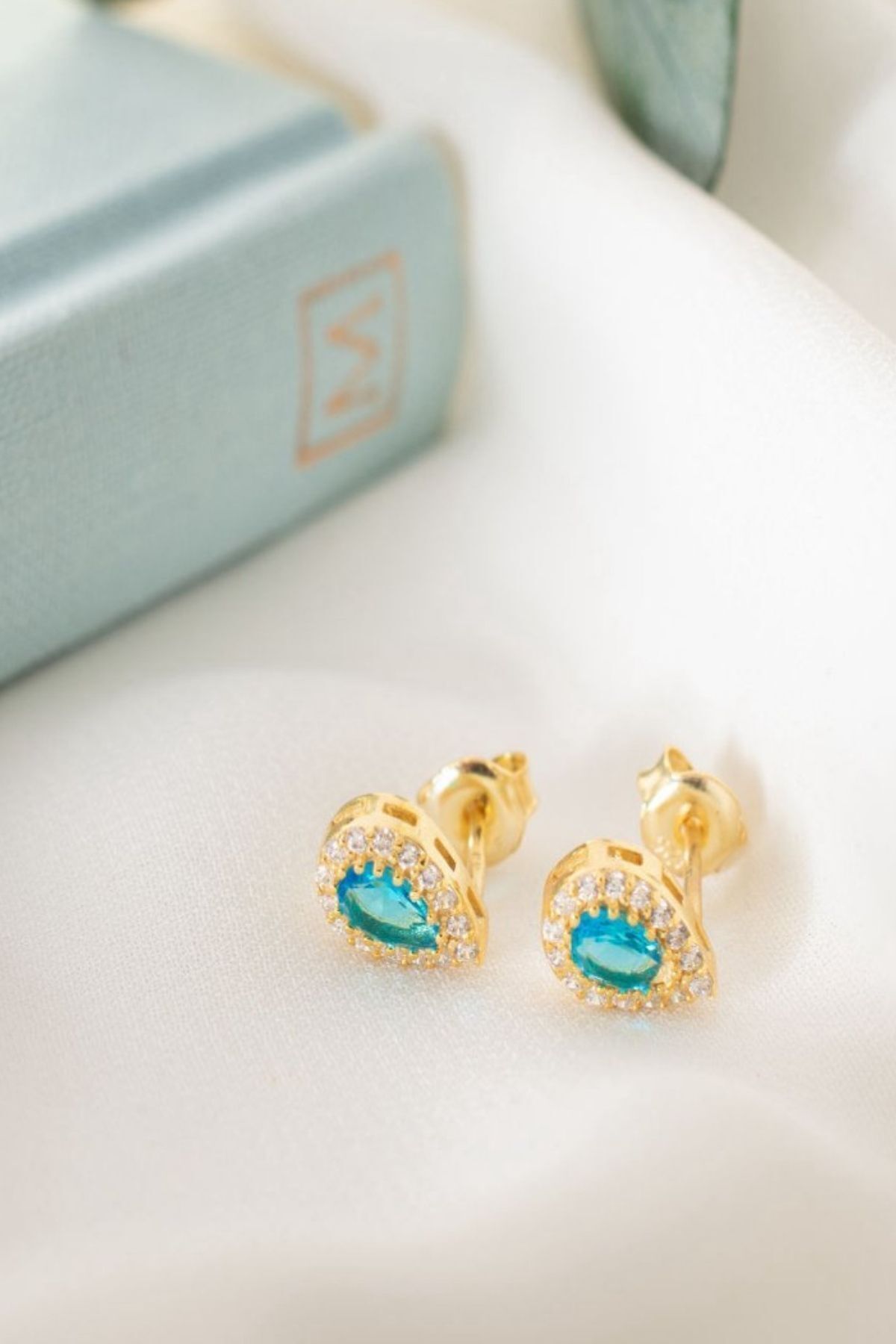925 Ayar Gold Zirkon Taşlı Yuvarlak Aralık Ayı Blue Topaz Gümüş Küpe