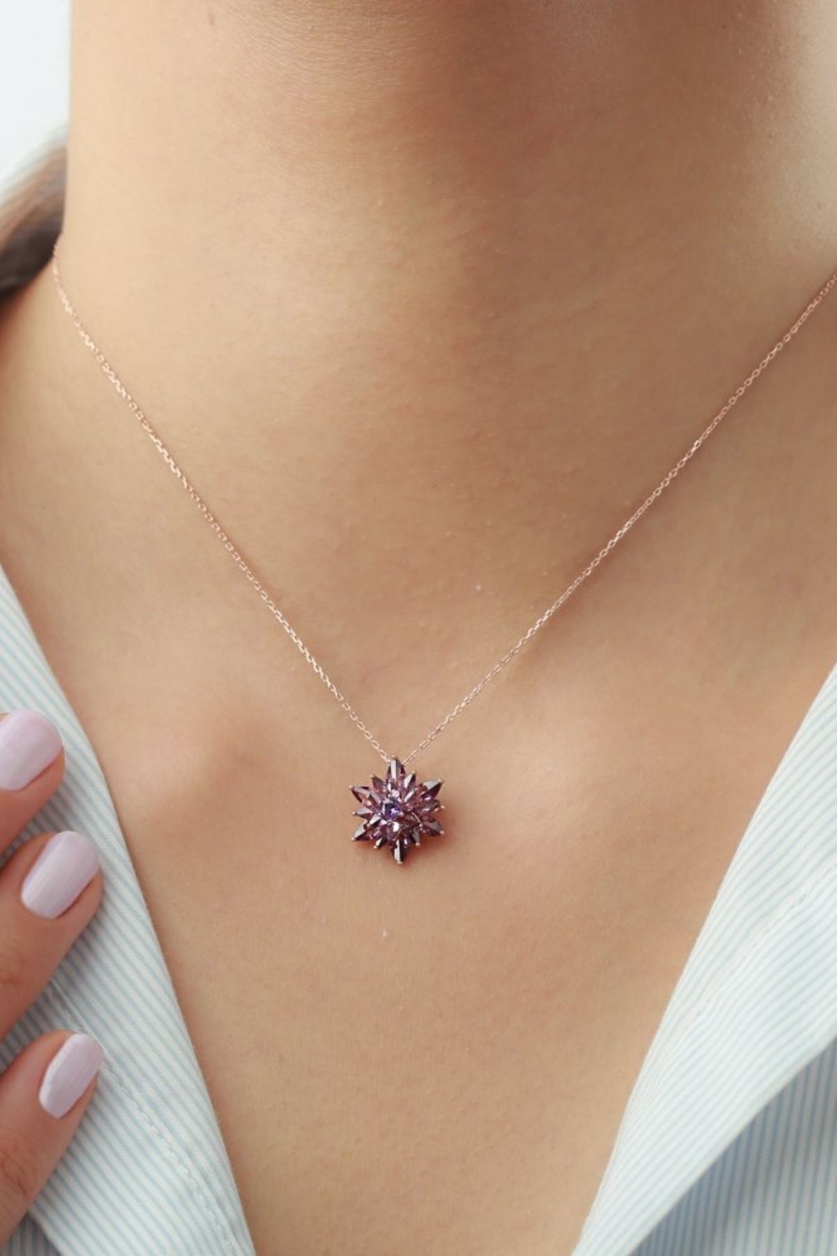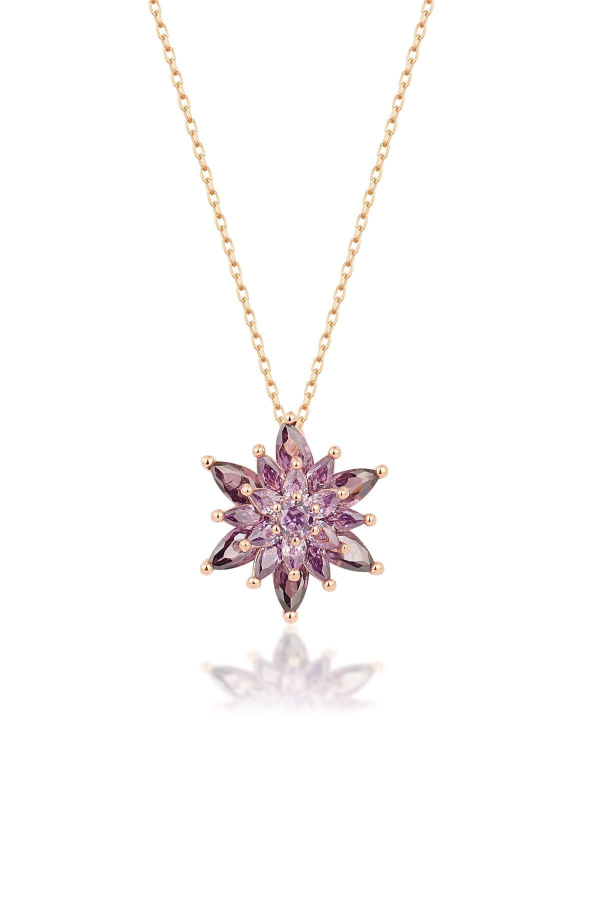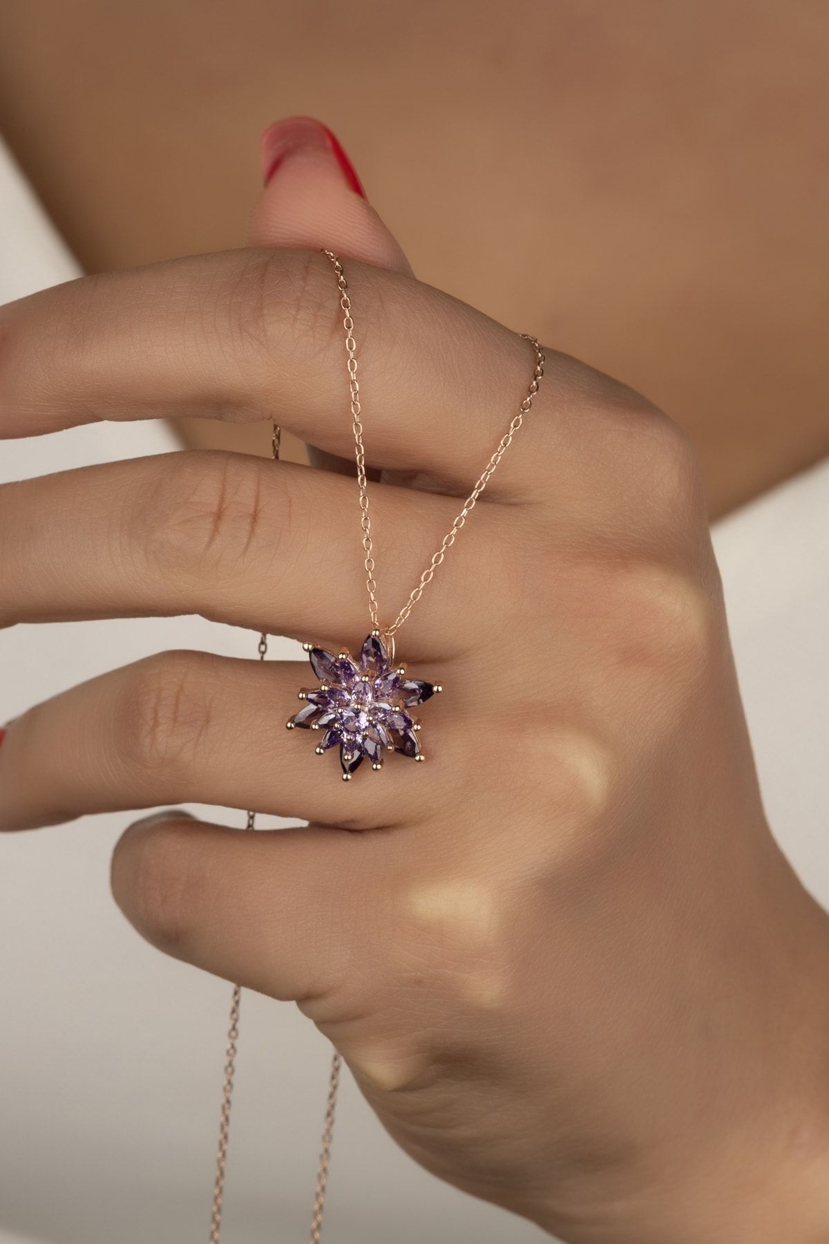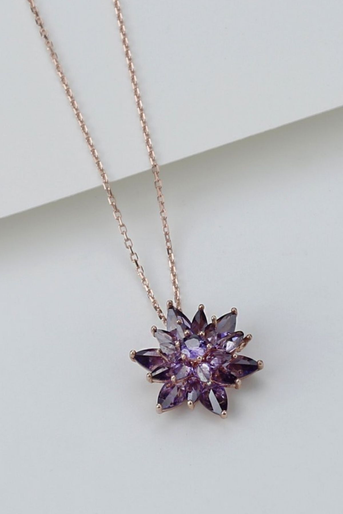 925 Ayar Gümüş 4 Katman Mor Lotus Çiçeği Kolye