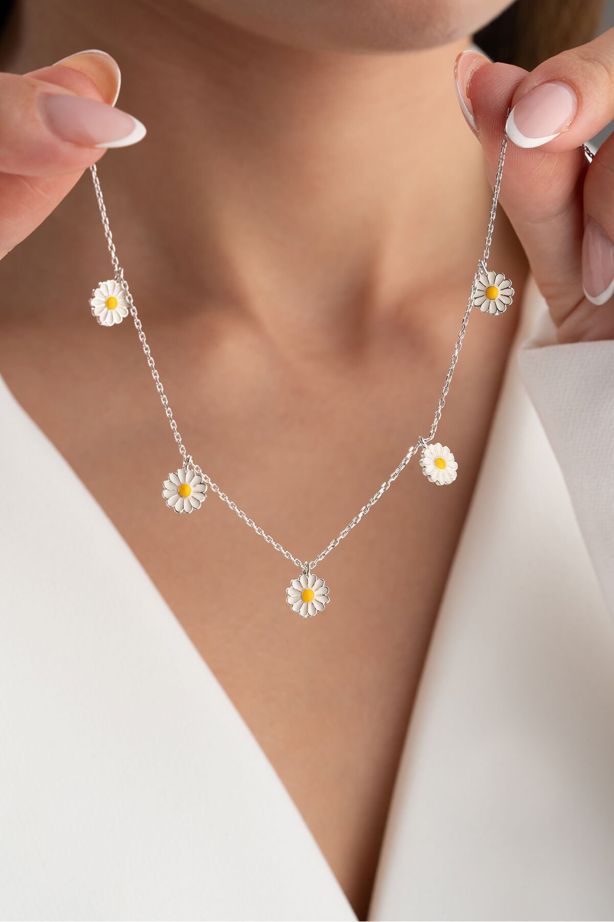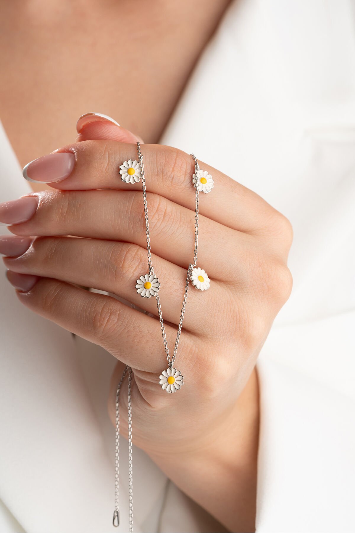 - 925 ayar gümüş malzeme kullanılarak üretilmiş, uzun ömürlü ve kaliteli bir aksesuar deneyimi sunar; - Zarif papatya desenleriyle süslenmiş, her türlü kıyafetle uyum sağlayacak şık bir tasarıma sahiptir; - Taş içermeyen yapısıyla alerji riskini minimize eder ve günlük kullanım için idealdir; - Gümüş materyalin parlaklığı ve dayanıklılığı, kolyenin her zaman yeni gibi görünmesini sağlar;