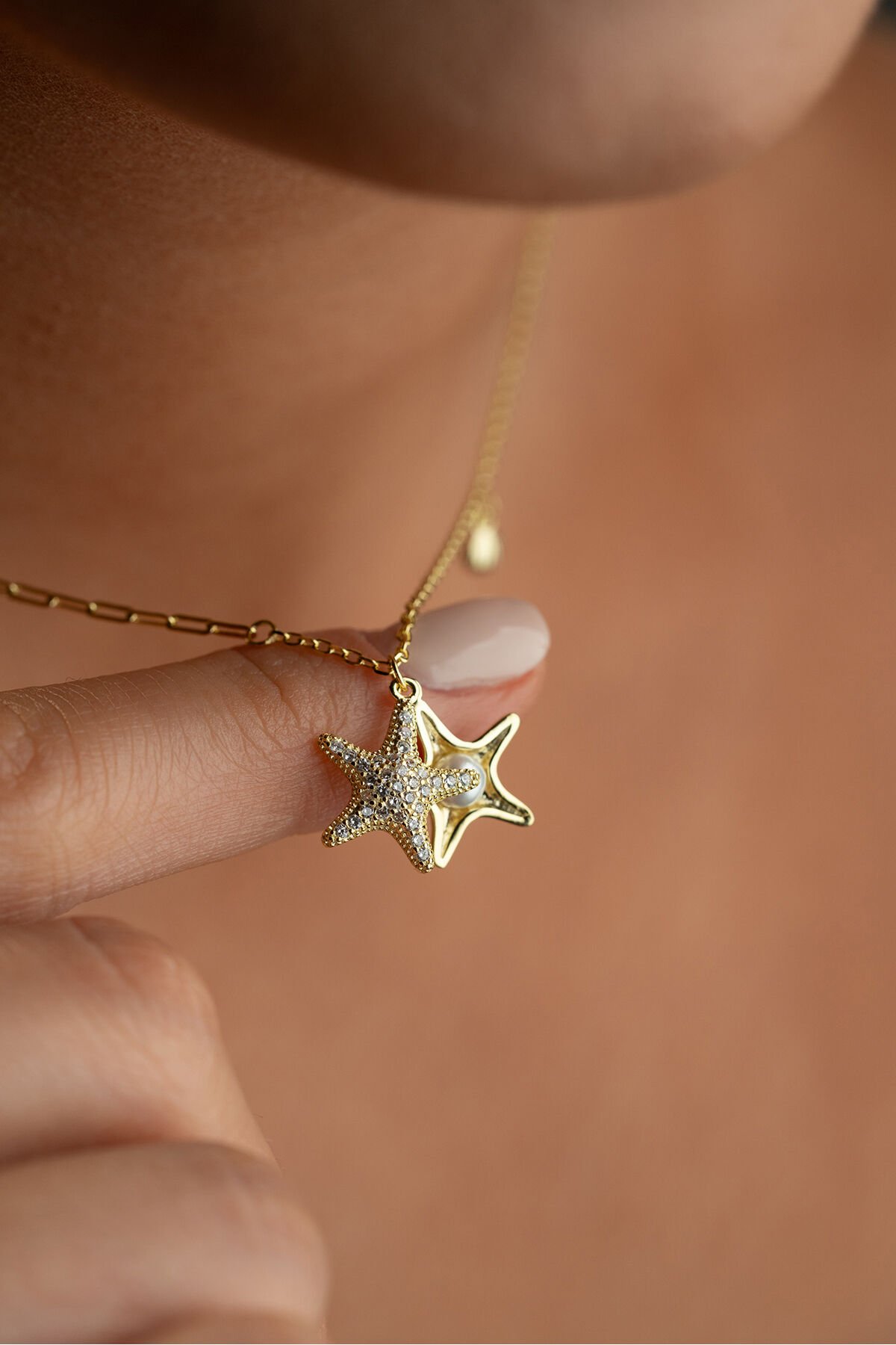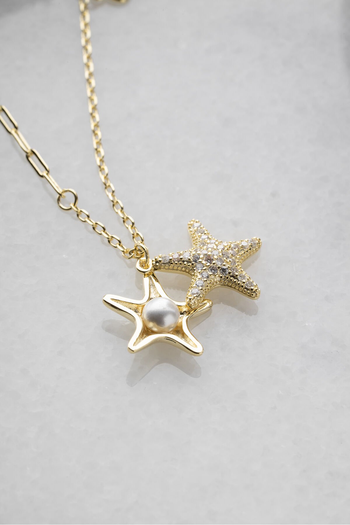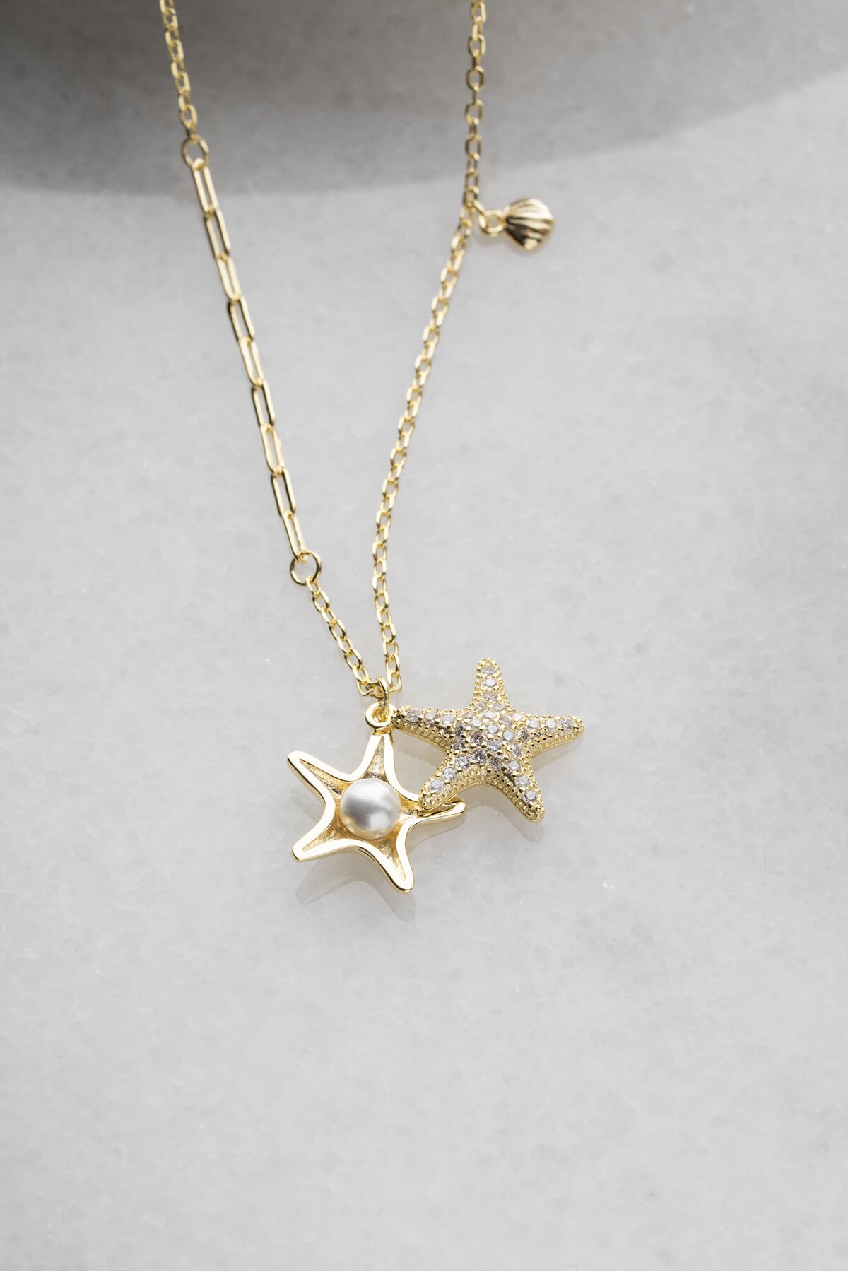 925 Ayar Gümüş Altın Kaplama İncili Deniz Yıldızı Kolye