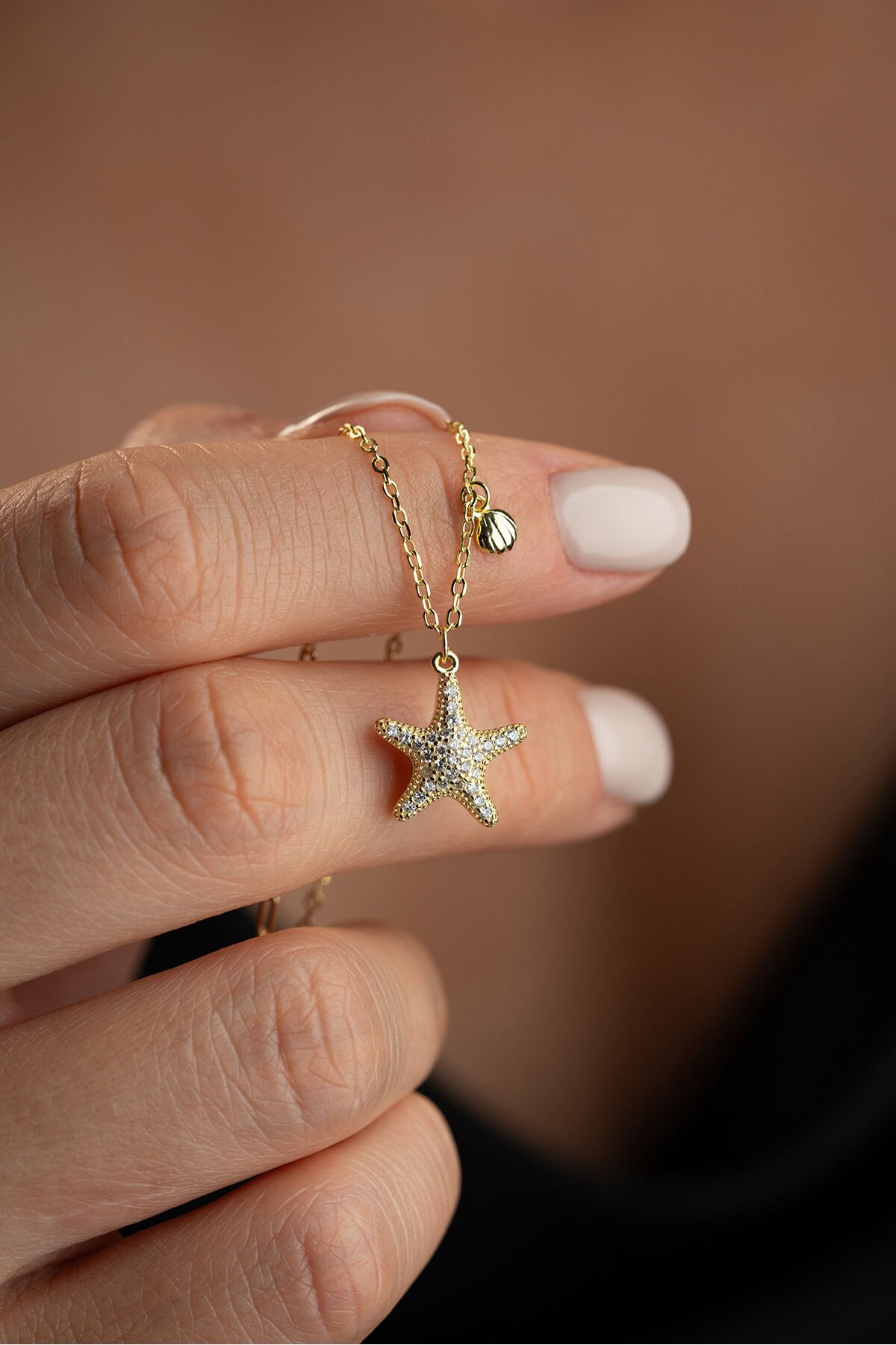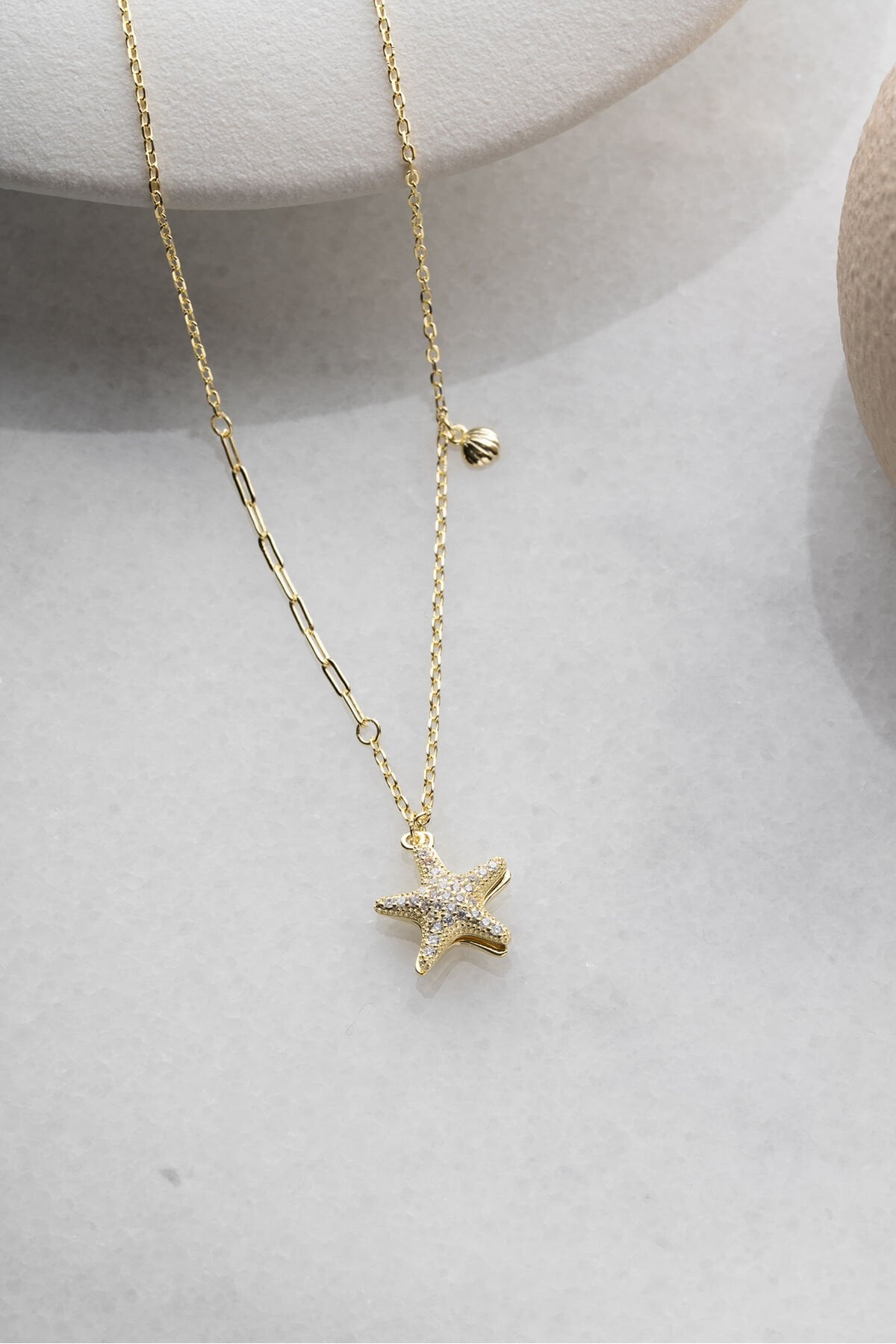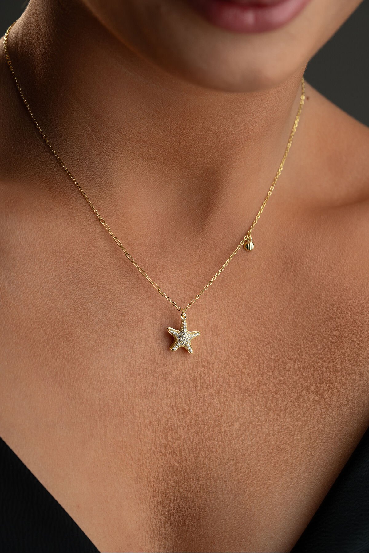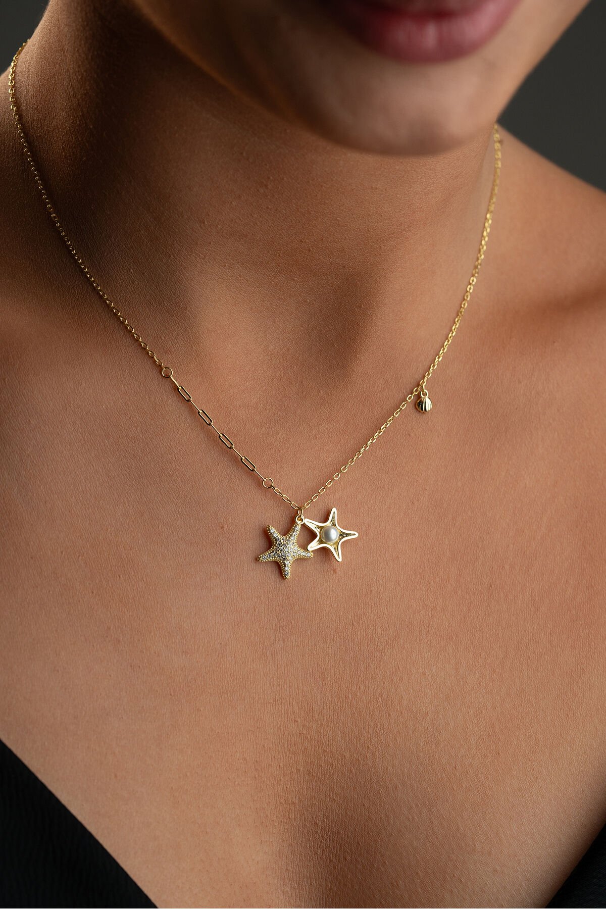 925 Ayar Gümüş Altın Kaplama İncili Deniz Yıldızı Kolye