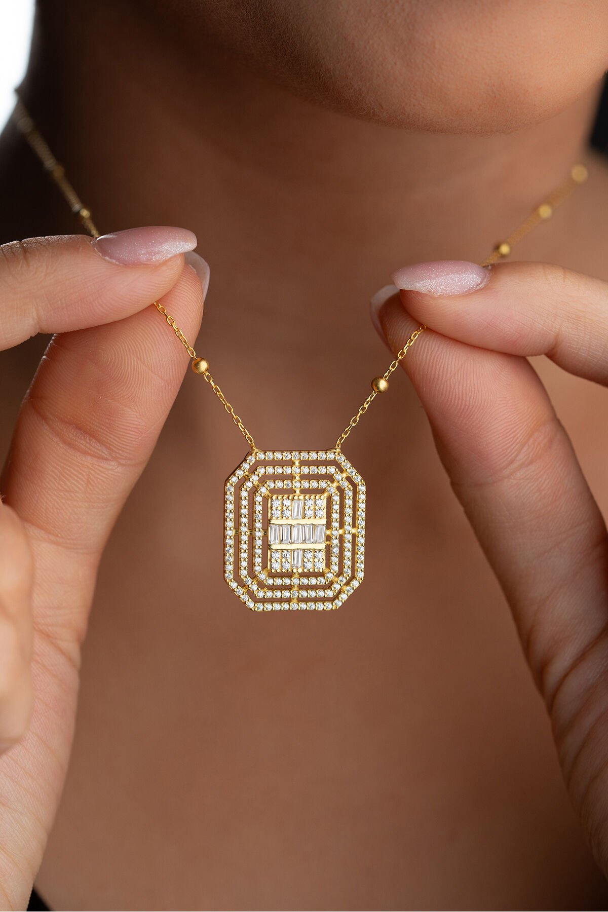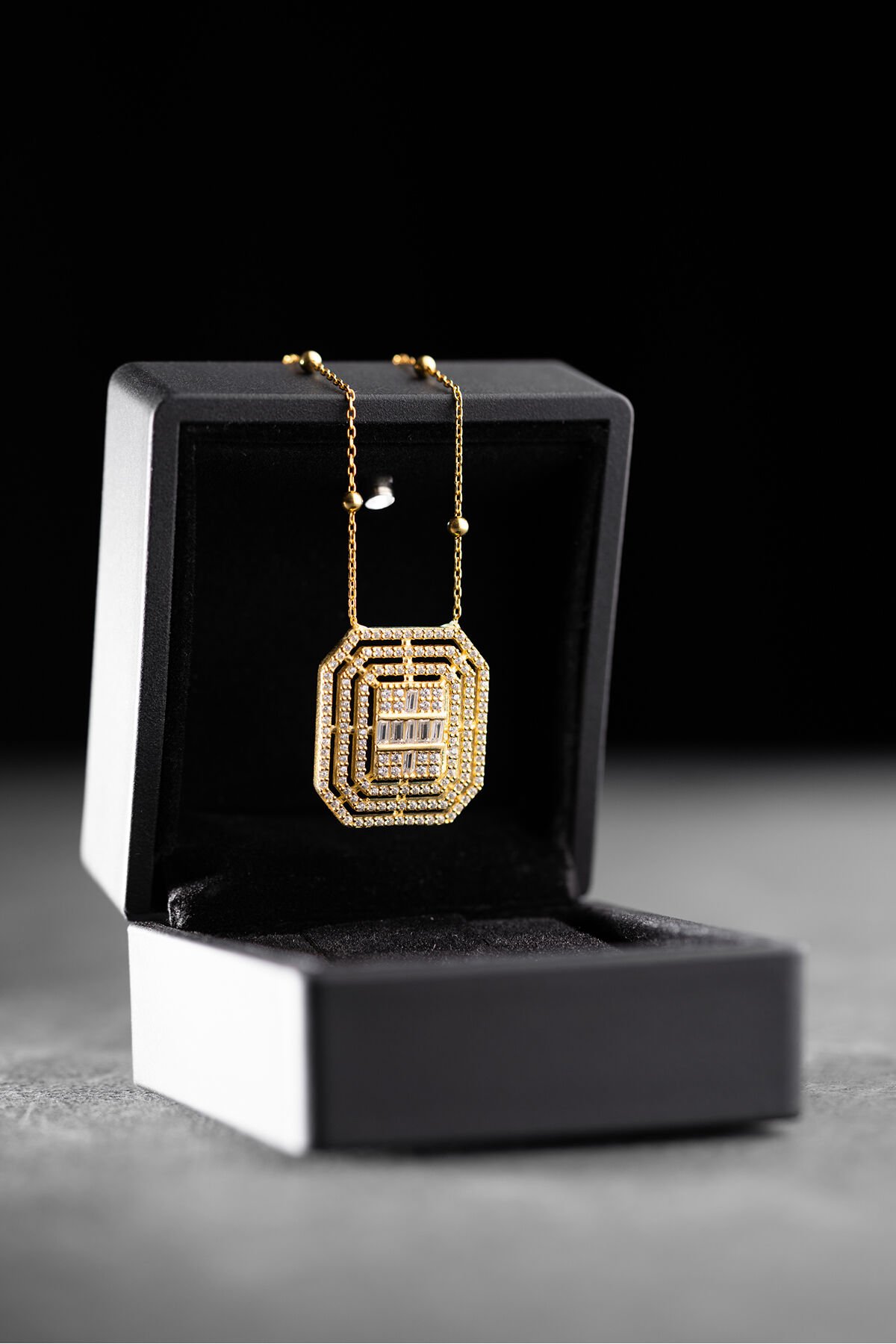 925 Ayar Gümüş Altın Kaplama Işıklı Kutuda Hediyelik Pırlanta Model Baget Kolye