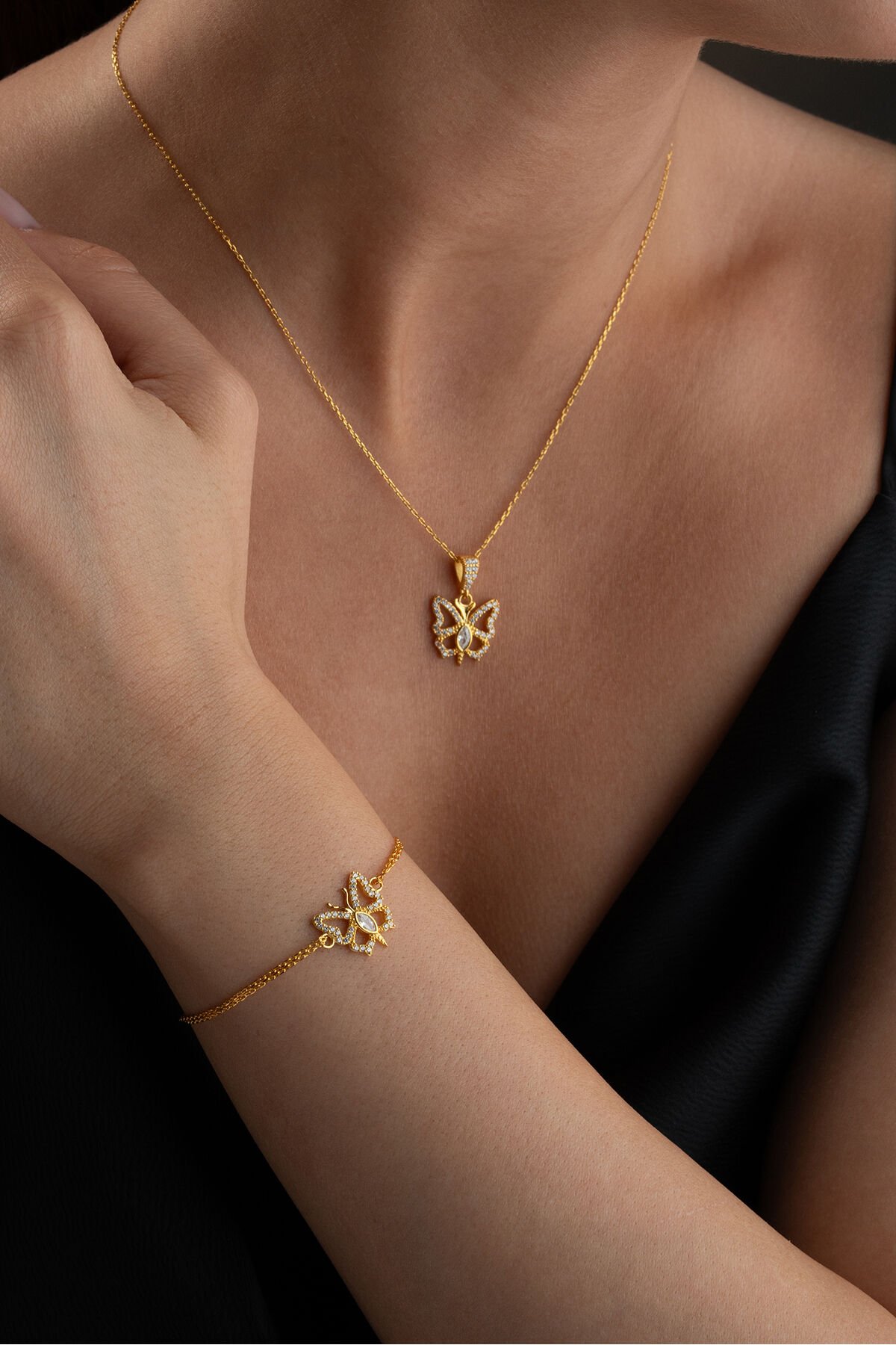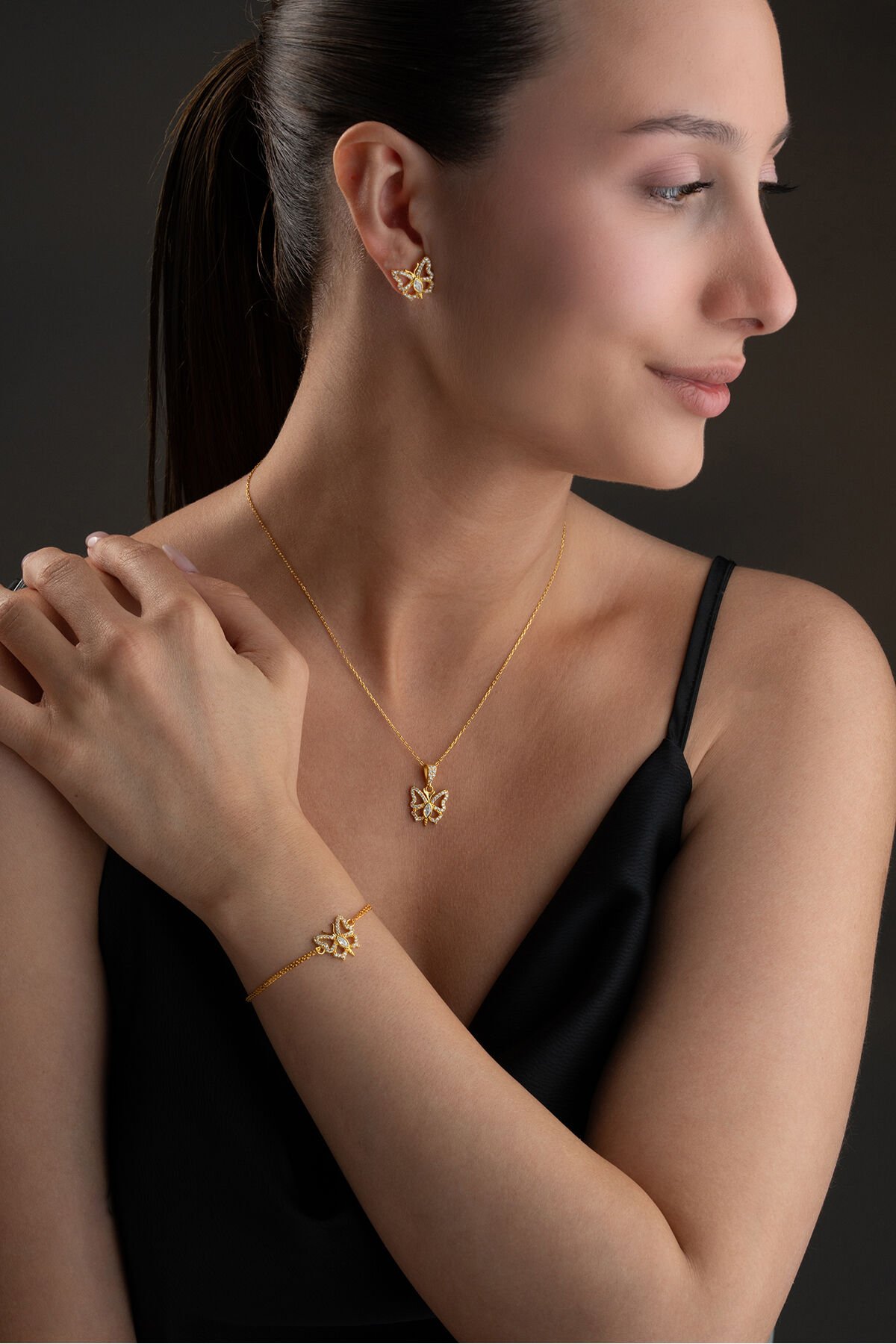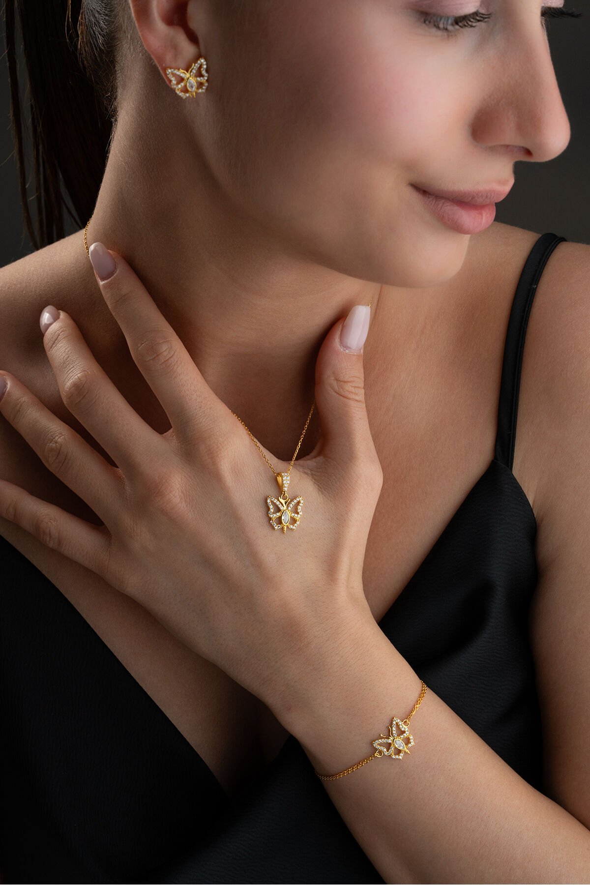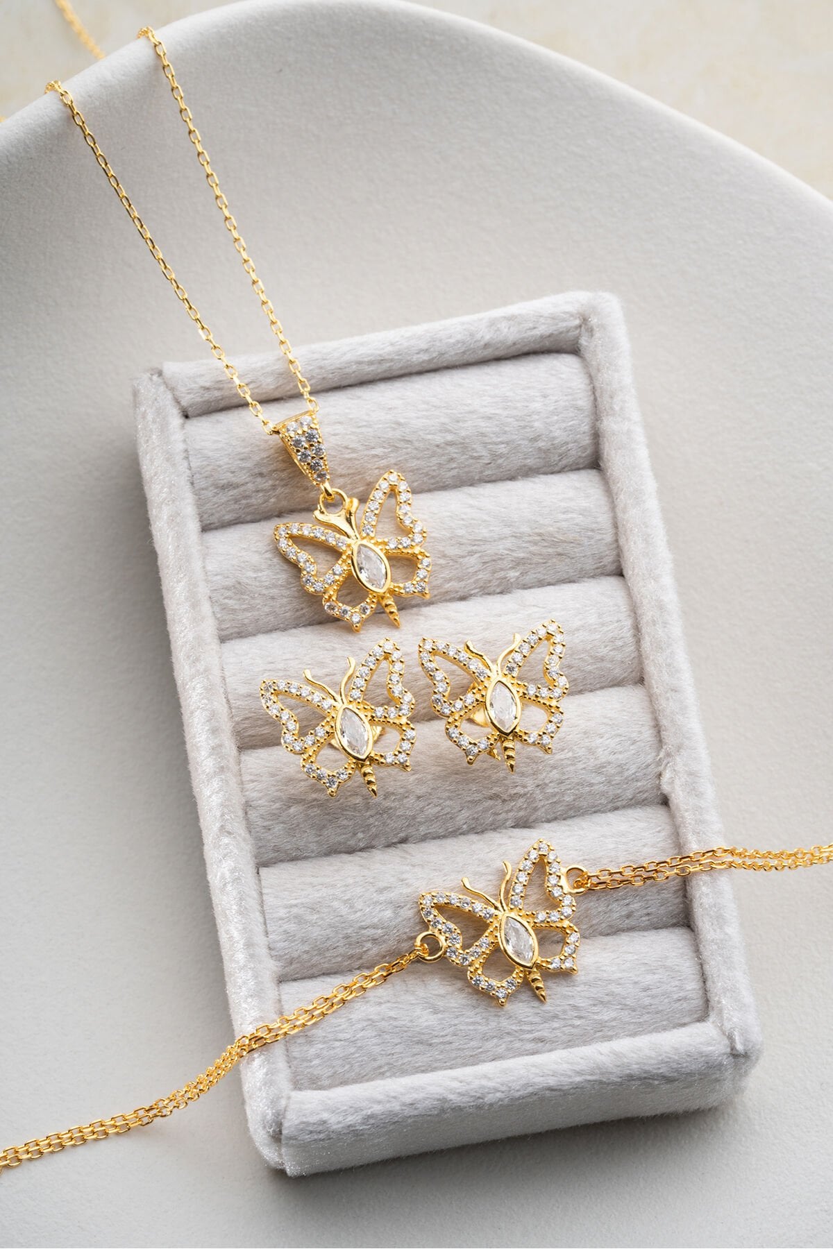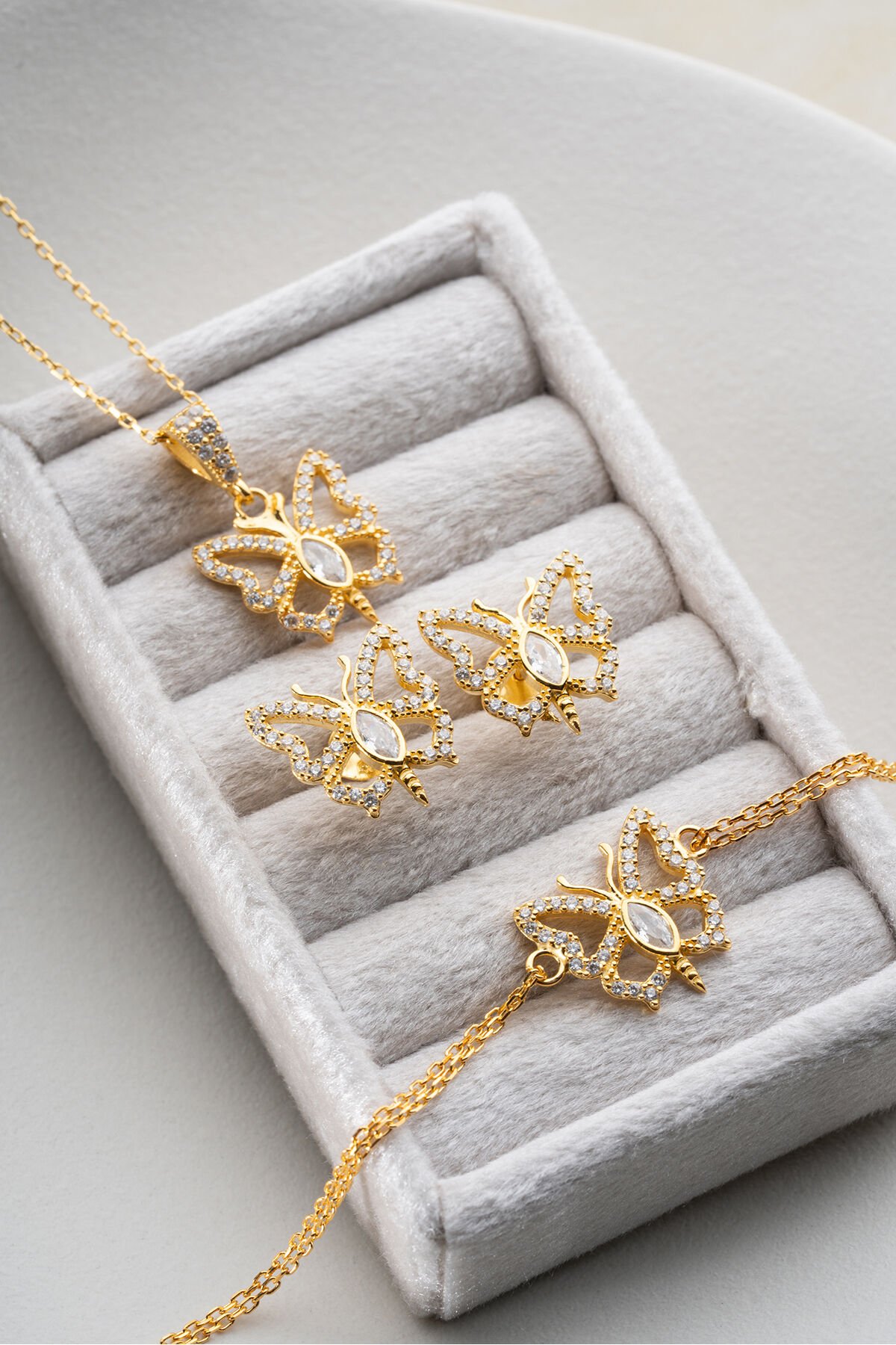 925 Ayar Gümüş Altın Kaplama Kelebek Kolye Küpe Bileklik Set