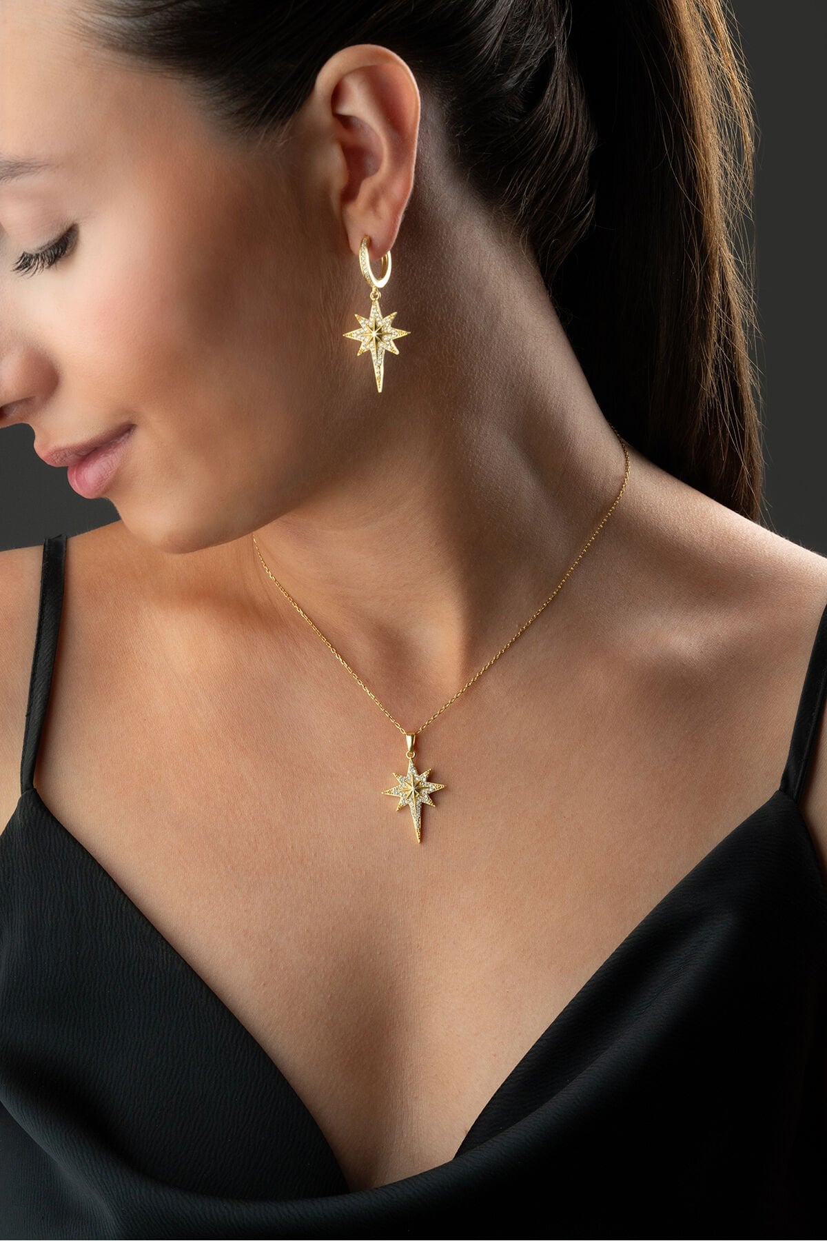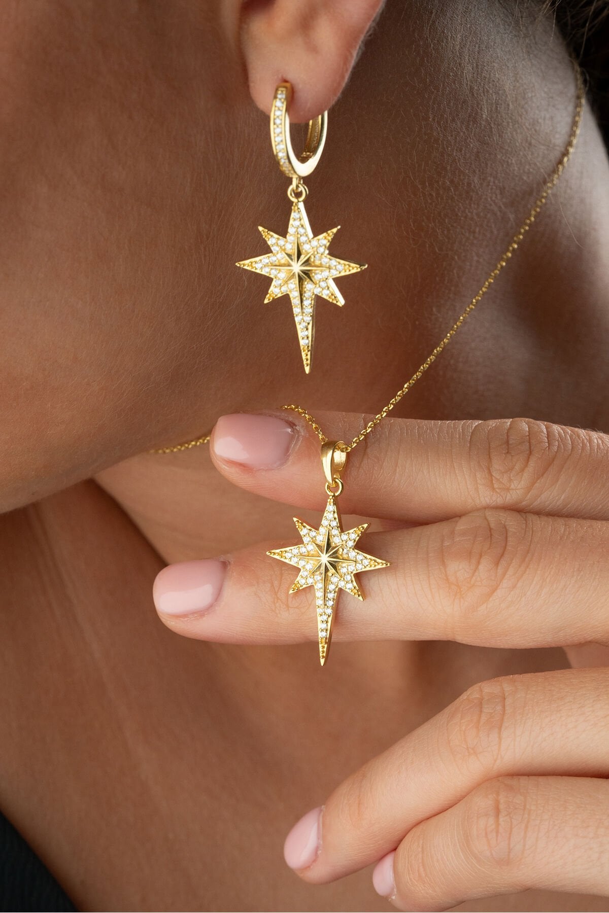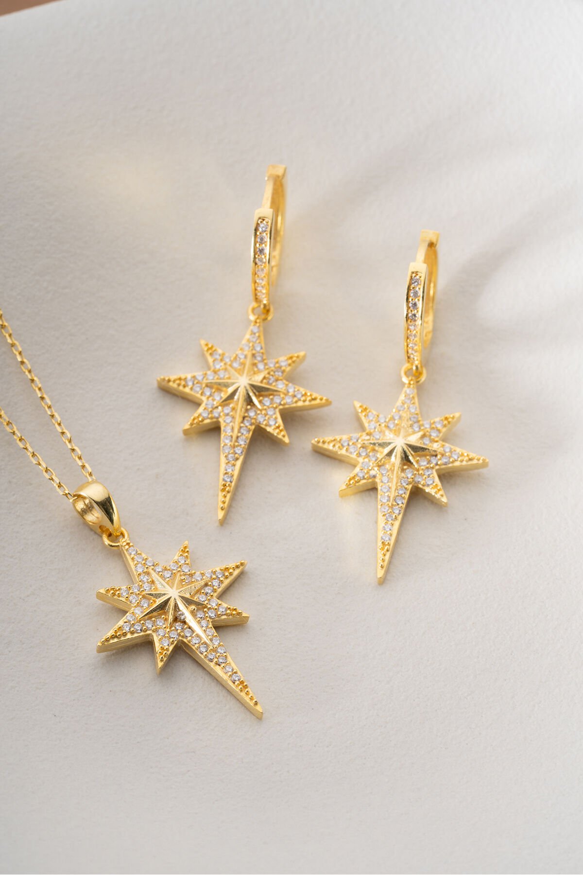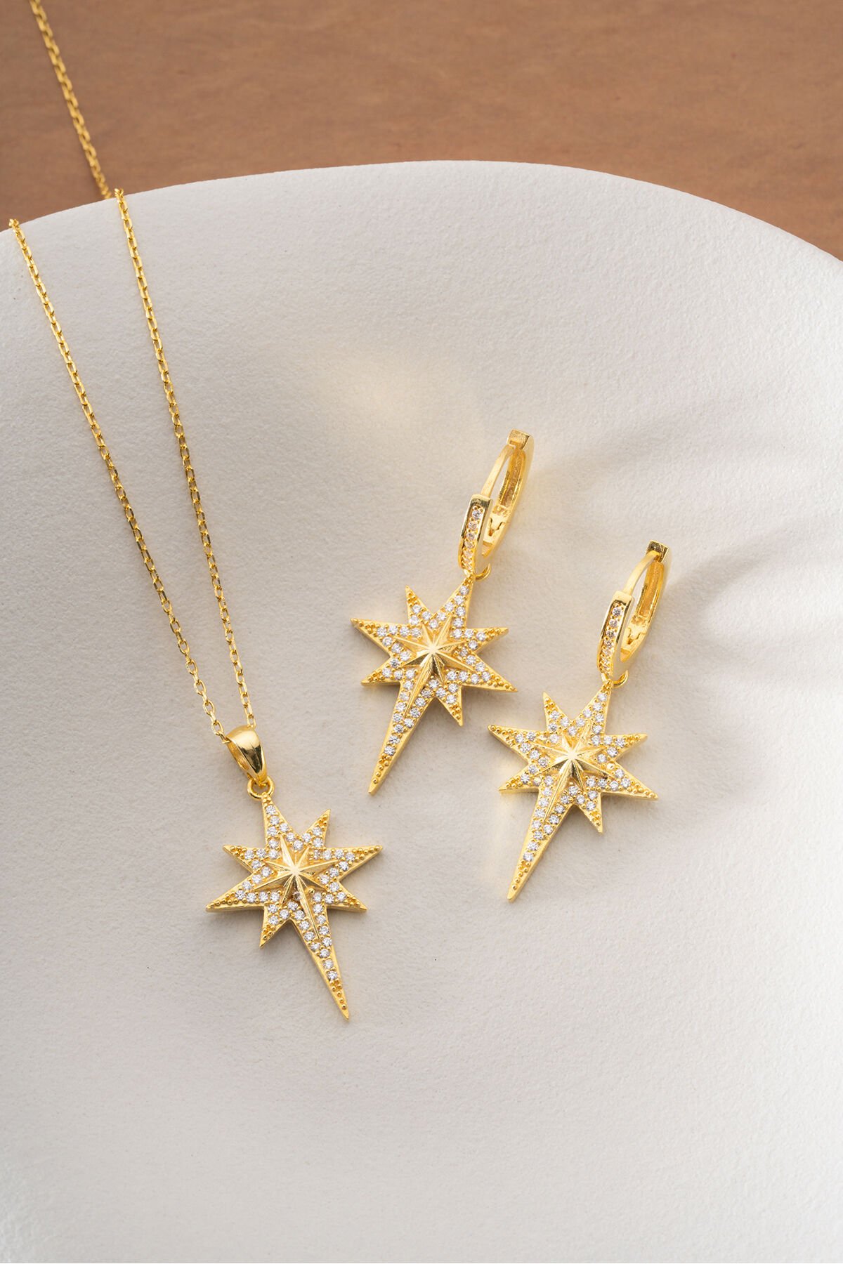 925 Ayar Gümüş Altın Kaplama Kutup Yıldızı Kolye Küpe Set