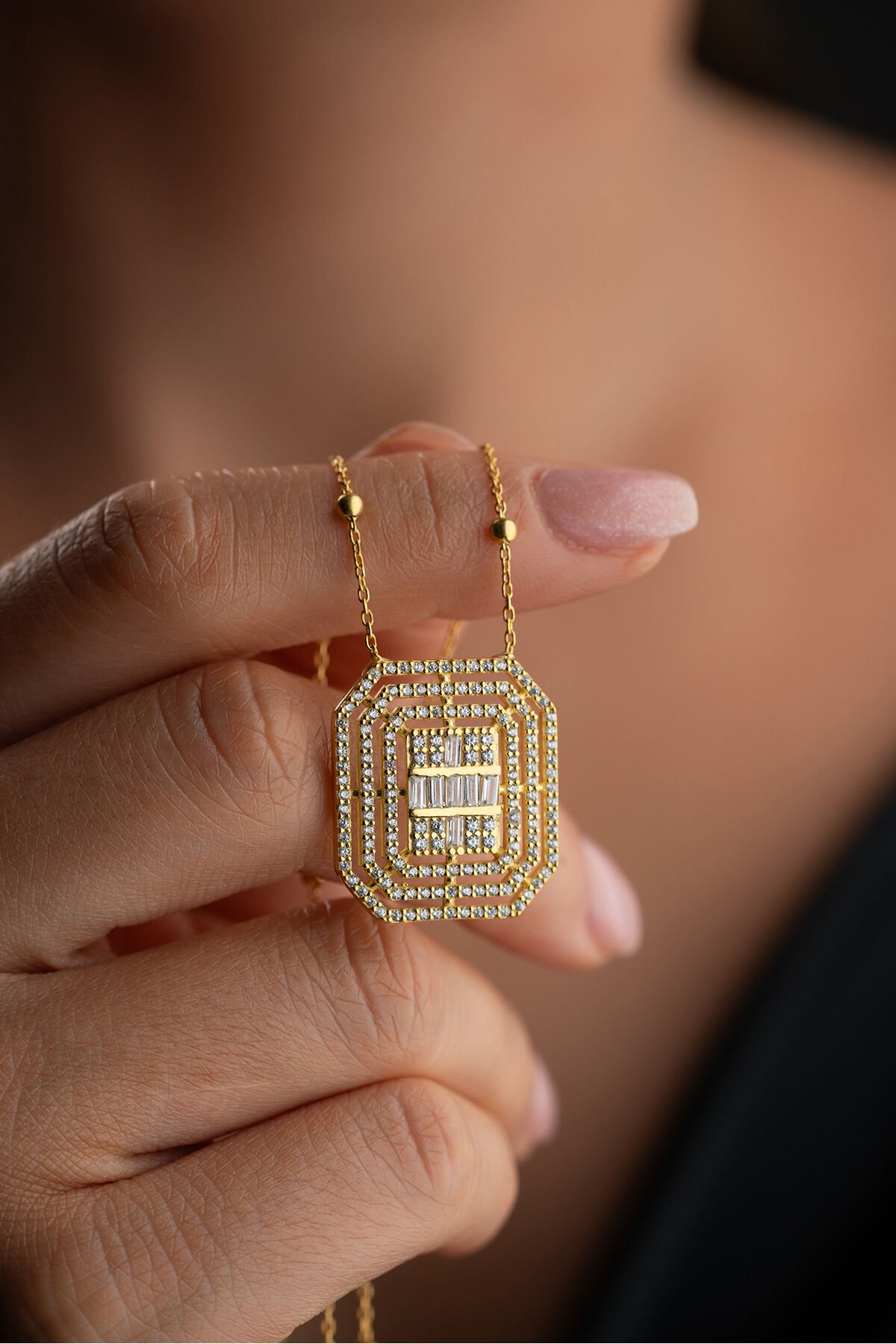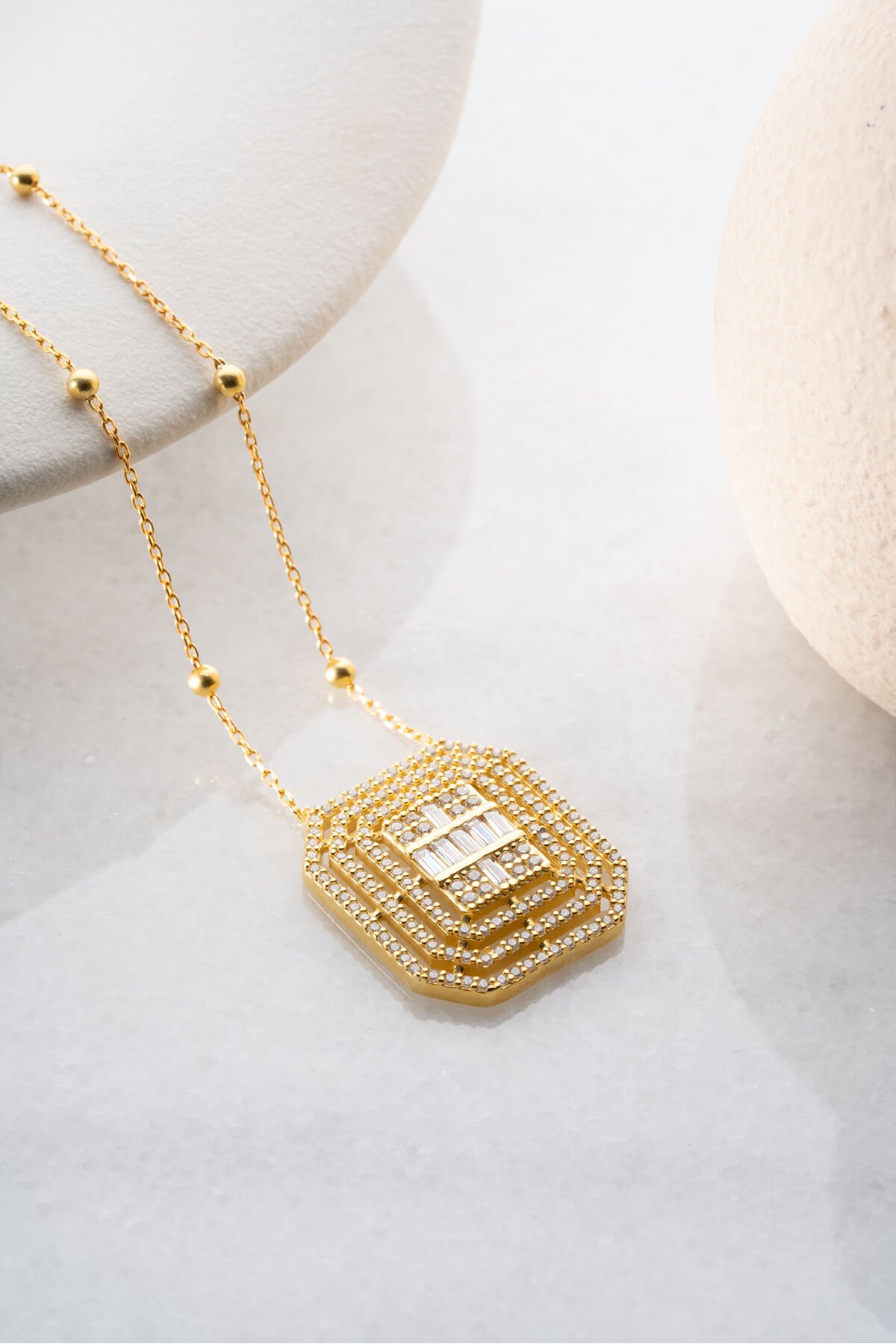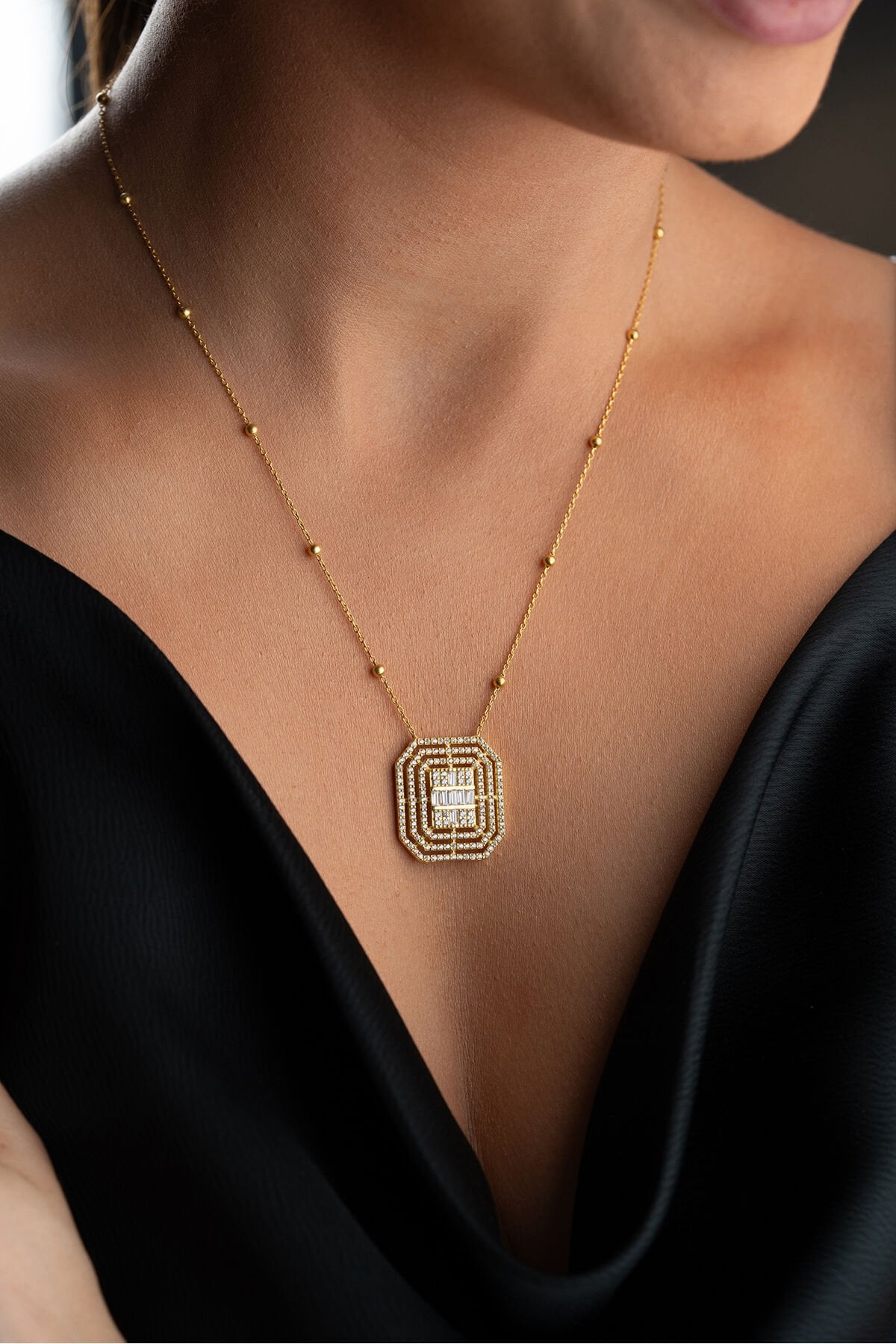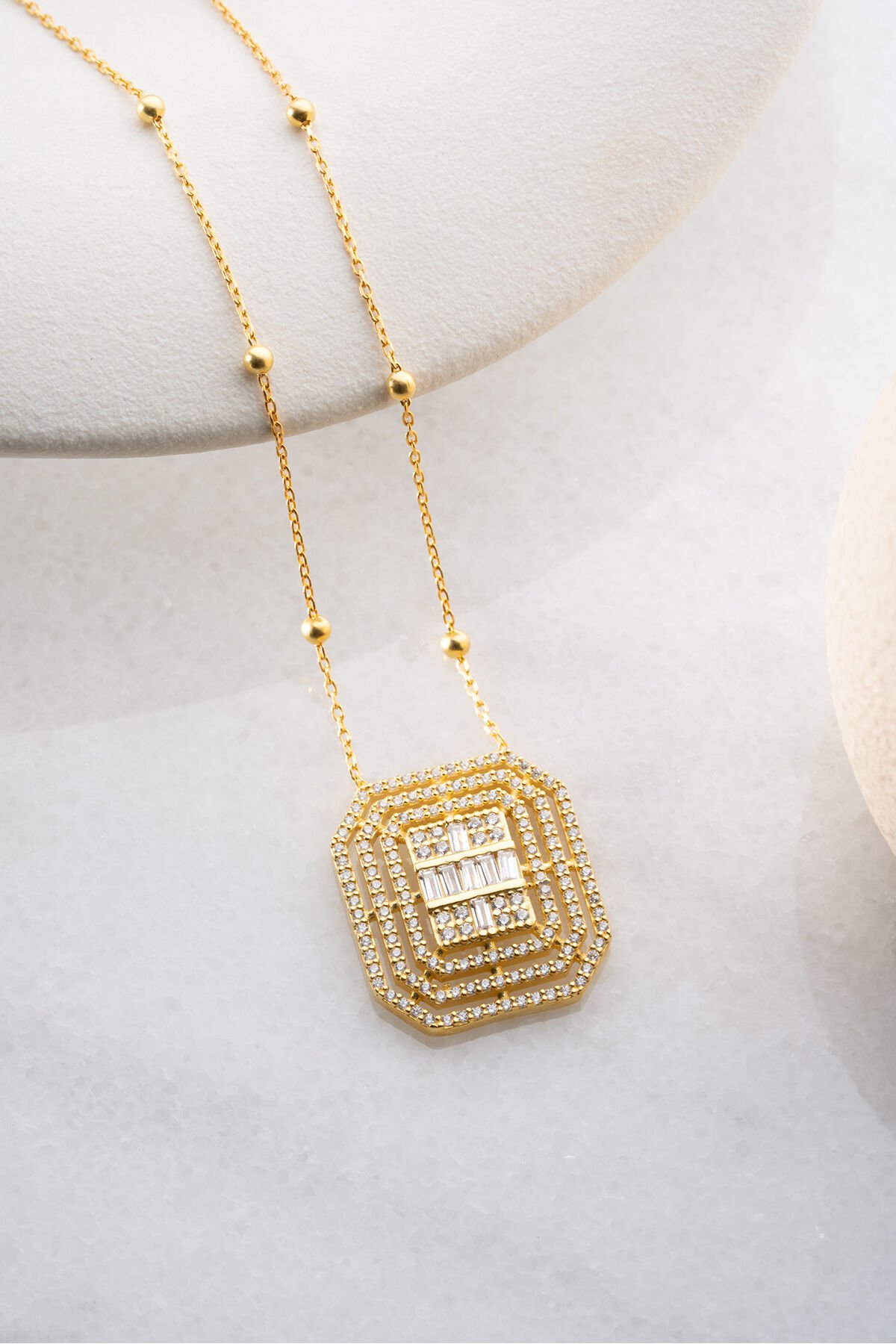 925 Ayar Gümüş Altın Kaplama Pırlanta Model Baget Kolye