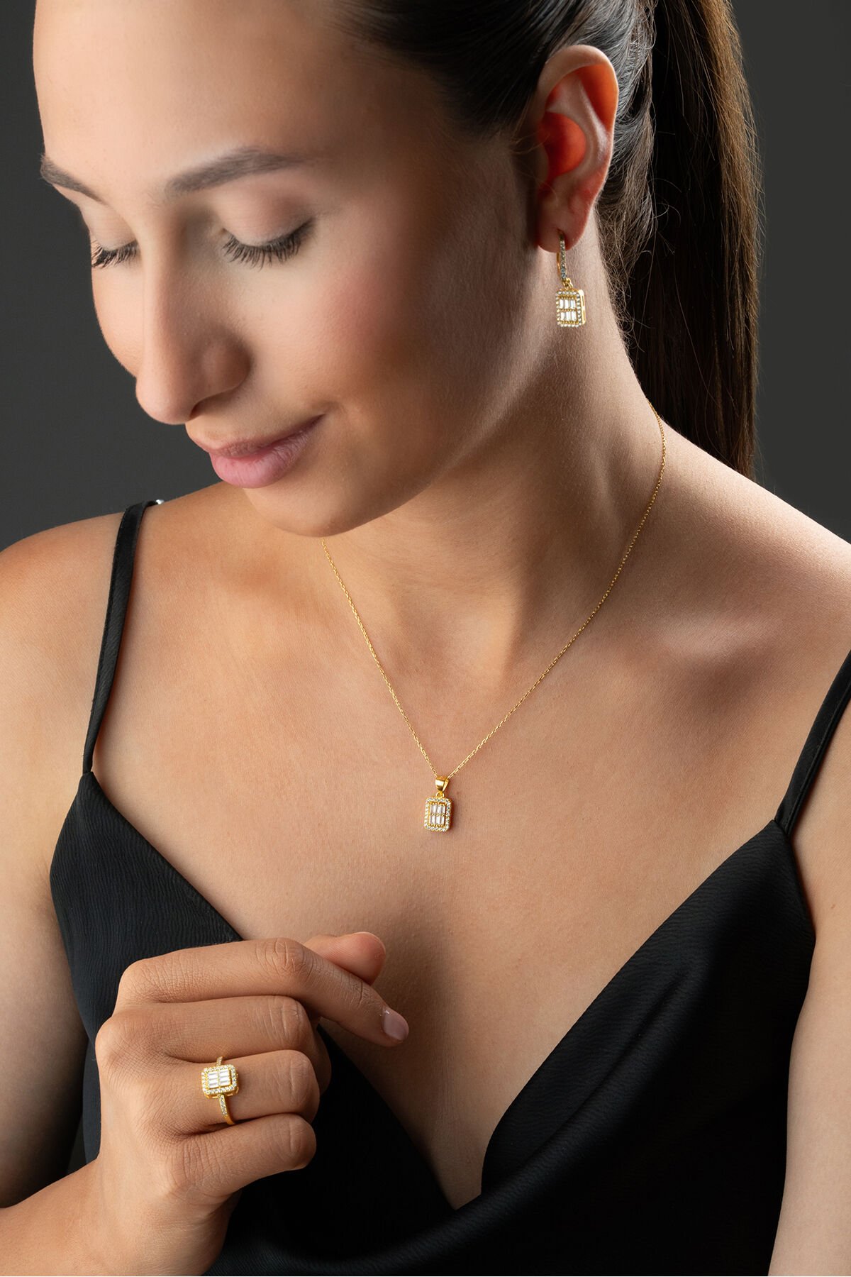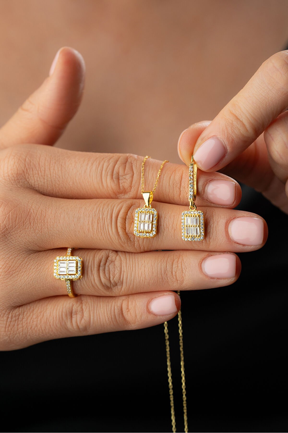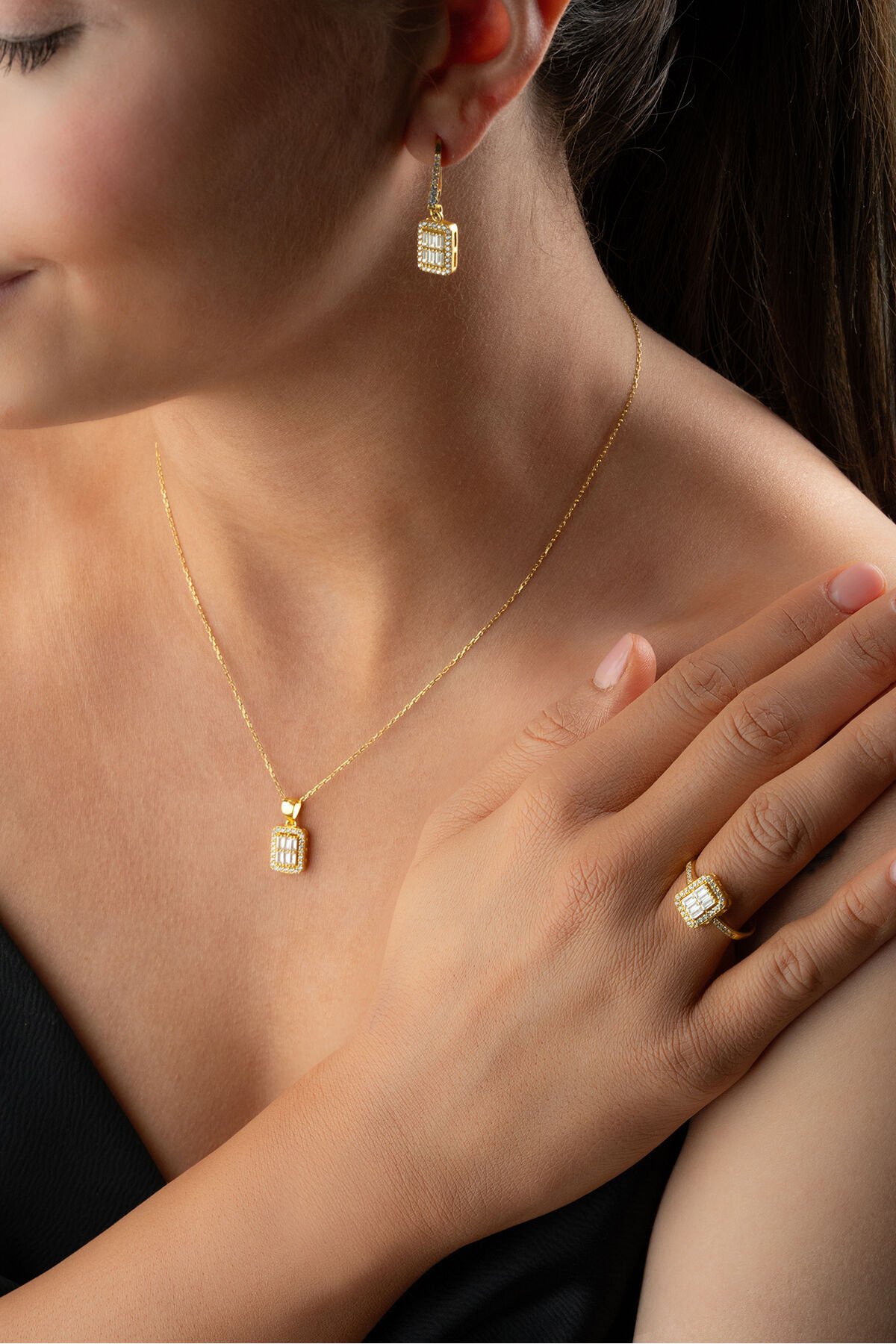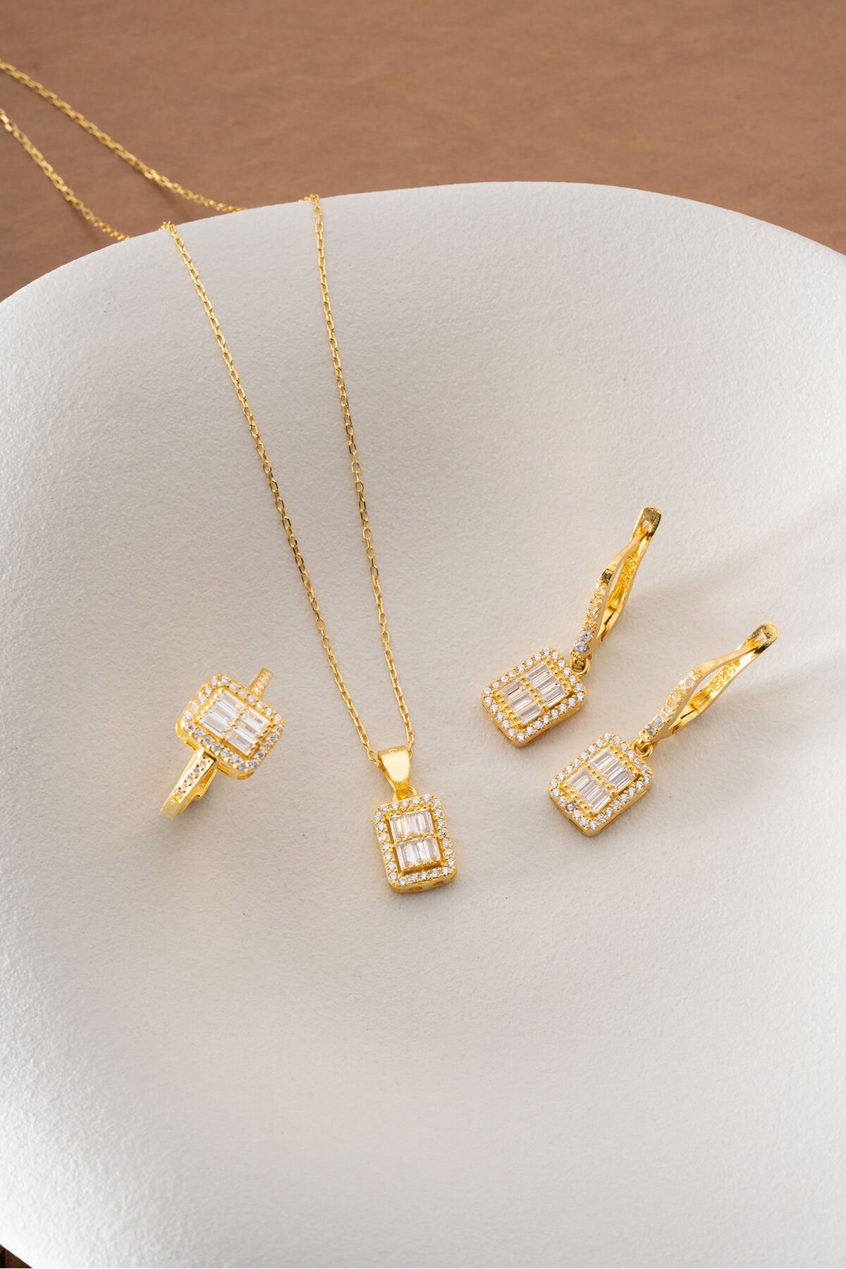 925 Ayar Gümüş Altın Kaplama Yüzük Küpe Kolye Baget Set