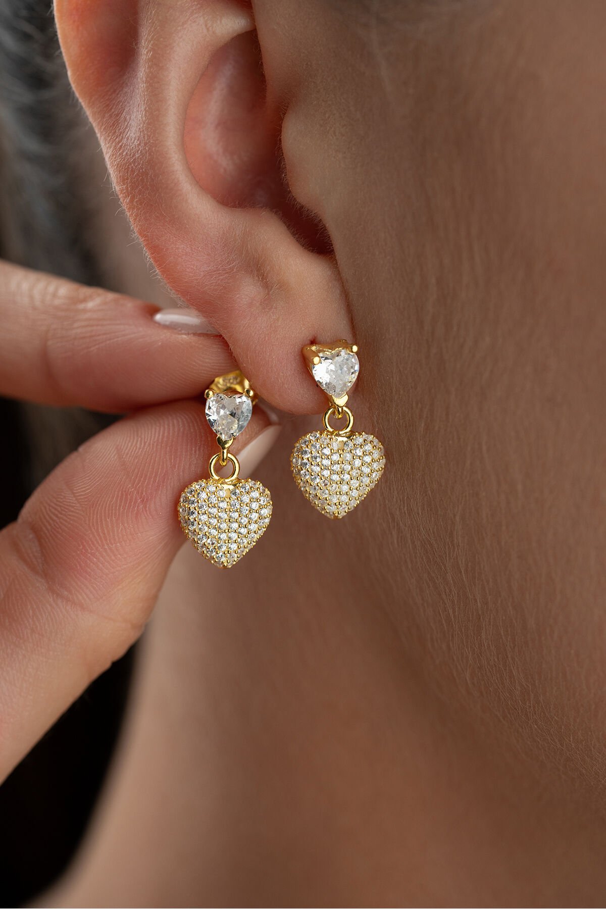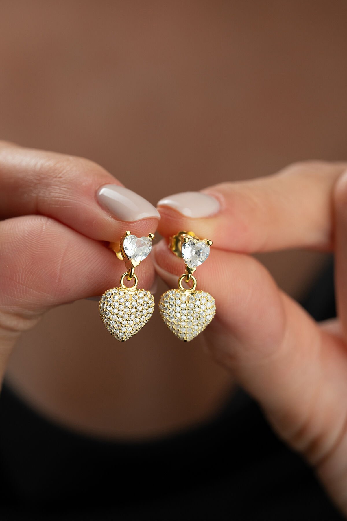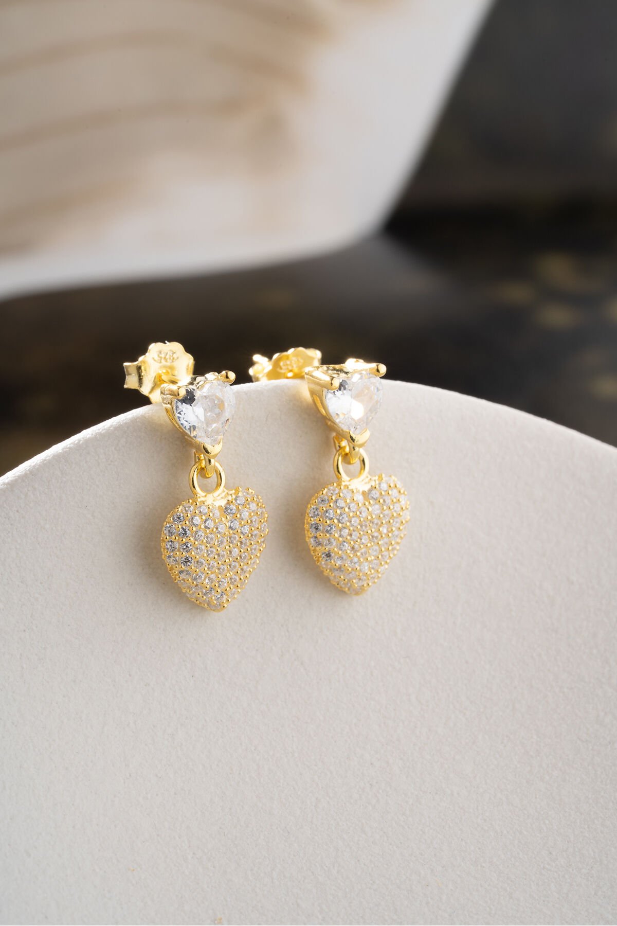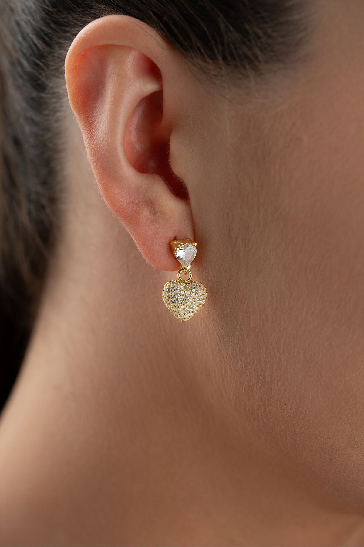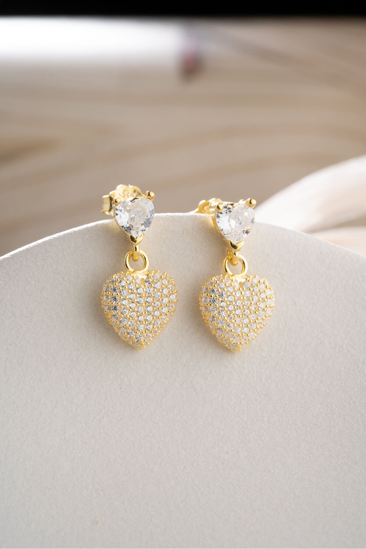 925 Ayar Gümüş Altın Kaplama Zirkon Taşlı Kalp Küpe