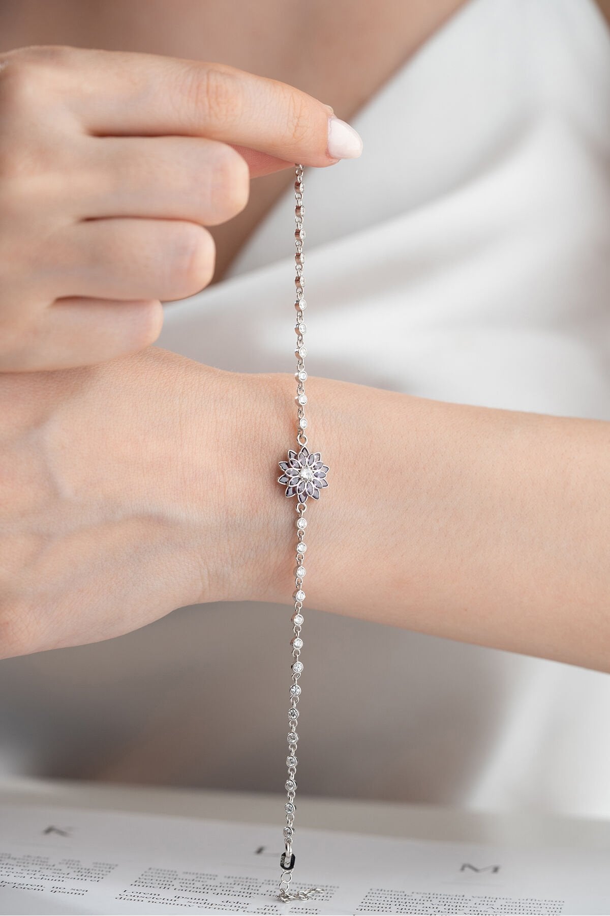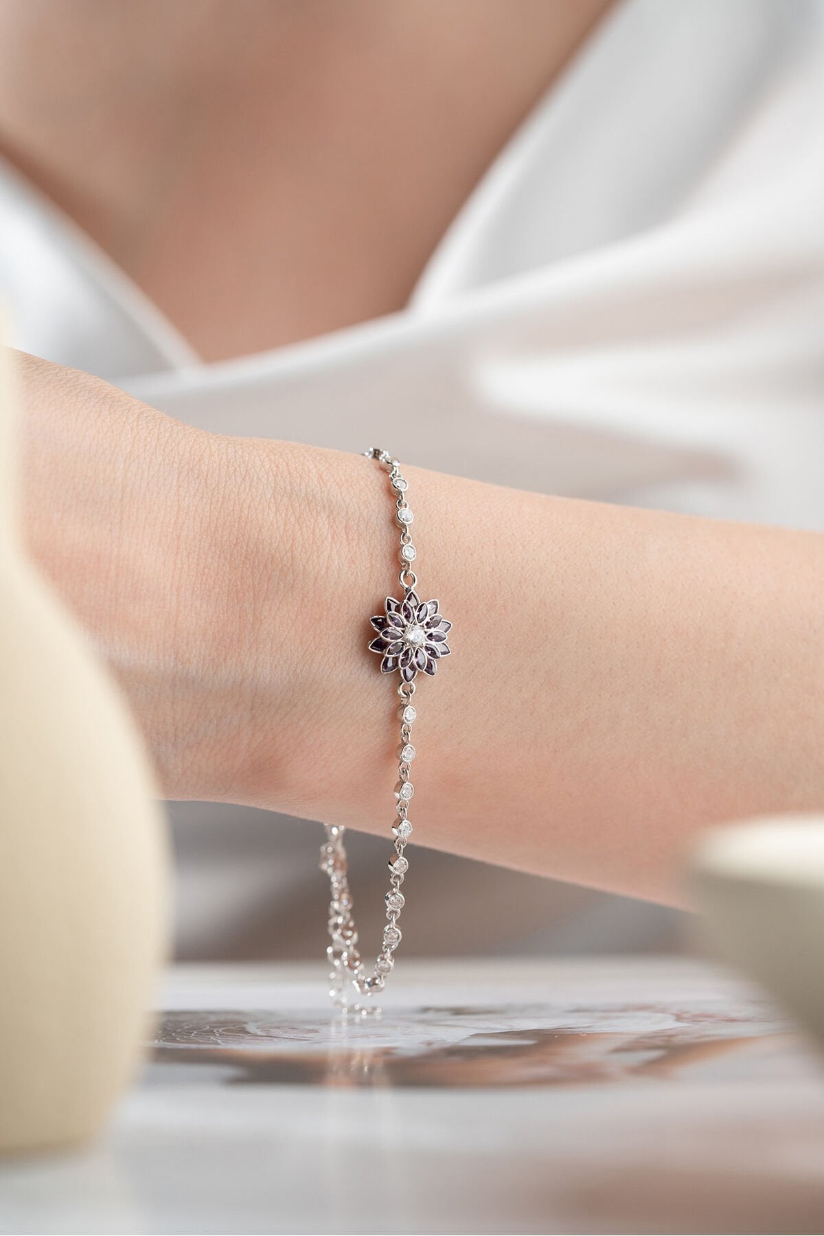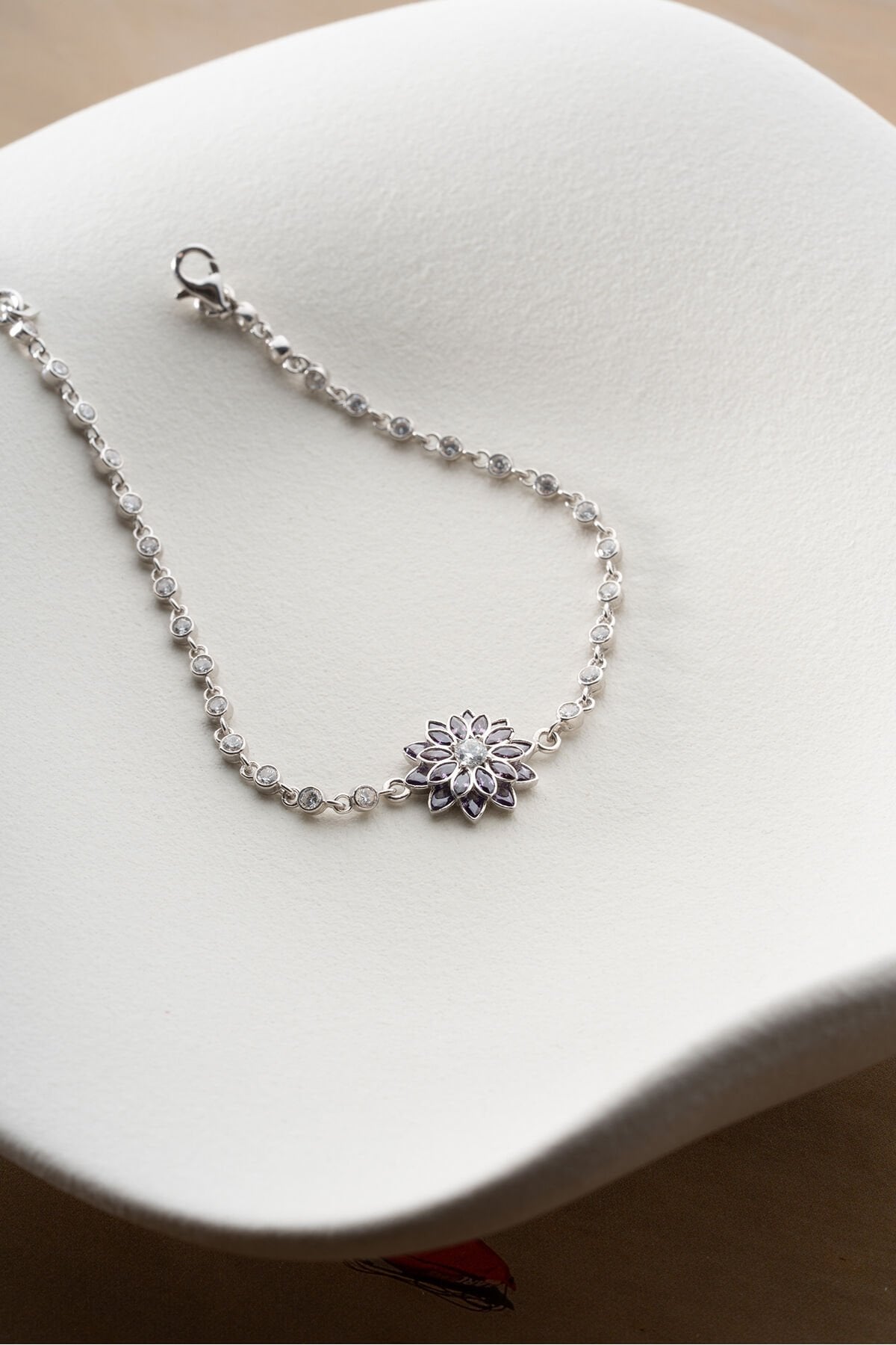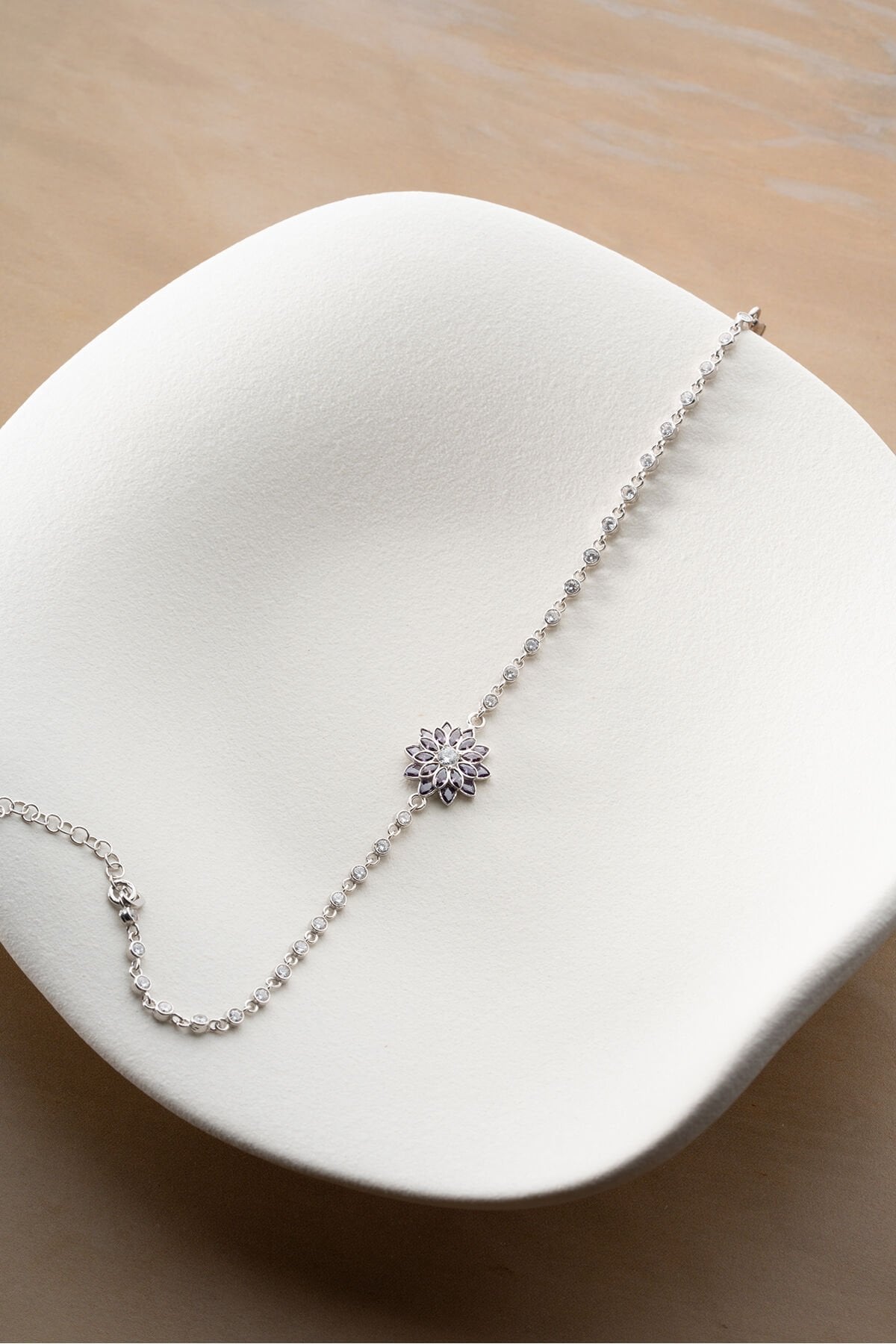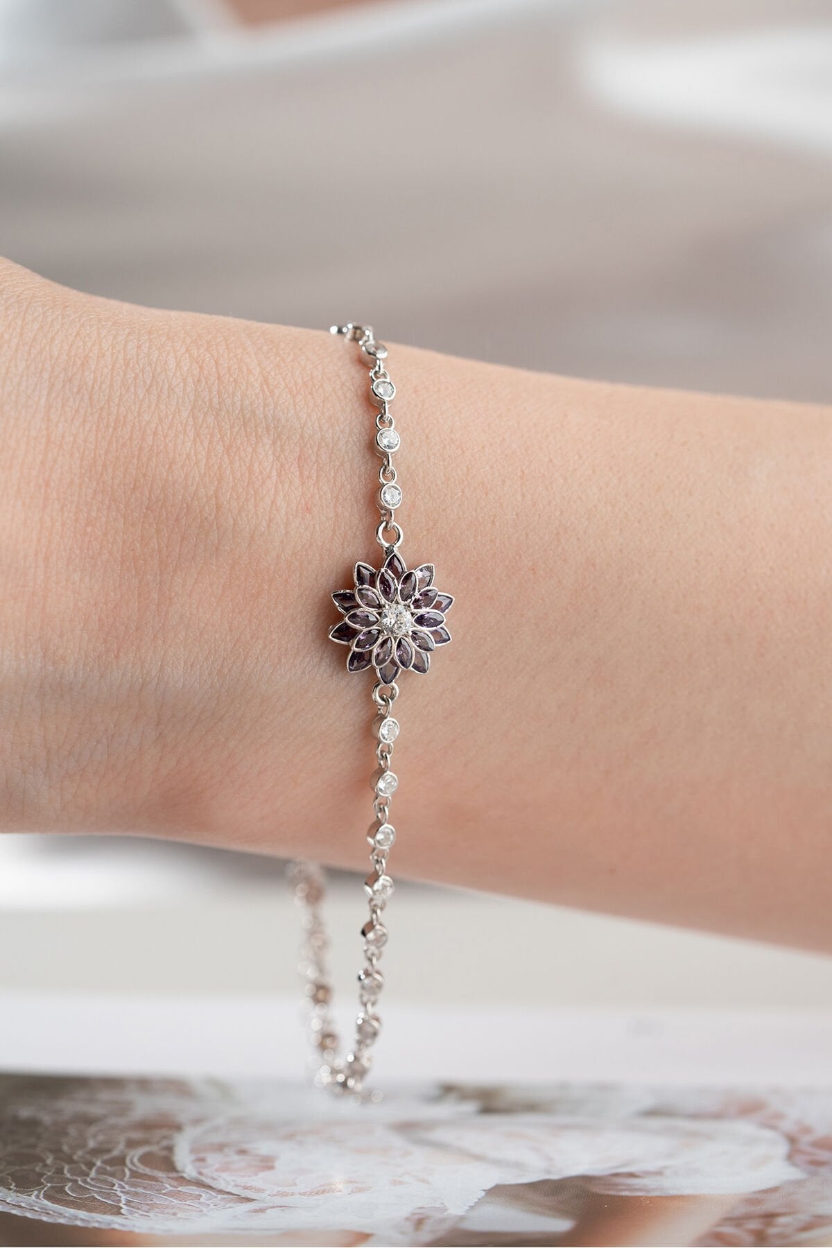 925 Ayar Gümüş Amatist Taşlı Lotus Çiçeği Suyolu Bileklik