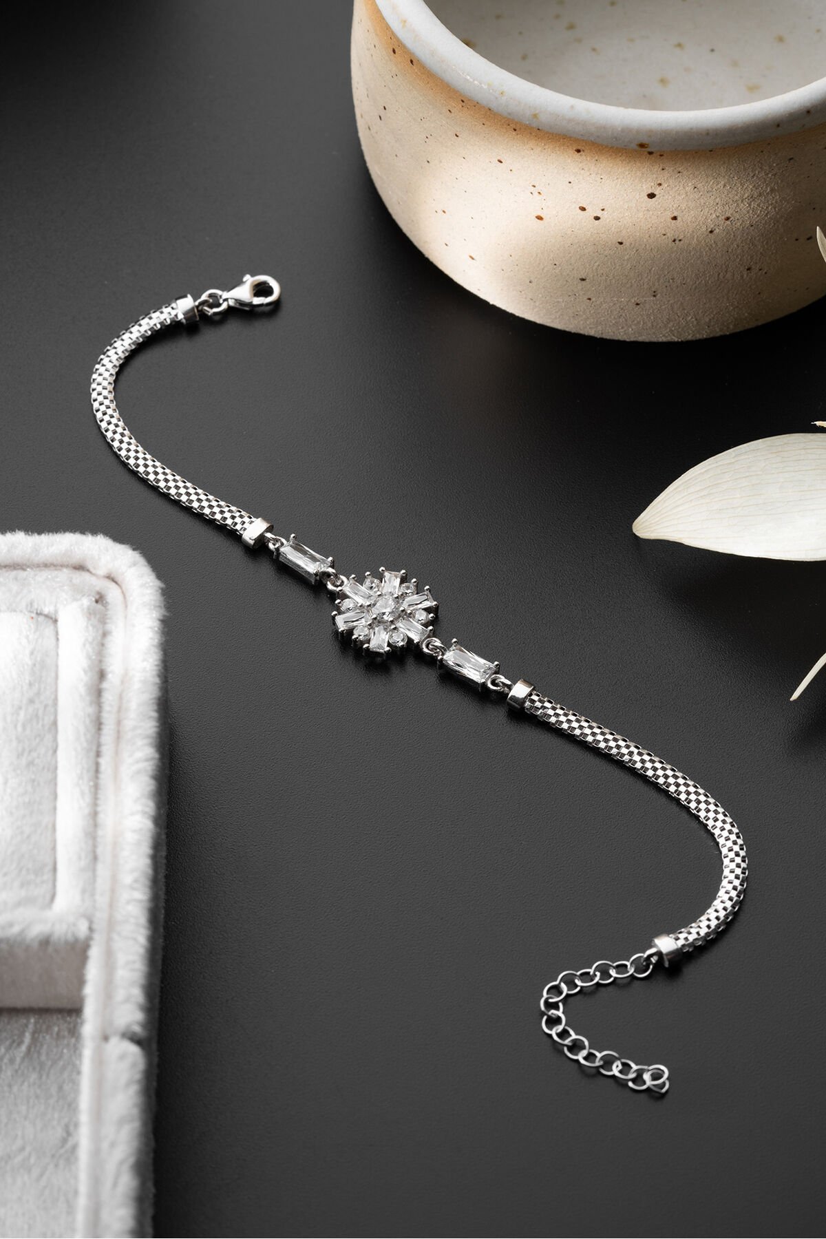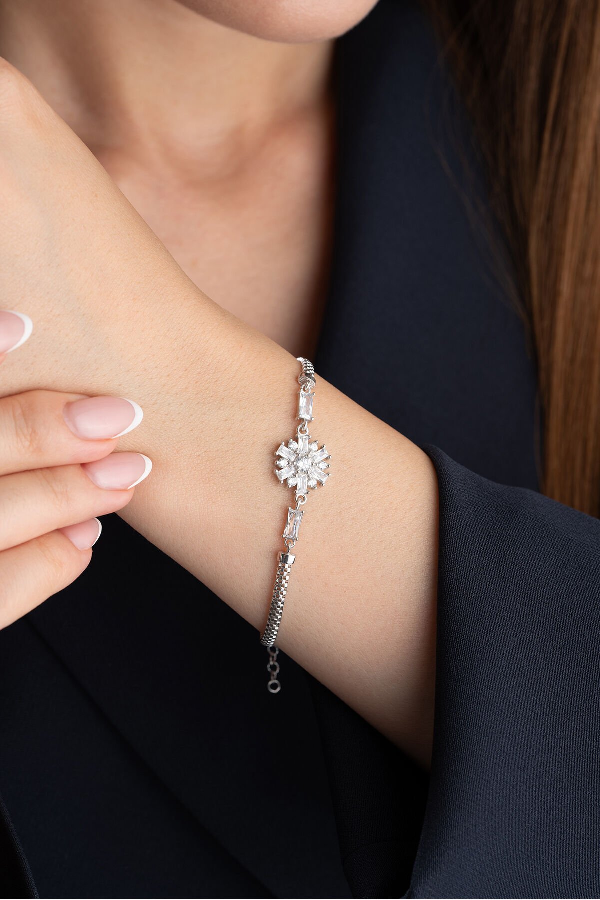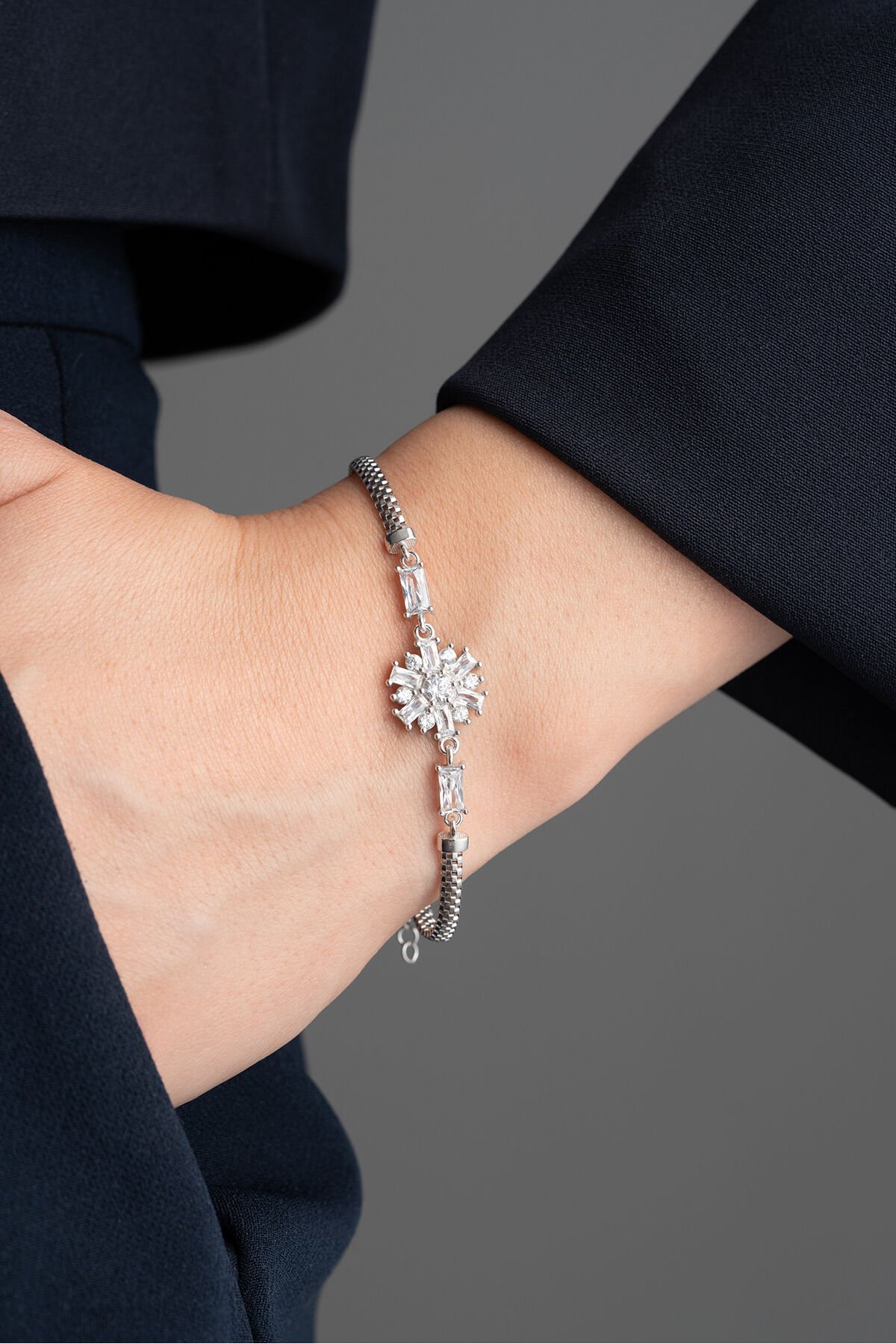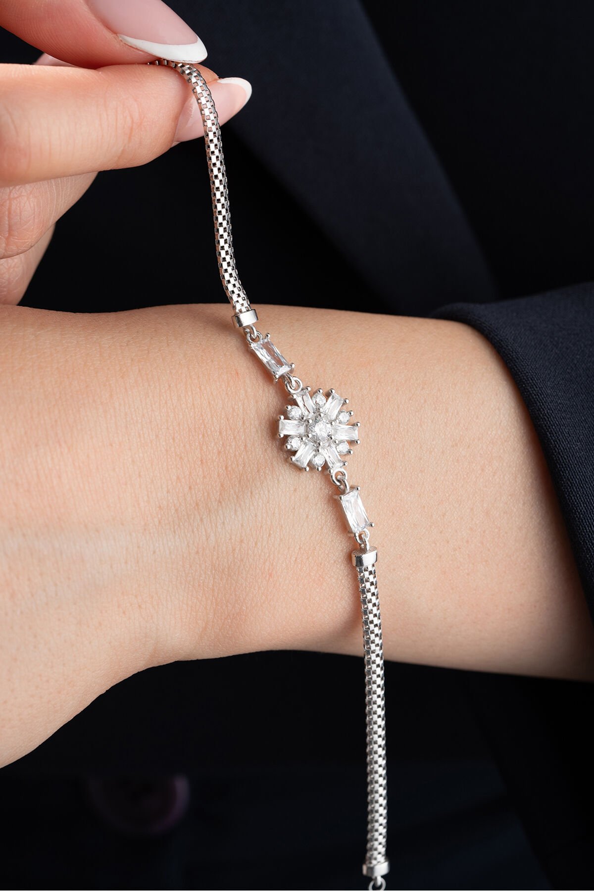 925 ayar gümüş malzeme ile üretilmiş, uzun ömürlü ve kaliteli bir aksesuar deneyimi sunar; Göz alıcı zirkon taşlarla süslenmiş, şıklığınızı tamamlayacak zarif bir tasarıma sahiptir; Gümüş bileşeni sayesinde alerji yapma riski düşük olup, cildinizle uyumlu bir kullanım sağlar;