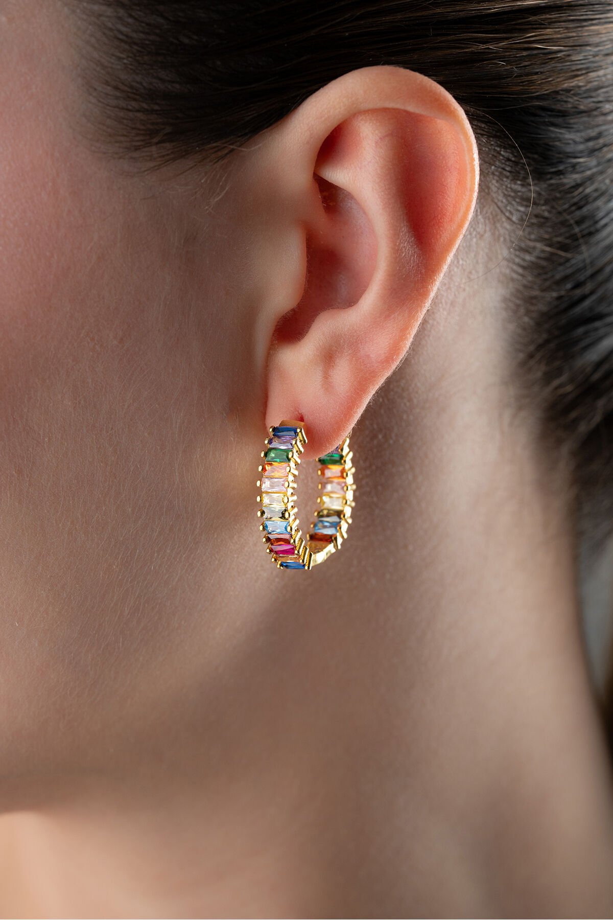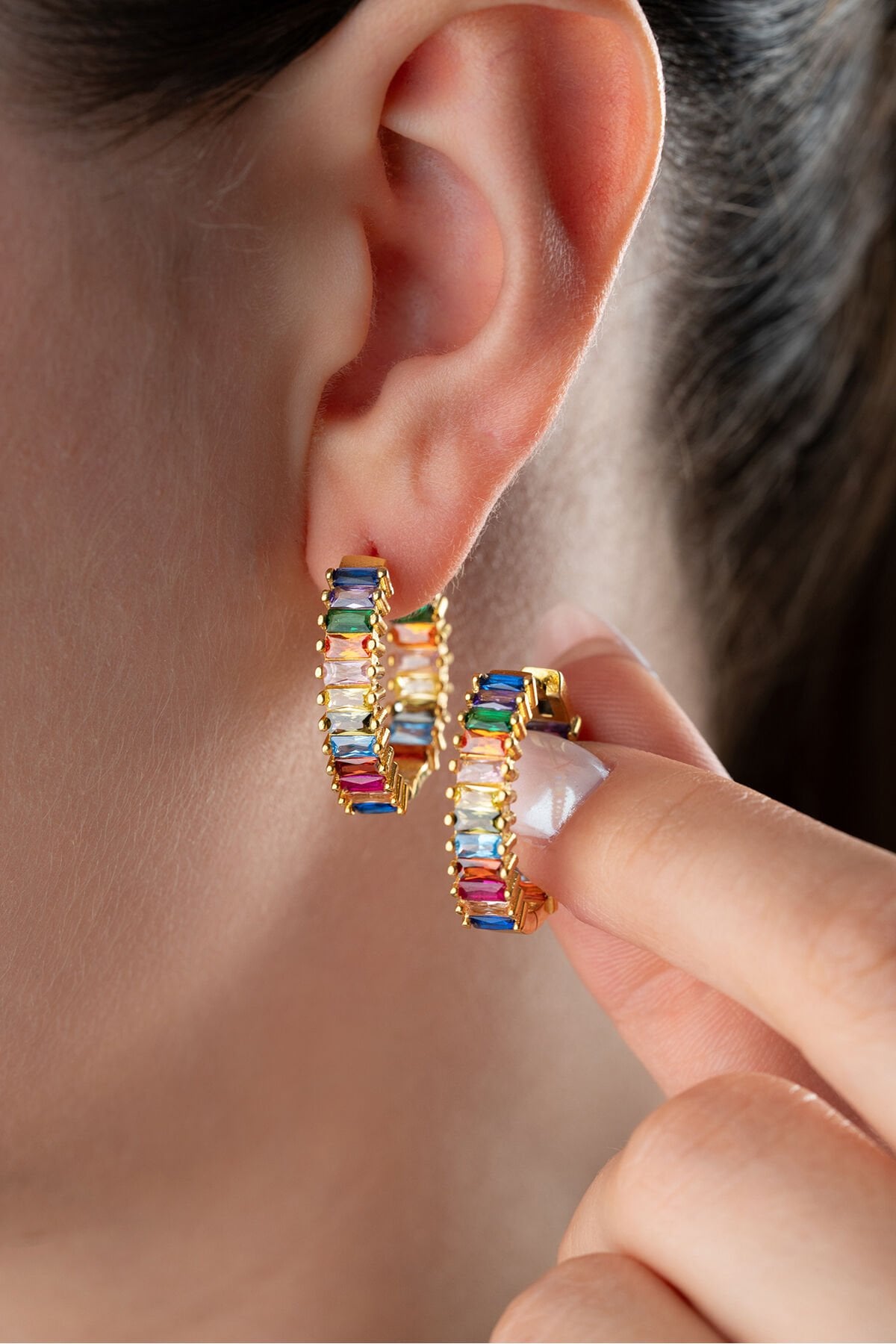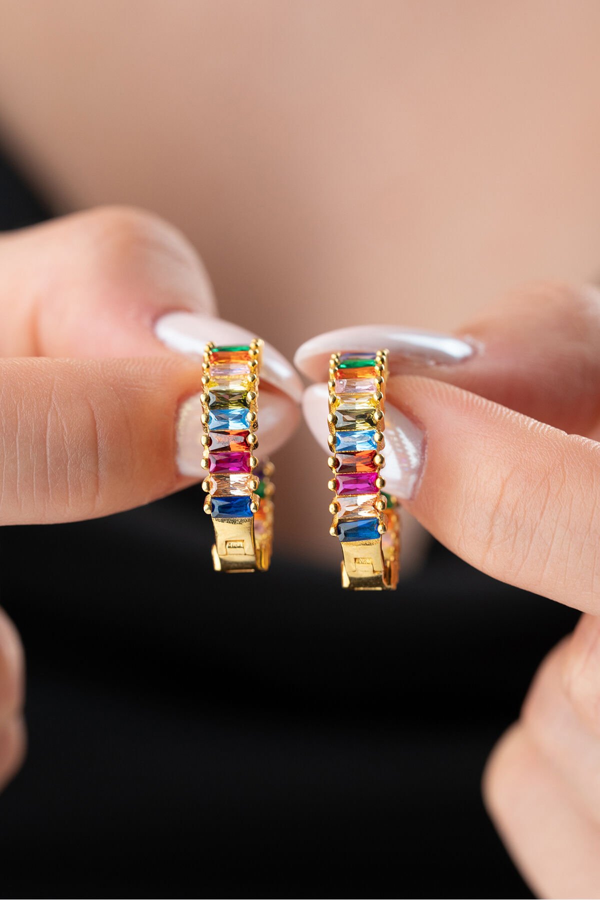 925 Ayar Gümüş Baget Renkli Taşlı Halka Küpe
