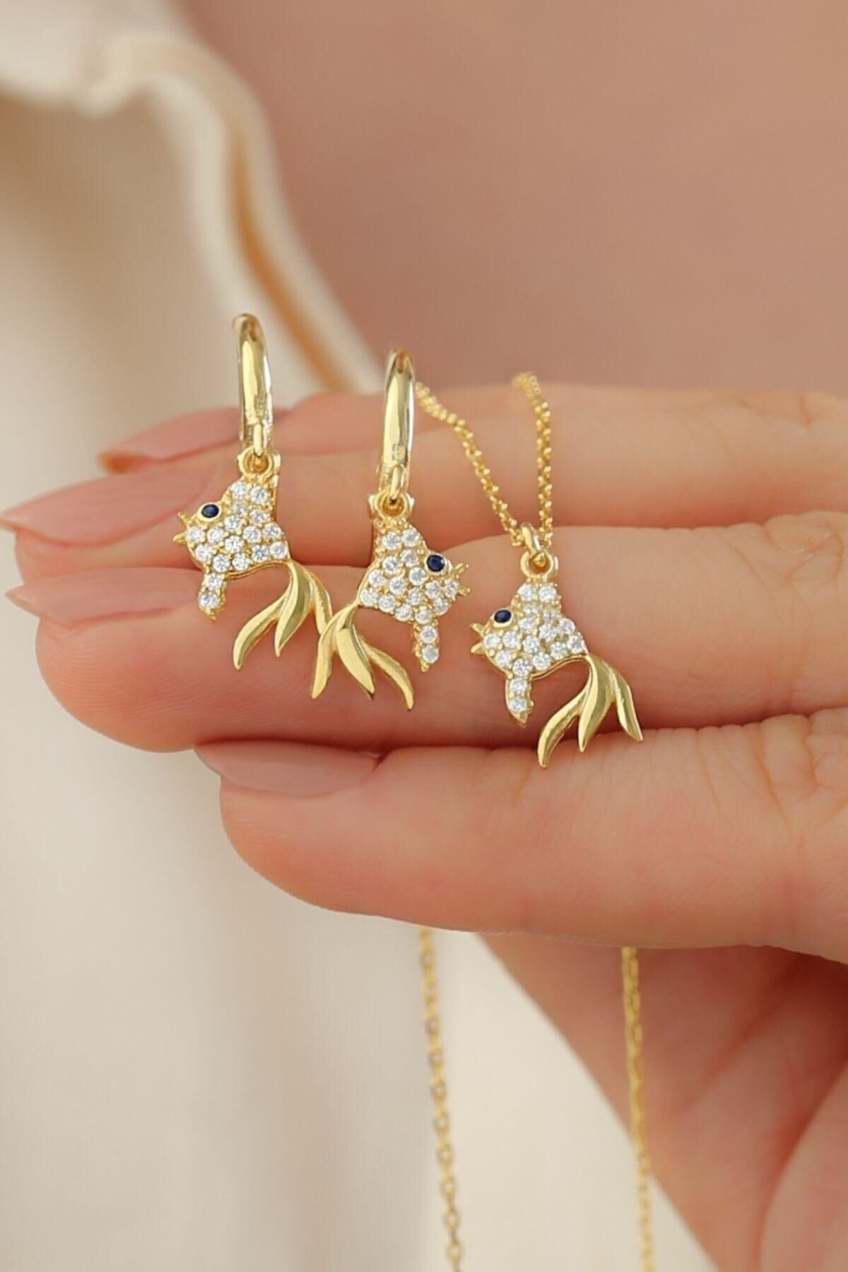 925 Ayar Gümüş Balıklı Kolye Küpe Seti