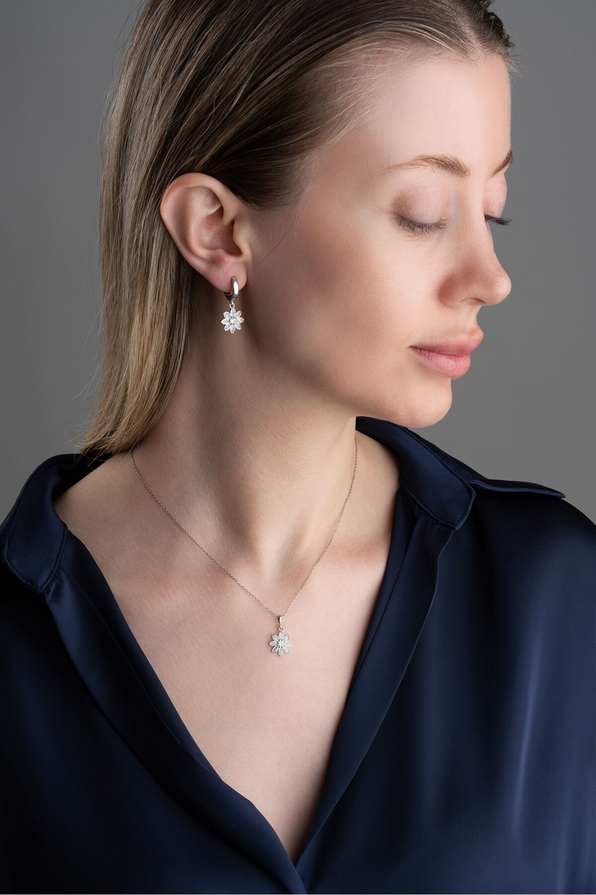 925 Ayar Gümüş Beyaz Taşlı Lotus Takı (Kolye-Küpe) Seti