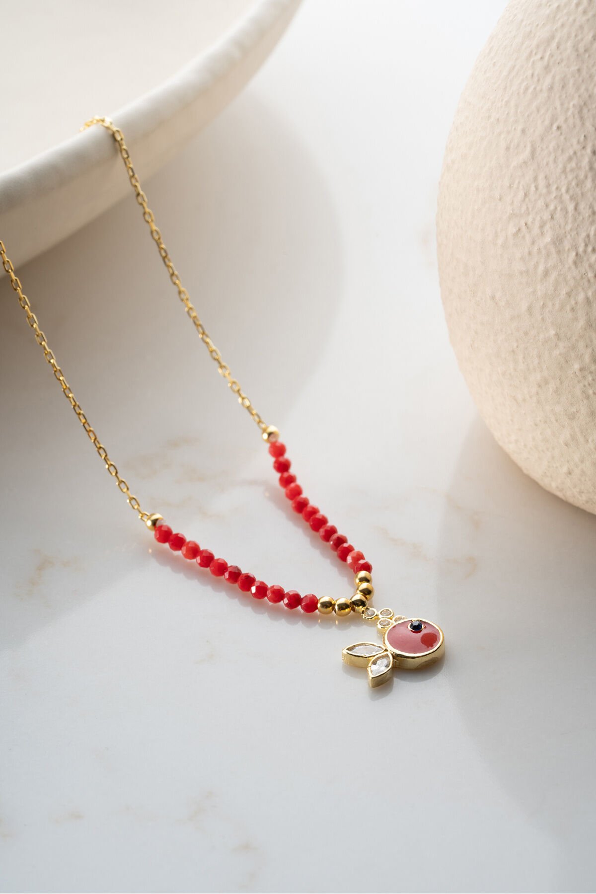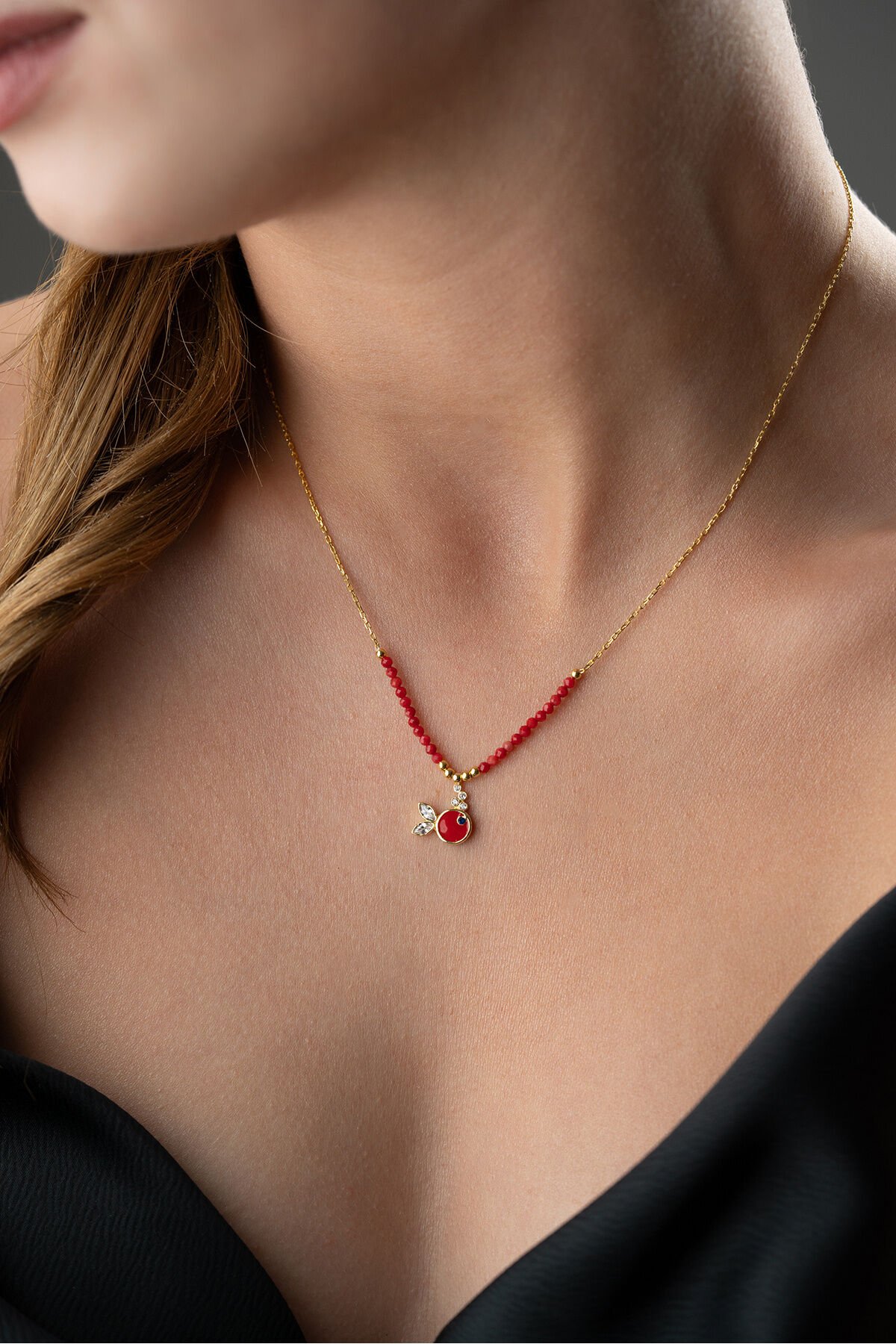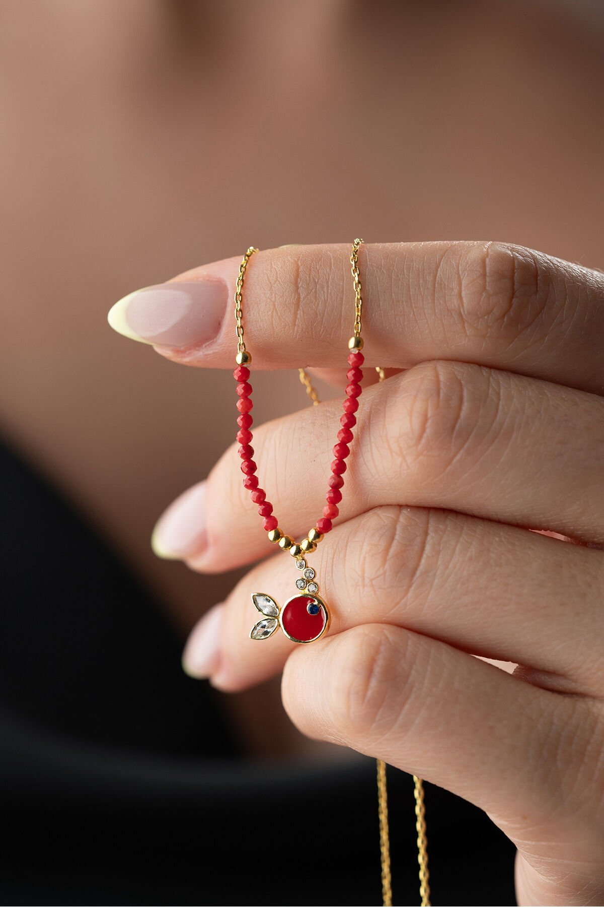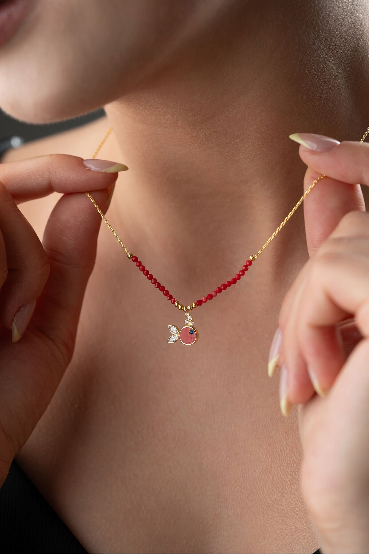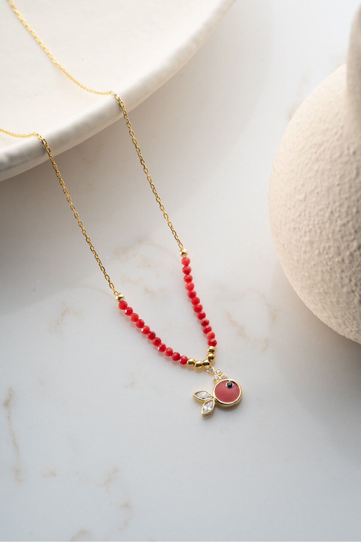 925 Ayar Gümüş Boncuklu Kırmızı Mineli Balık Kolye