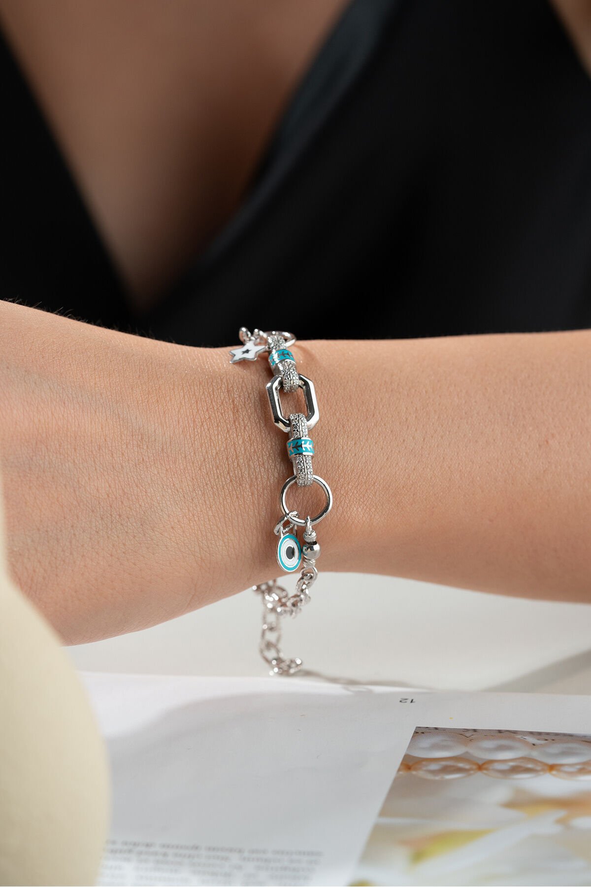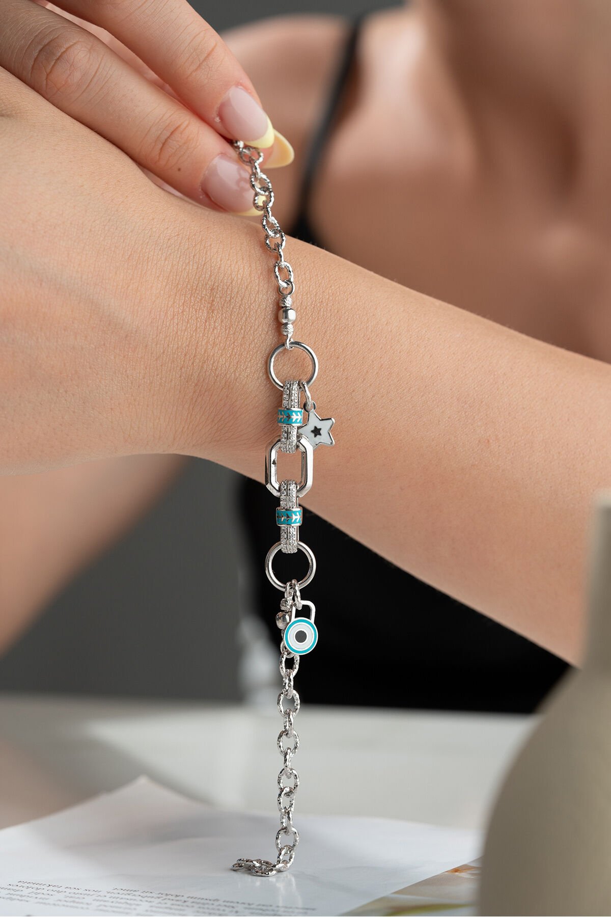 ; 925 Ayar Gümüş bileklik ; Zarif ve ince tasarımı ile her kombine uyum sağlayan bu kolye, günlük kullanım için idealdir.; - Malzeme: 925 ayar gümüş - Boy: 42 cm (idealdir ve rahat bir kullanım sunar) - Özellikler: Hafif ve zarif yapısı ile boynunuza doğal bir ışıltı katar.; 925 Ayar Gümüş Bilekliğimiz Sade ama şık tasarımı ile bileğinize ince bir dokunuş katın.; Günlük ve özel günlerde rahatça kullanabilirsiniz.; - Malzeme: 925 ayar gümüş - Boy: Ayarlanabilir (17 cm - 20 cm arası) - Özellikler: Dayanıklı yapısı ile uzun ömürlü kullanım sağlar, hafif ve rahattır.; Tabii, işte kısa ve anlaşılır bir şekilde 925 ayar gümüş takıların saklama ve kullanma koşulları: 925 Ayar Gümüş Takıların Saklama Koşulları: - Kuru ve serin yerde saklayın: Gümüş takılar nemden uzak tutulmalıdır.; Nem, gümüşün kararmasına neden olabilir.; - Kapalı kutuda muhafaza edin: Takılarınızı hava almayan mücevher kutusunda veya kumaş keselerde saklayarak oksitlenmeyi önleyebilirsiniz.; - Diğer takılarla temas ettirmeyin: Çizilmeleri önlemek için gümüş takılarınızı diğer takılardan ayrı tutun.; 925 Ayar Gümüş Takıların Kullanma Koşulları: - Su ve kimyasallardan uzak tutun: Gümüş takılarınızı parfüm, krem, saç spreyi gibi kimyasallarla temas ettirmeyin ve suya maruz bırakmayın.; - Düzenli temizleyin: Yumuşak bir bezle düzenli olarak temizleyerek parlaklığını koruyun.; - Uyurken ve spor yaparken çıkartın: Takılarınızı zarar görmemesi için uyurken, spor yaparken veya yoğun fiziksel aktivitelerde çıkarın.; Bu basit kurallar, gümüş takılarınızın uzun ömürlü ve parlak kalmasını sağlayacaktır.; ;