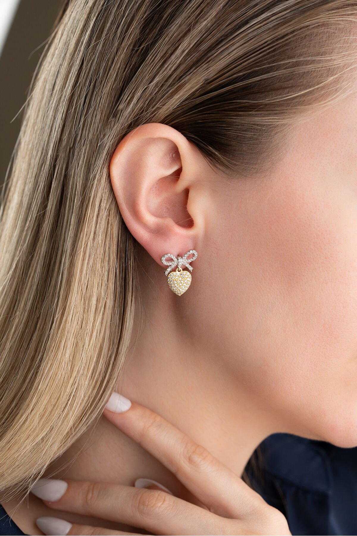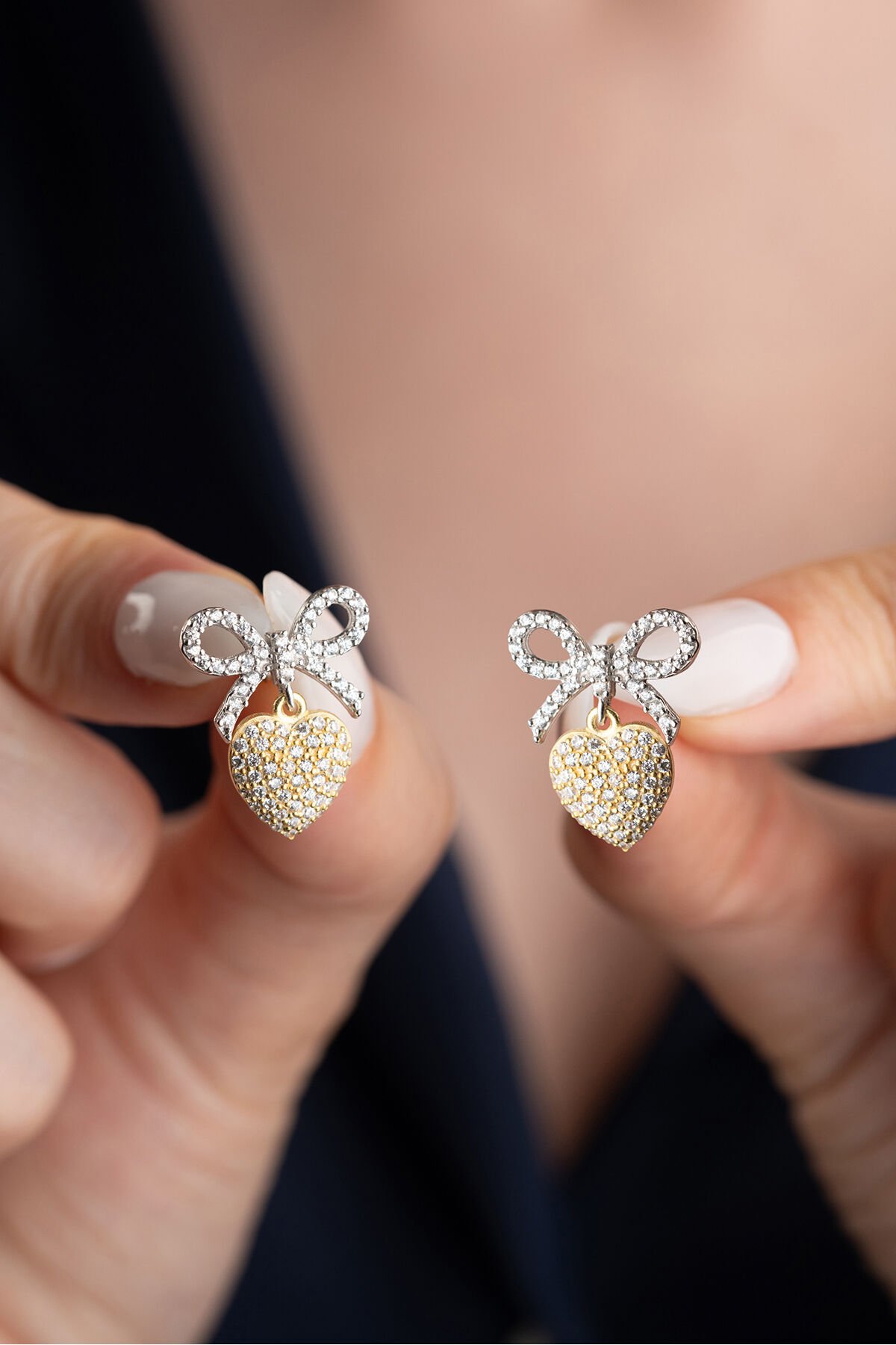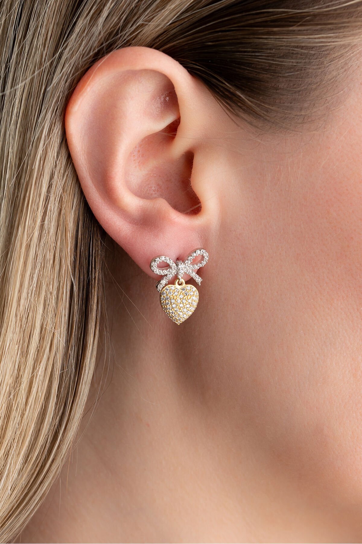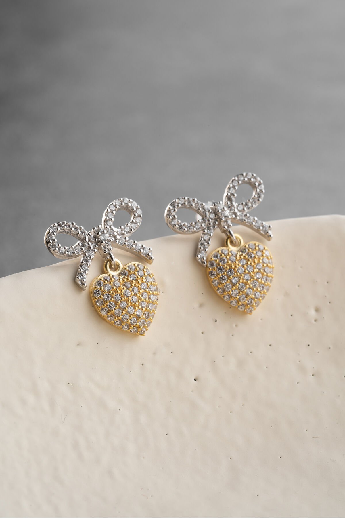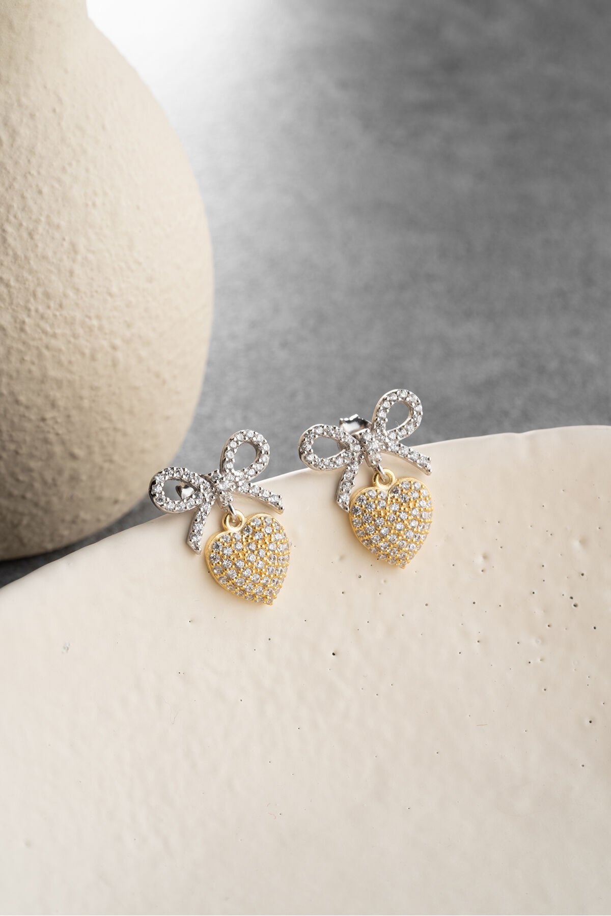 925 Ayar Gümüş Çift Renk Fiyonklu Kalp Küpe