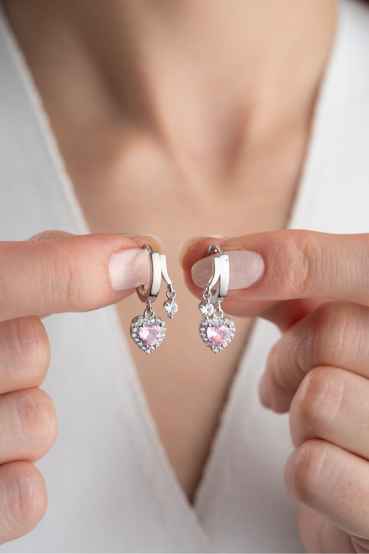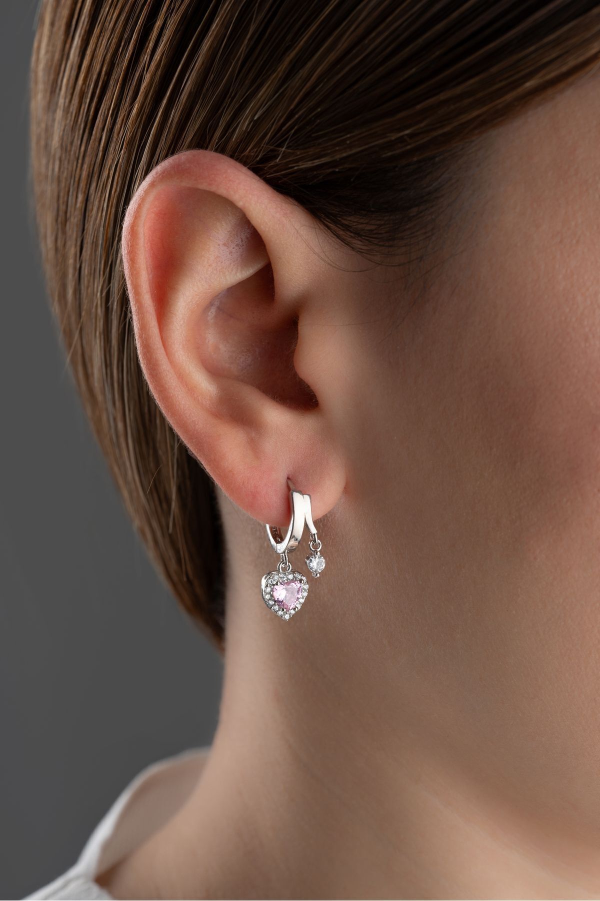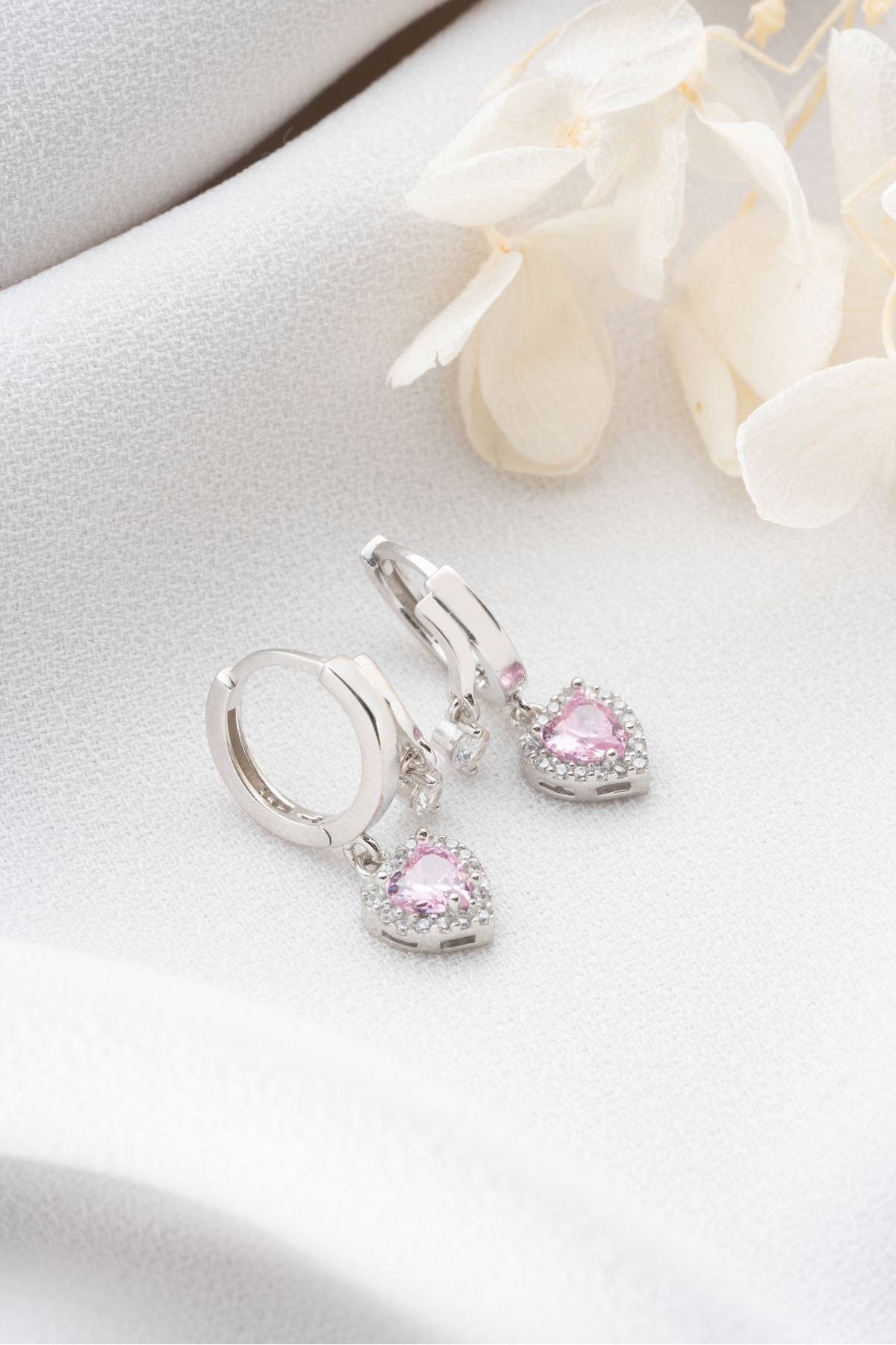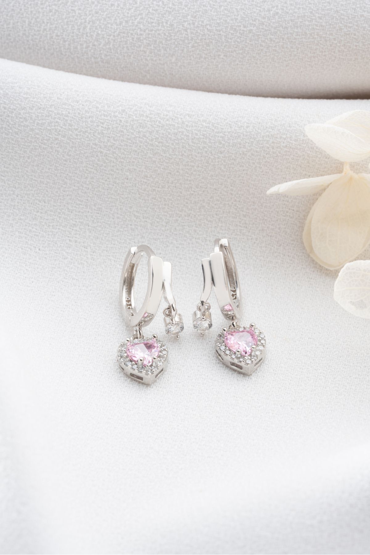 925 Ayar Gümüş Çift Taşlı Pembe Kalp Küpe