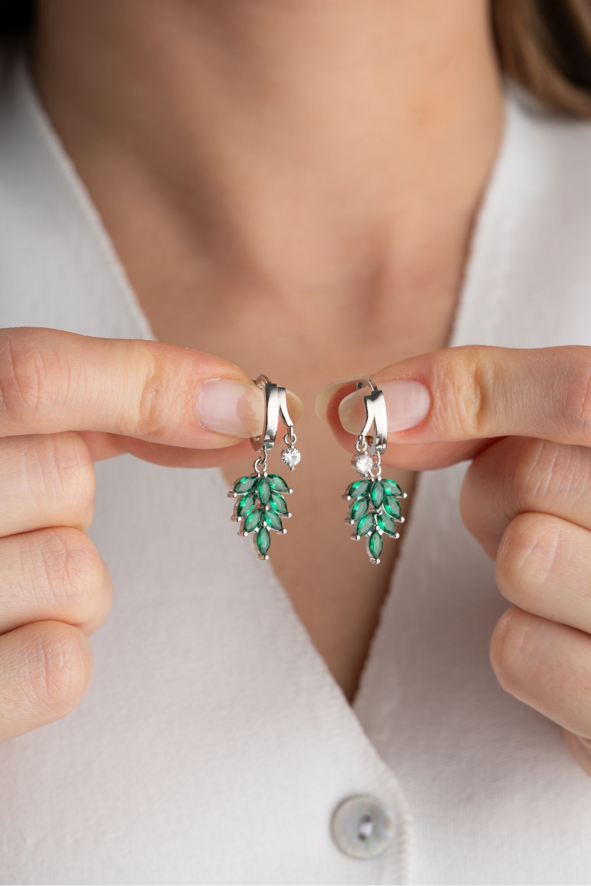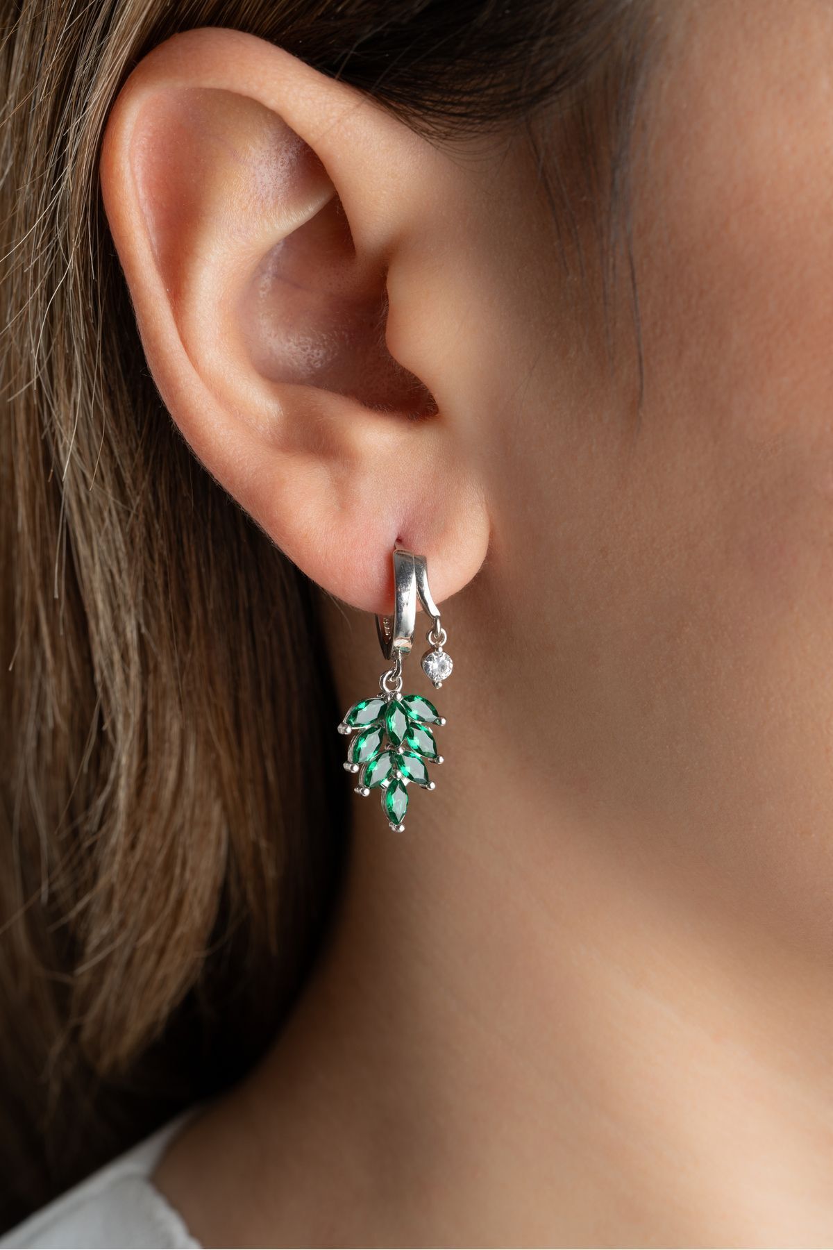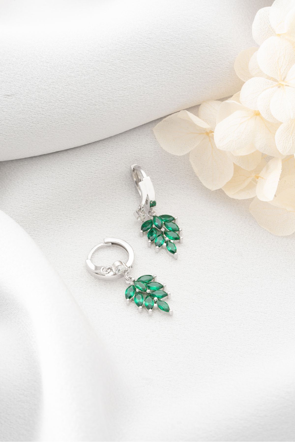 925 Ayar Gümüş Çift Taşlı Zümrüt Yeşili Yaprak Küpe