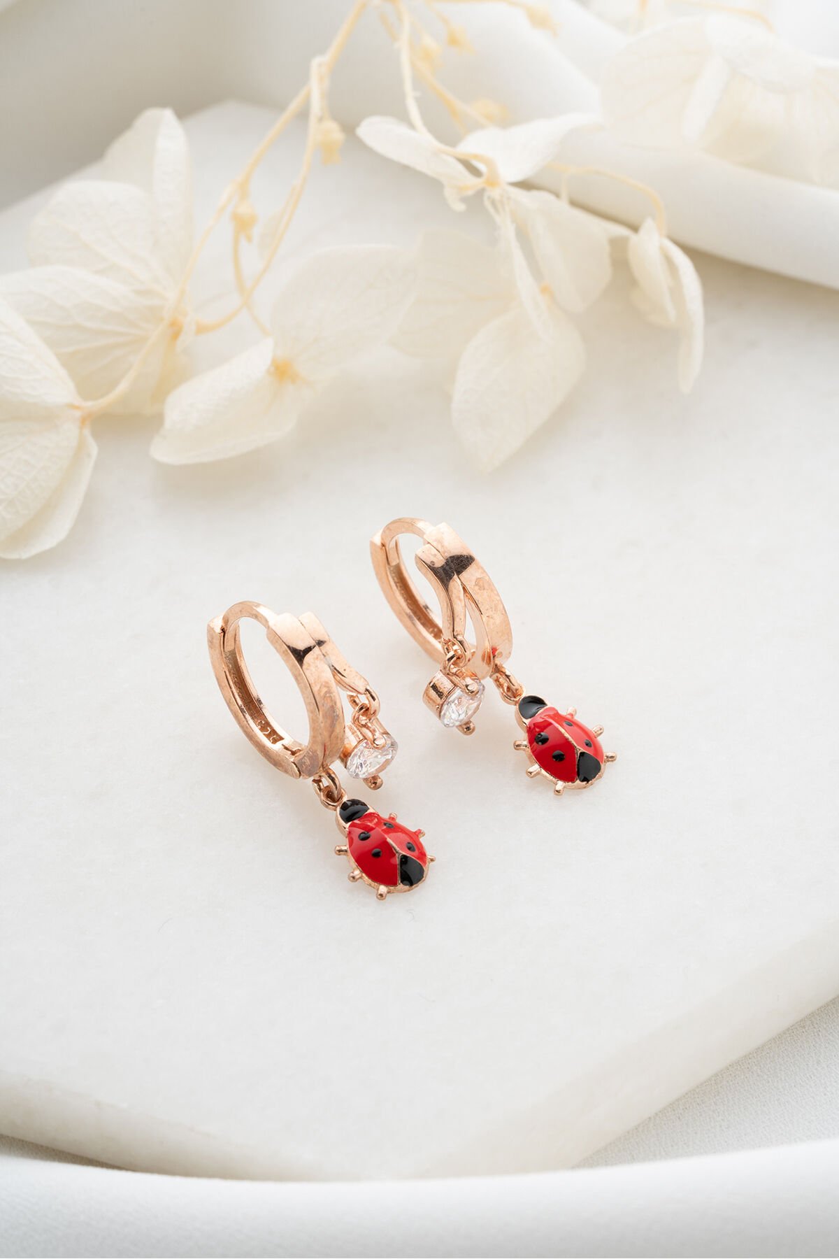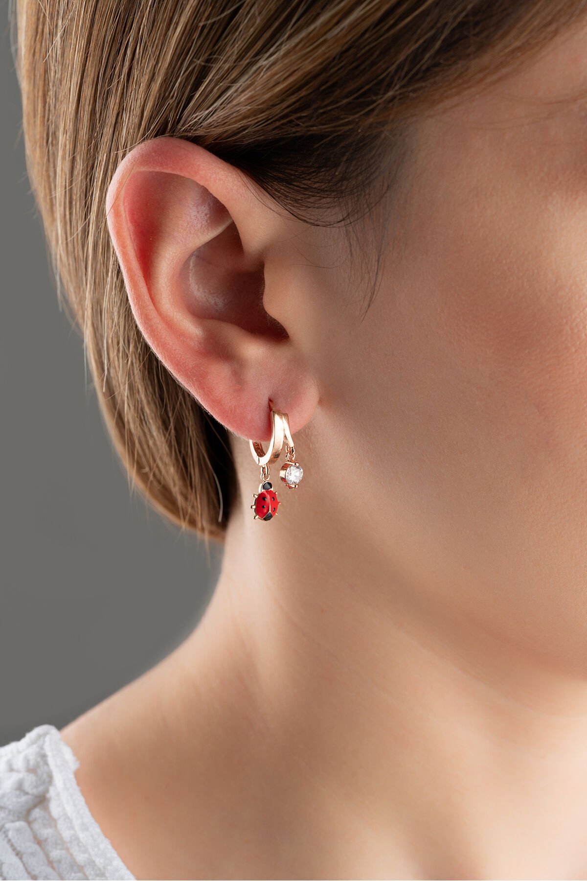 925 Ayar Gümüş Çift Uğur Böcekli Taşlı Küpe