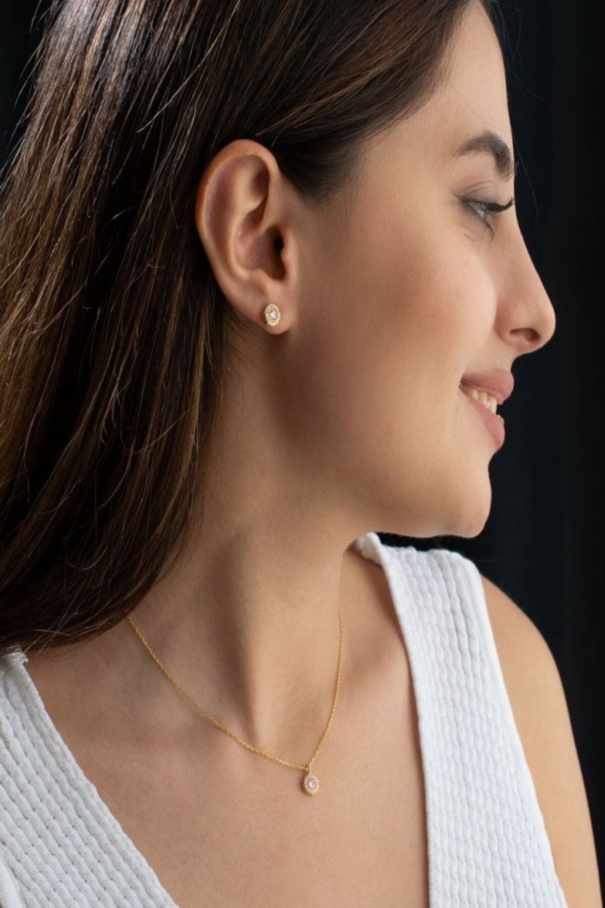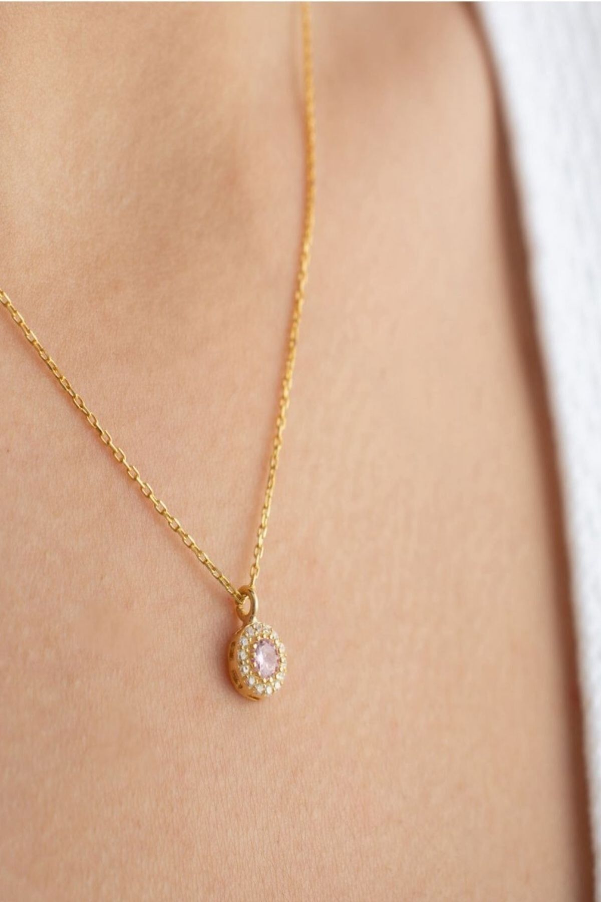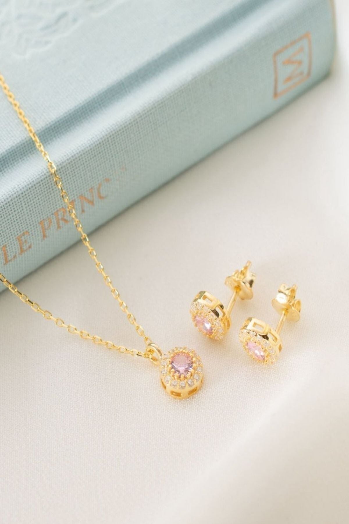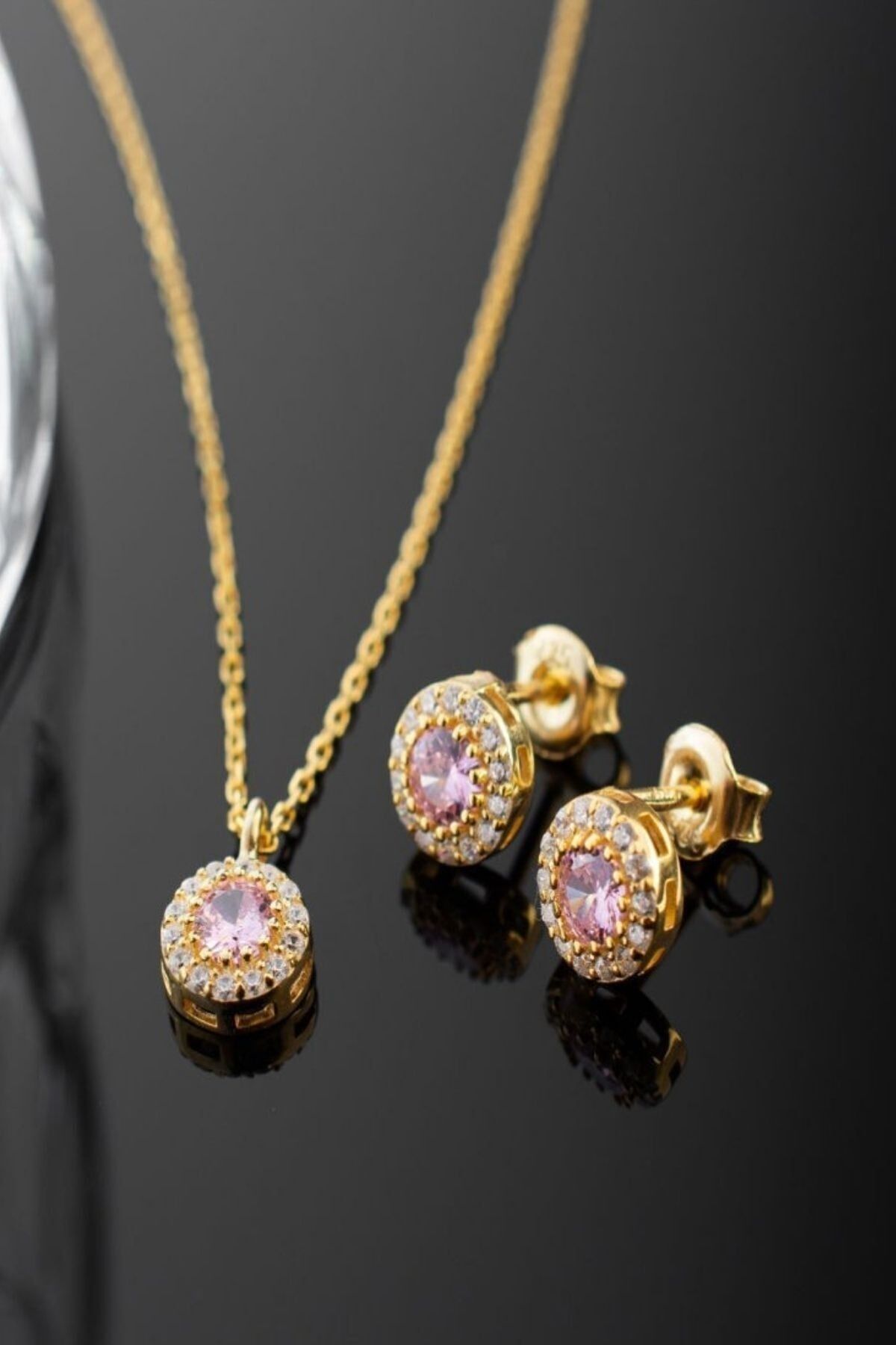 925 Ayar Gümüş Ekim Ayı Doğum Taşı ( Pink Tourmaline ) Kolye - Küpe Seti