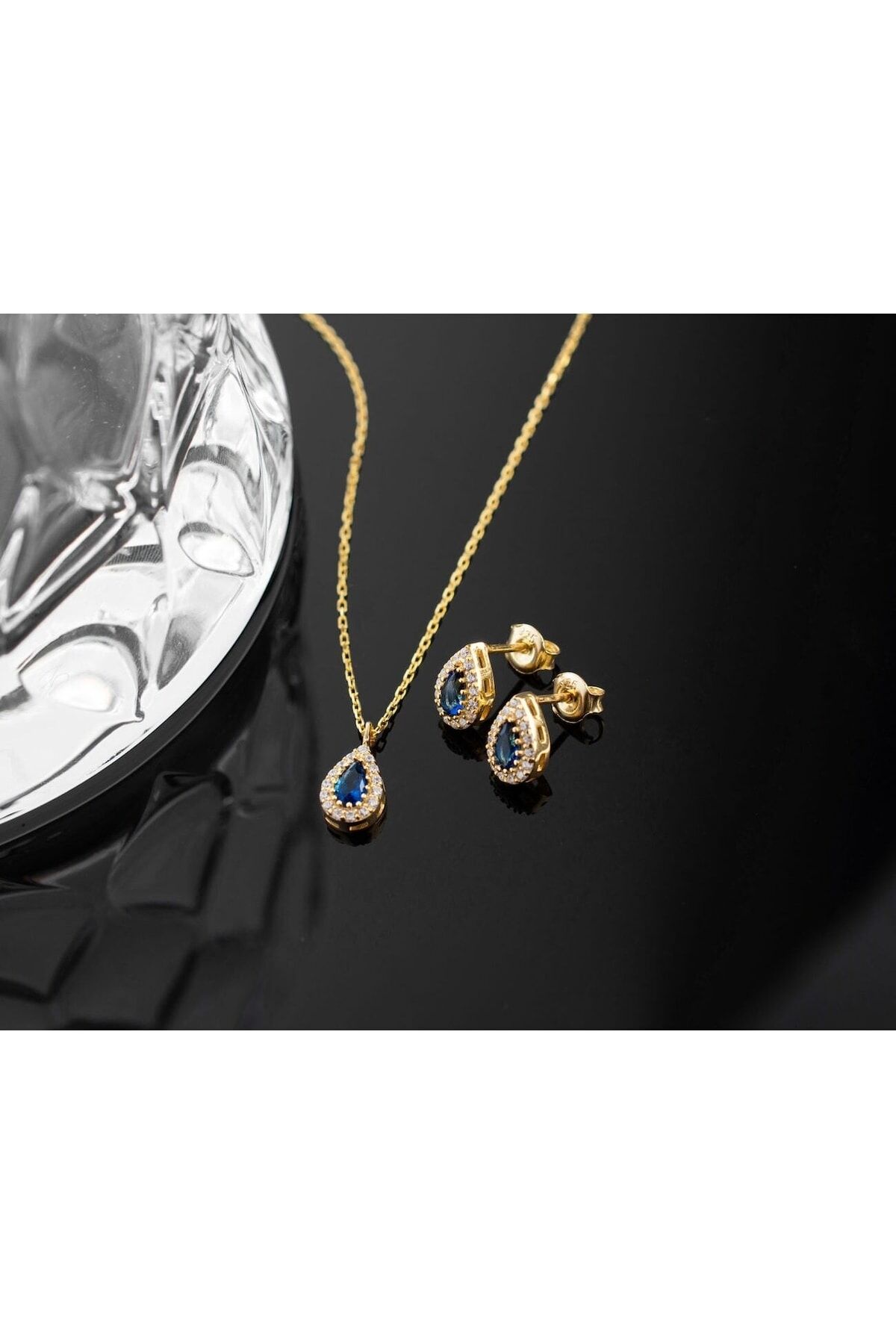 925 Ayar Gümüş Eylül Ayı Doğum Taşı ( Sapphire ) Kolye - Küpe Seti