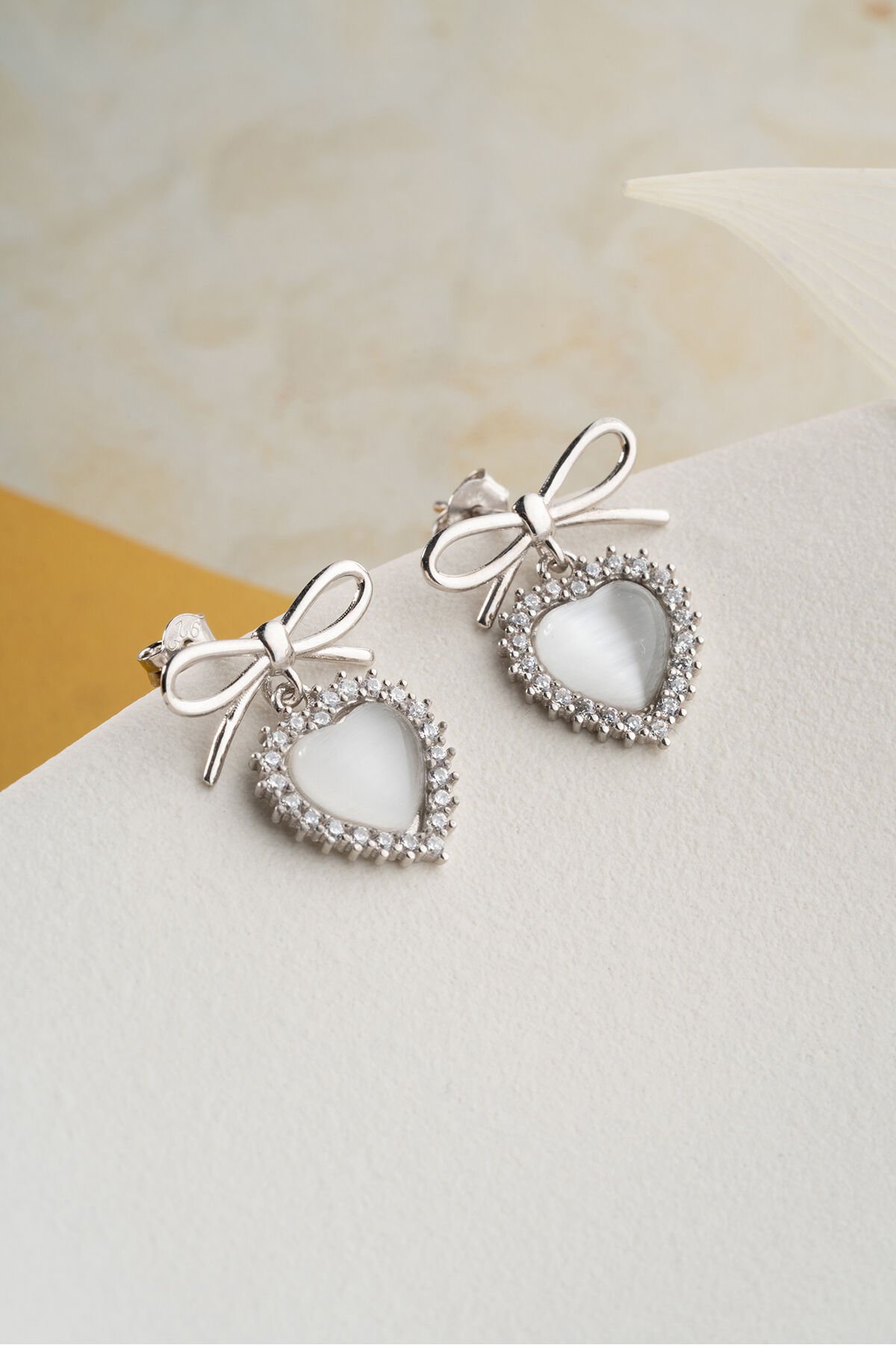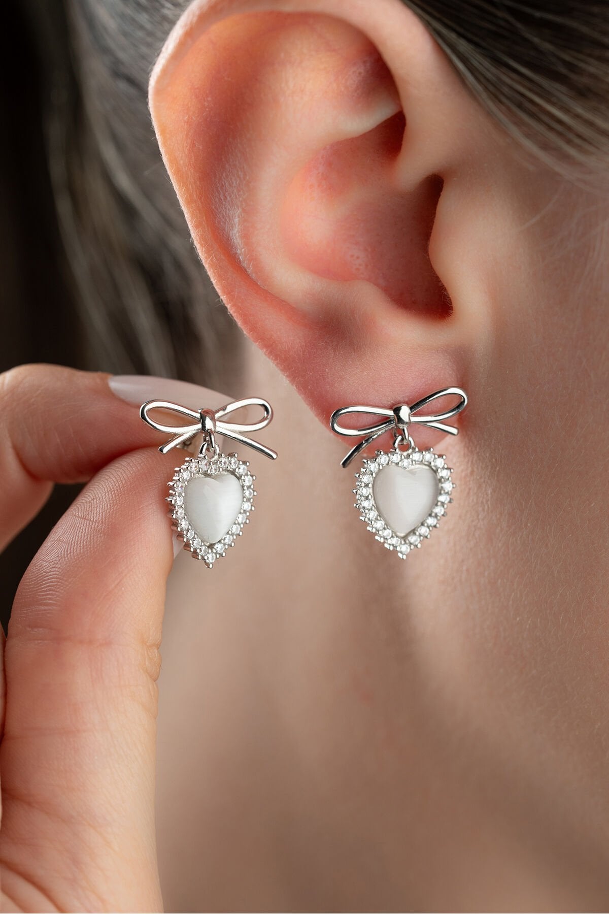 925 Ayar Gümüş Fiyonklu Beyaz Kalp Küpe