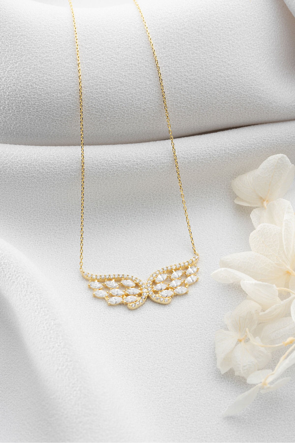 925 Ayar Gümüş Gold Baget Taşlı Kanat Kolye