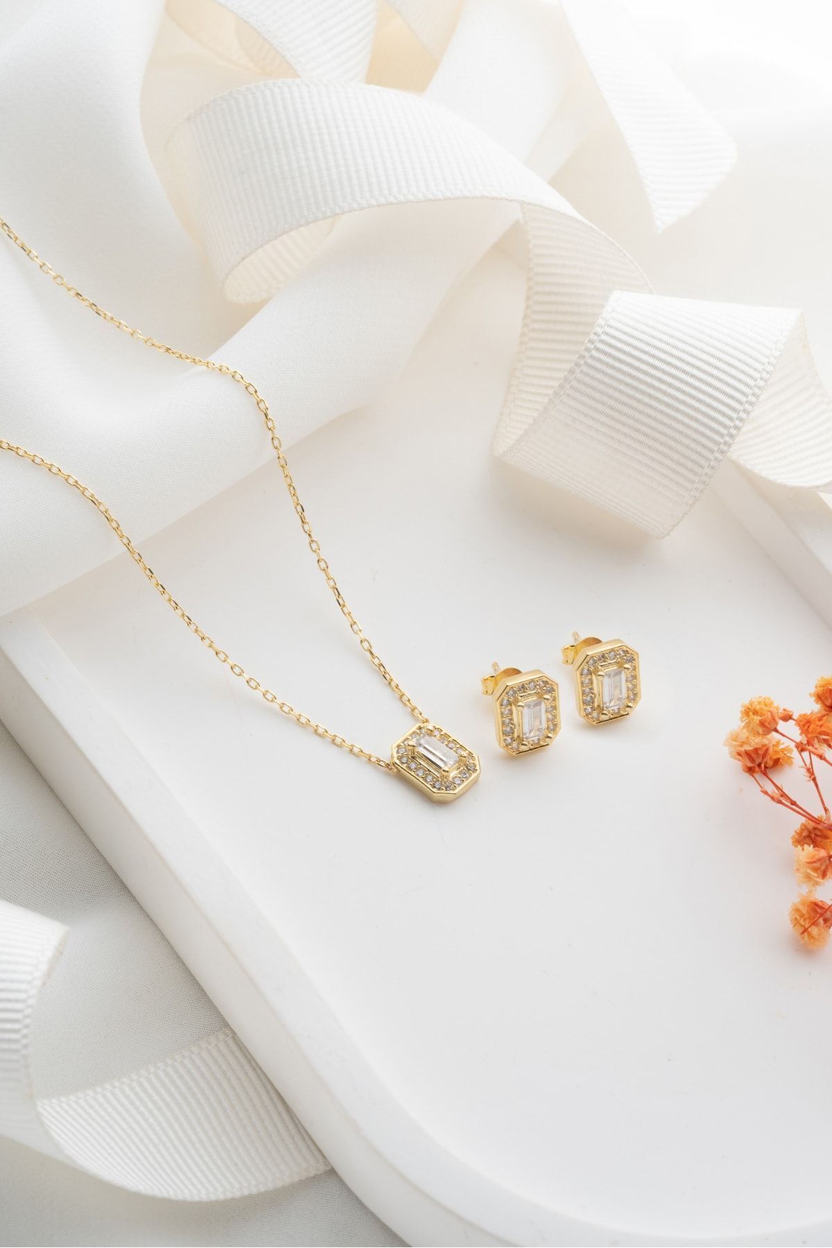 925 Ayar Gümüş Gold Baget Zirkon Taşlı Kolye Küpe Seti