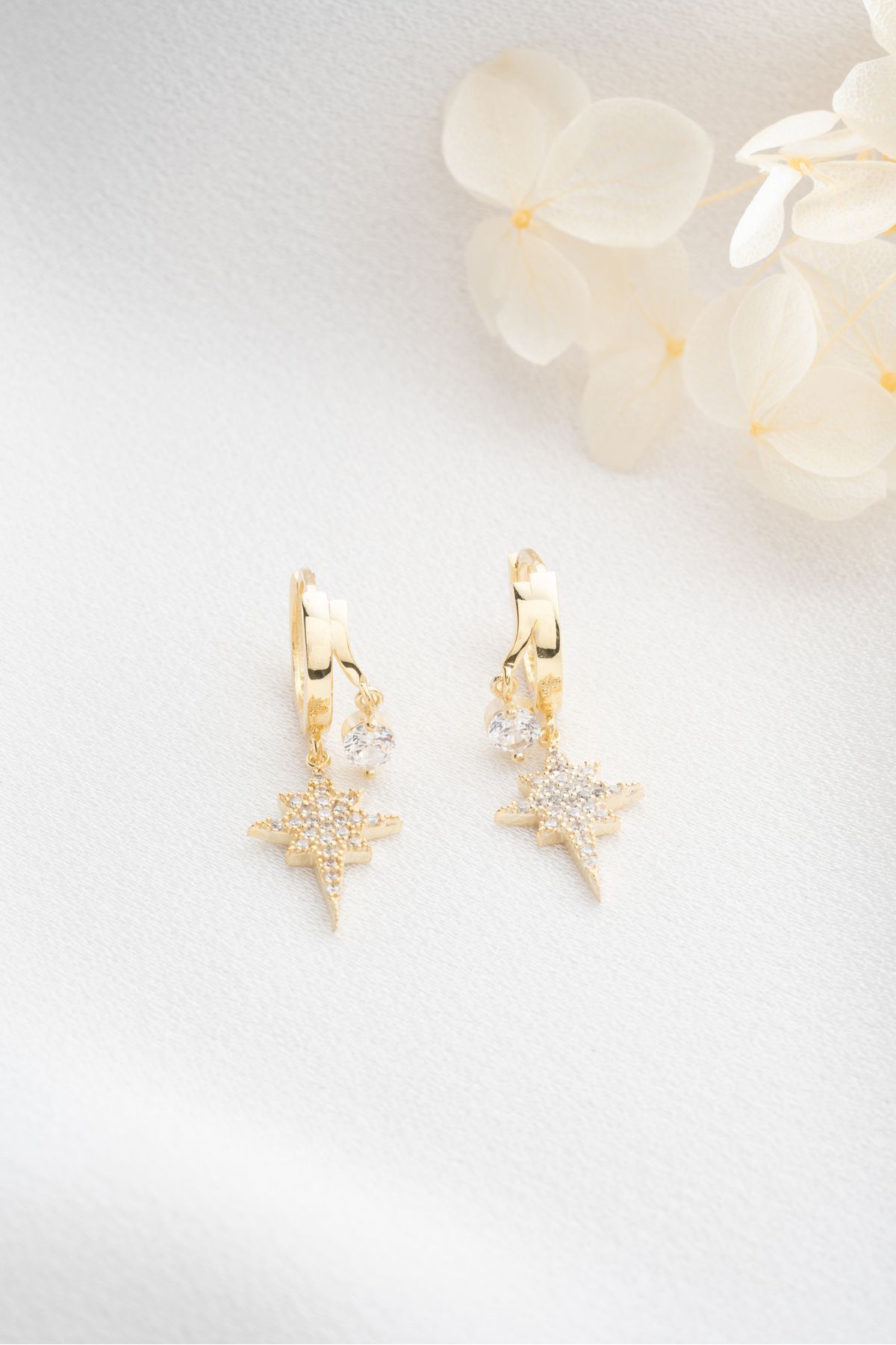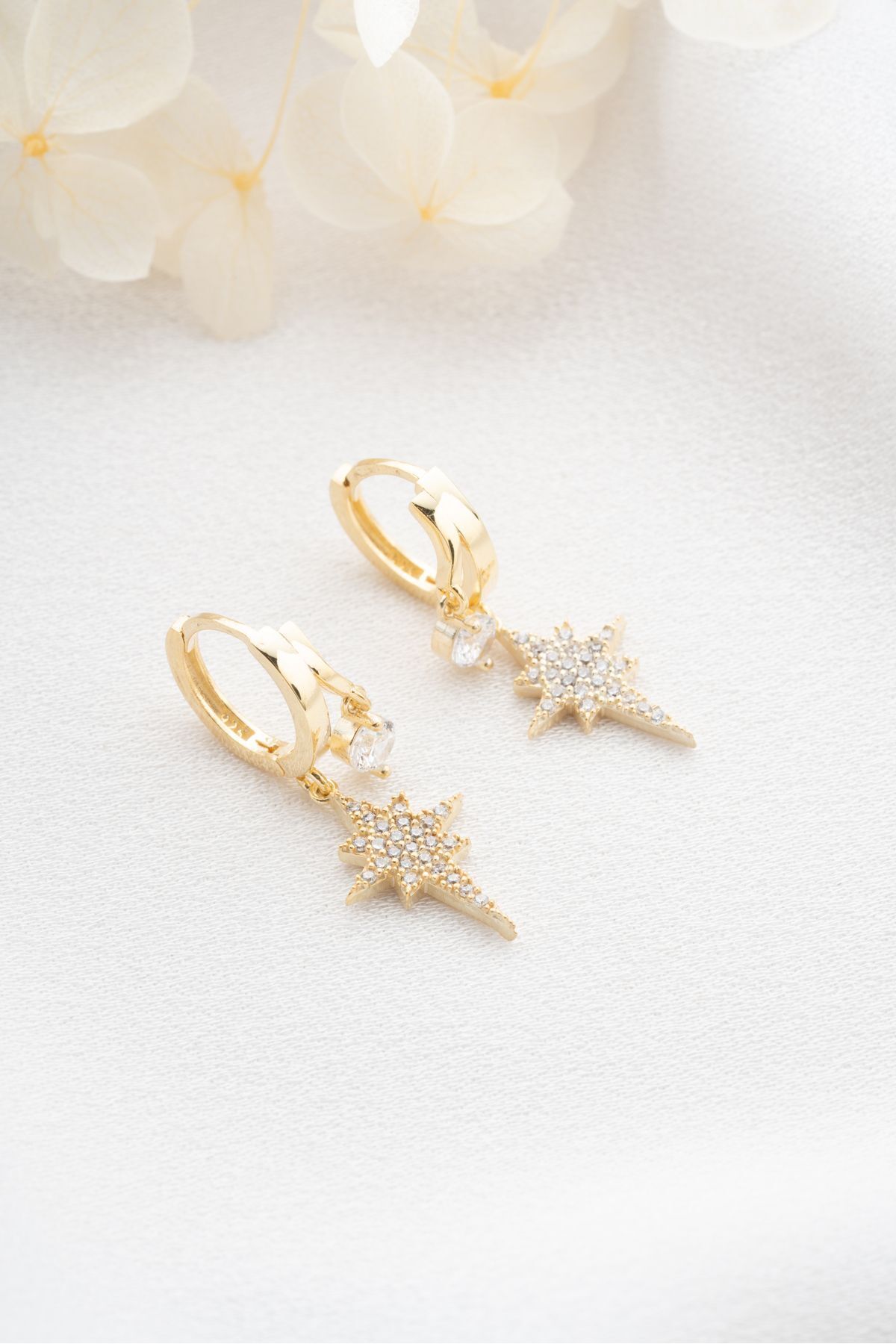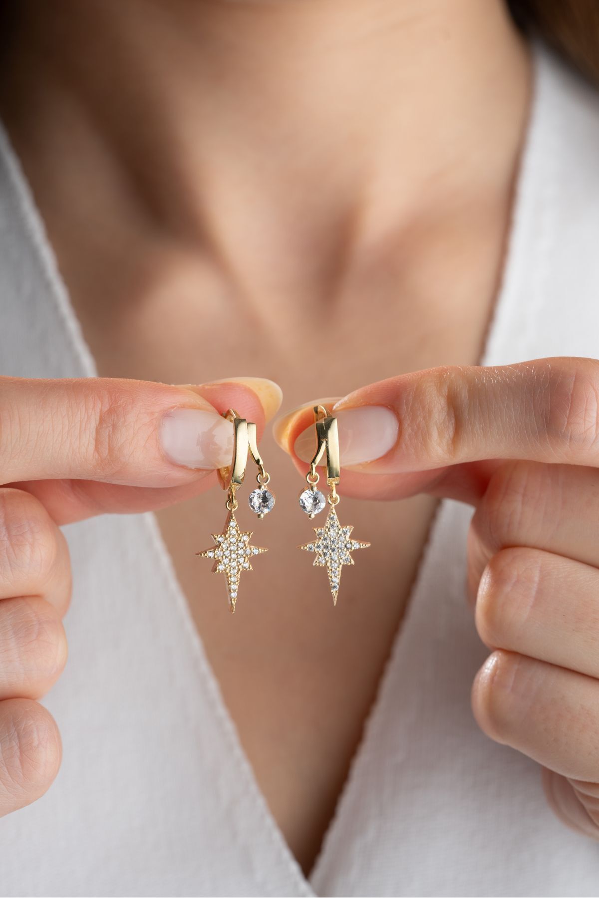 925 Ayar Gümüş Gold Çift Taşlı Kutup Yıldızı Küpe
