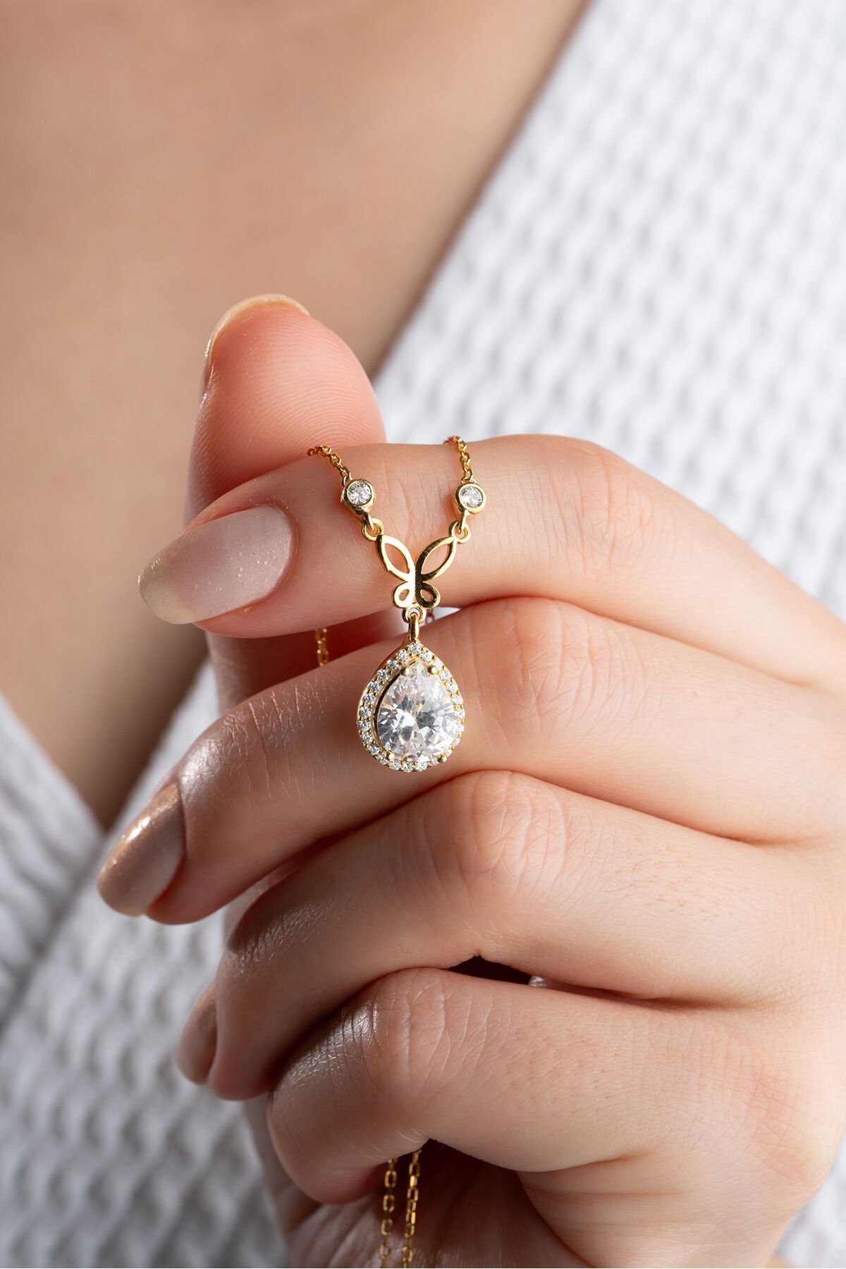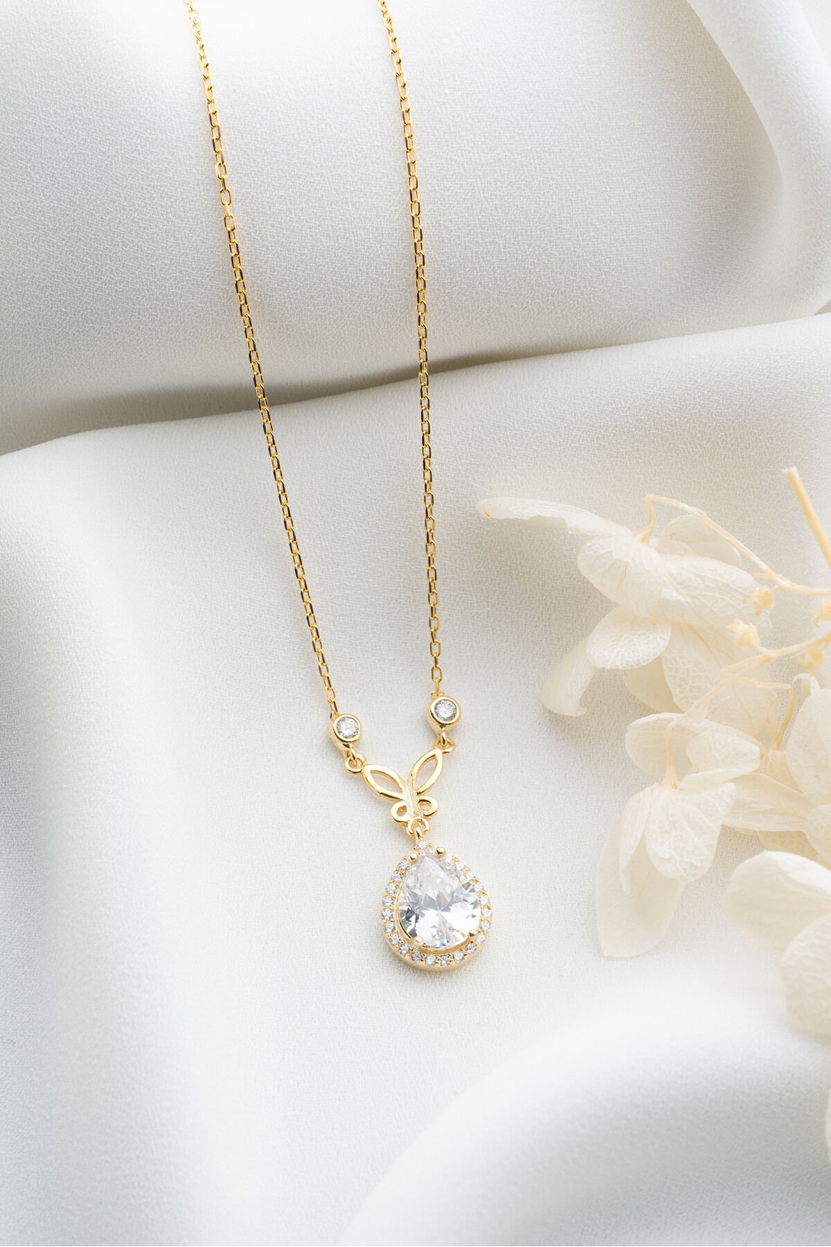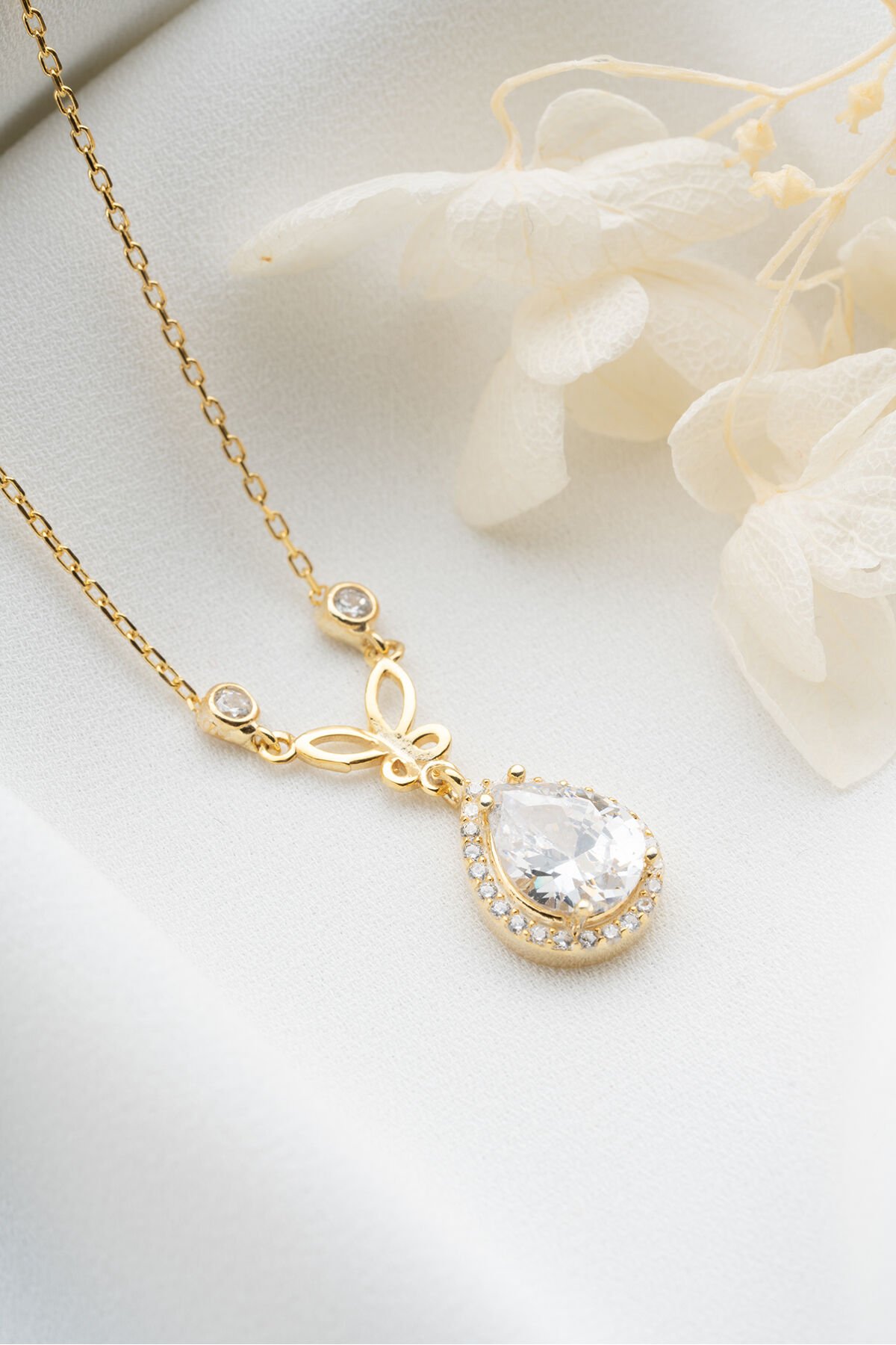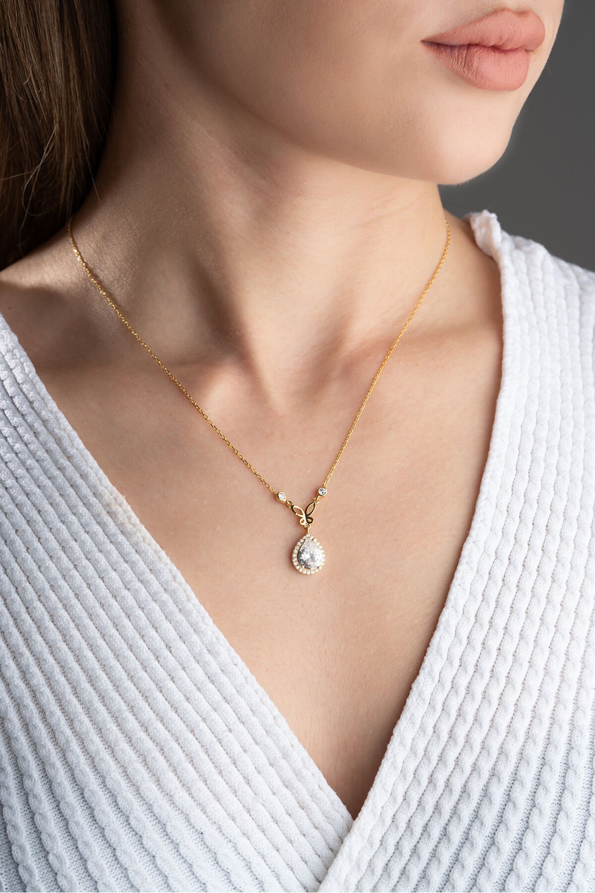 925 Ayar Gümüş Gold Damla Taş Kelebekli Kolye