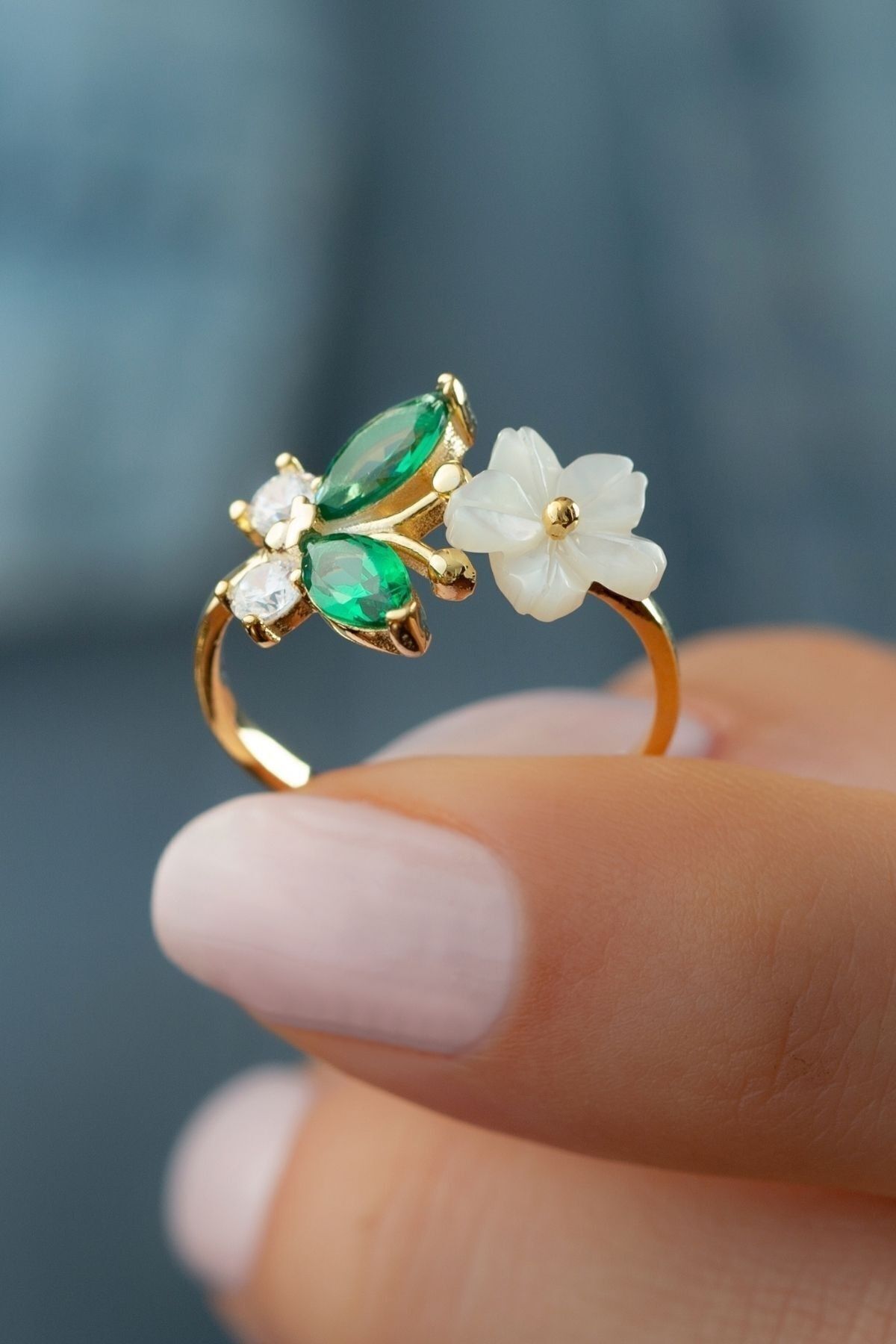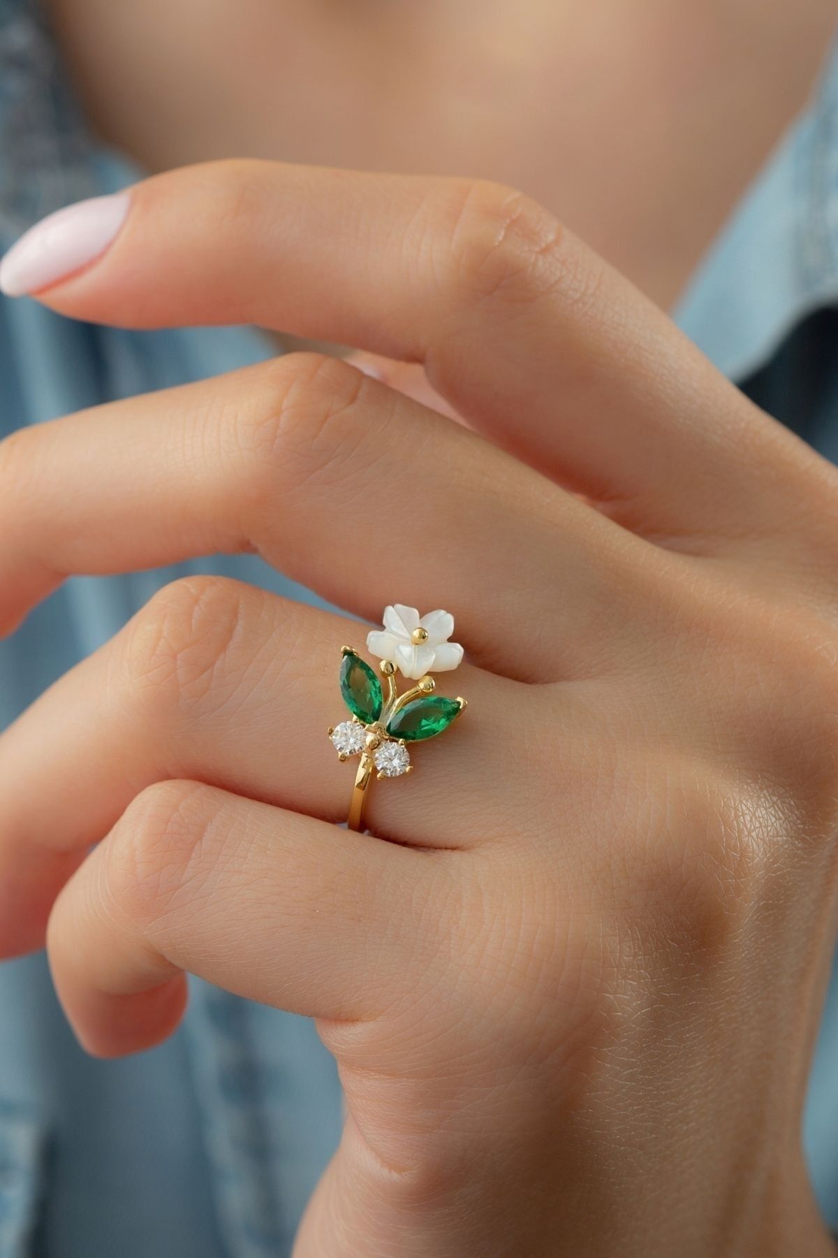 925 Ayar Gümüş Gold Kelebek Sedefli Yüzük