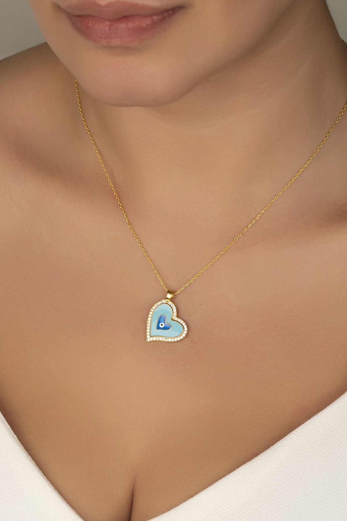 925 Ayar Gümüş Gold Mineli Nazar Kalp Kolye