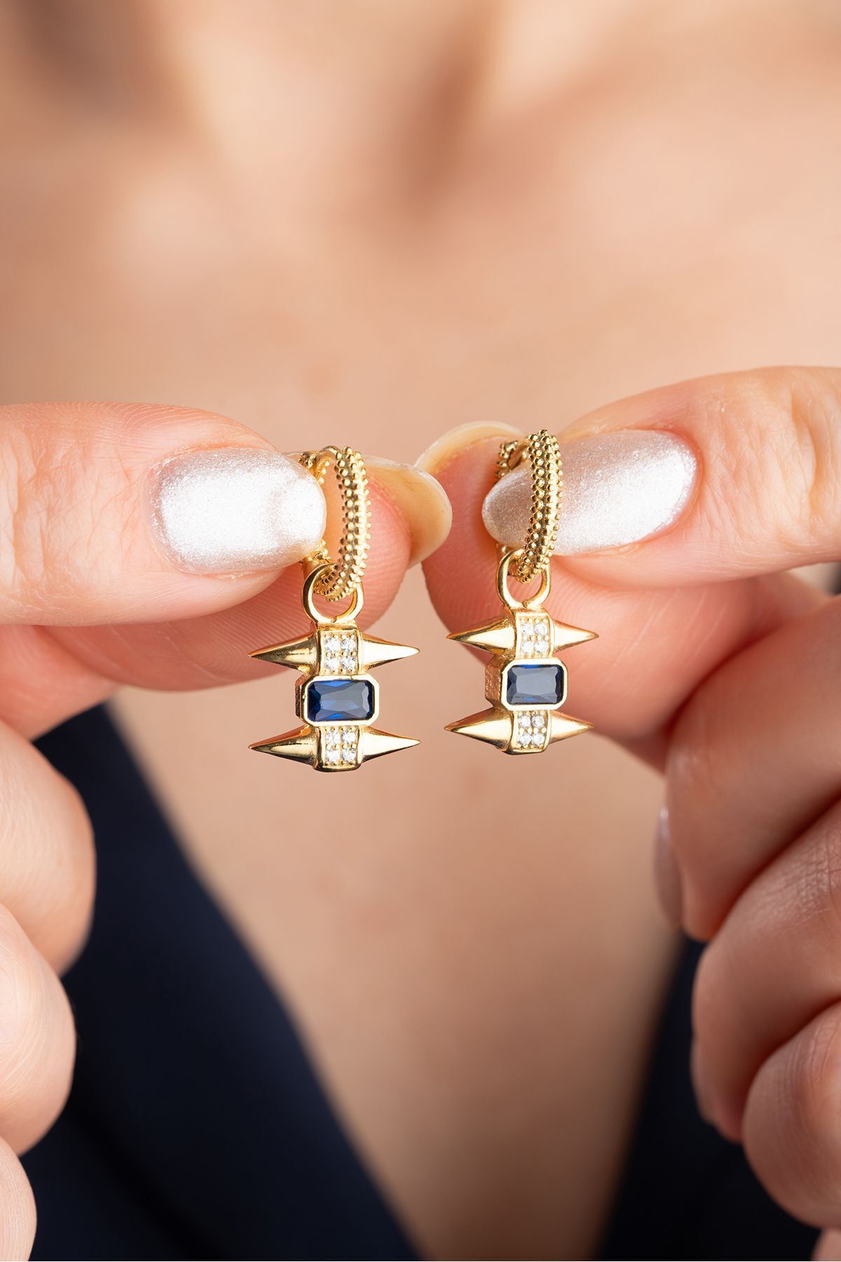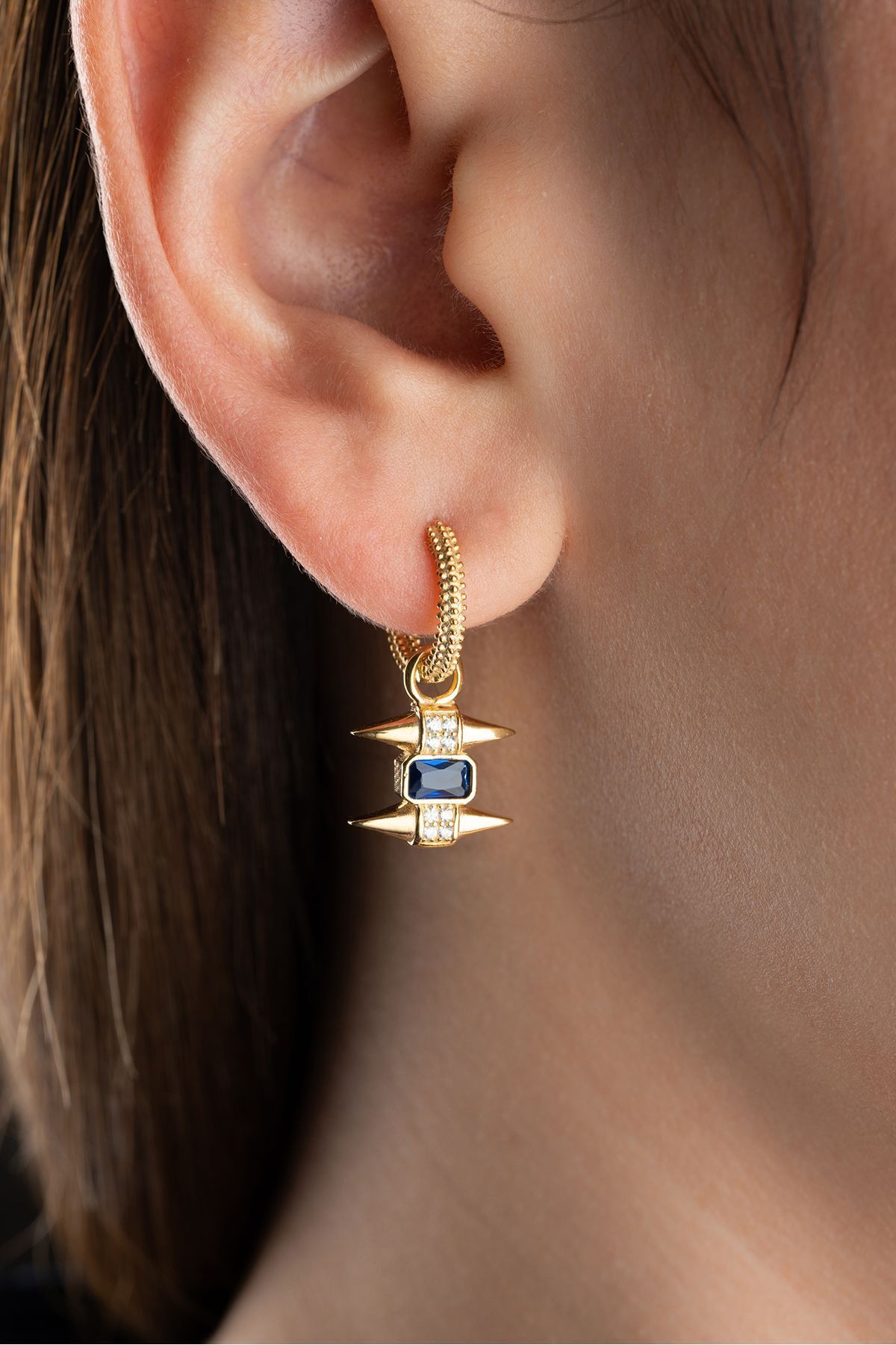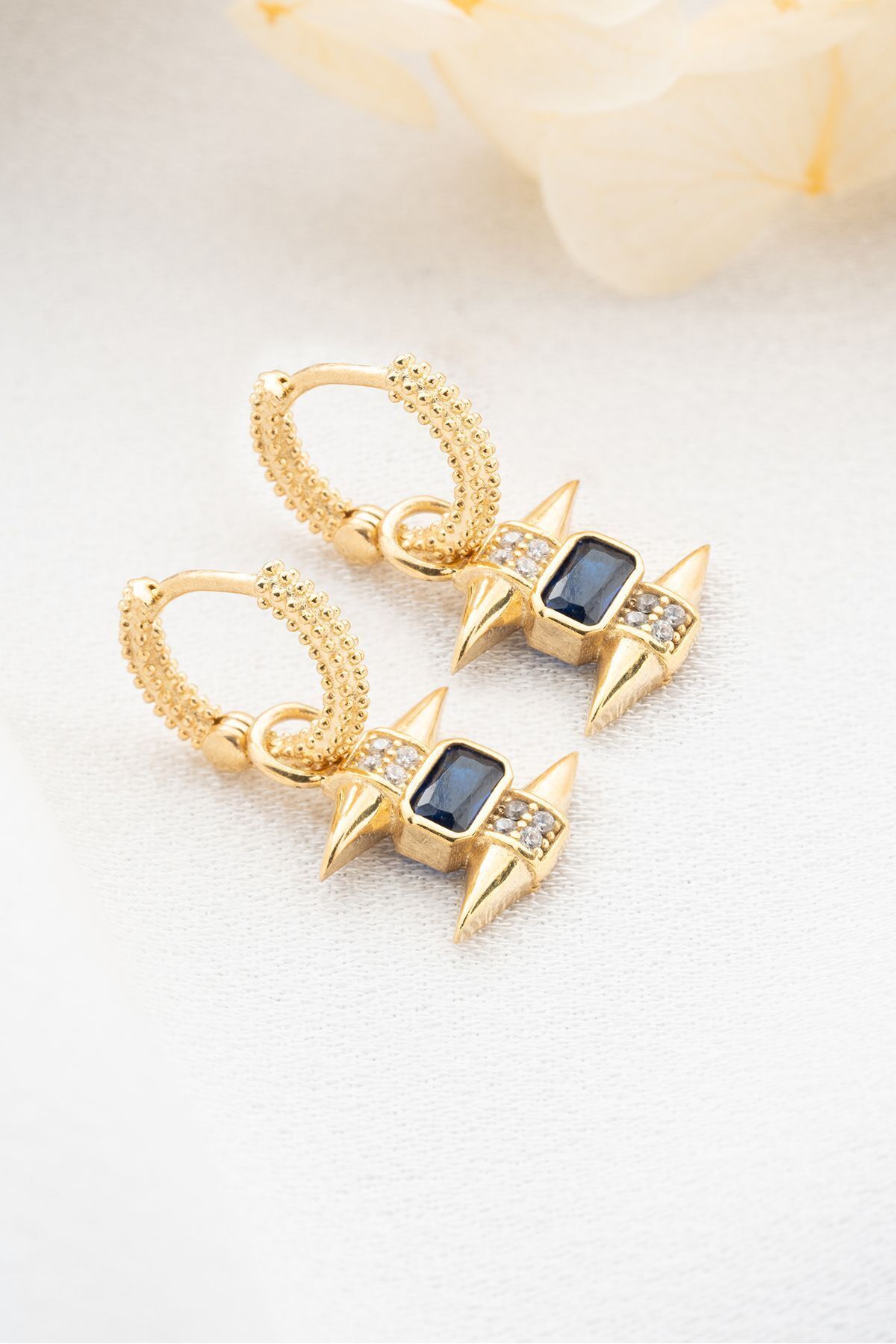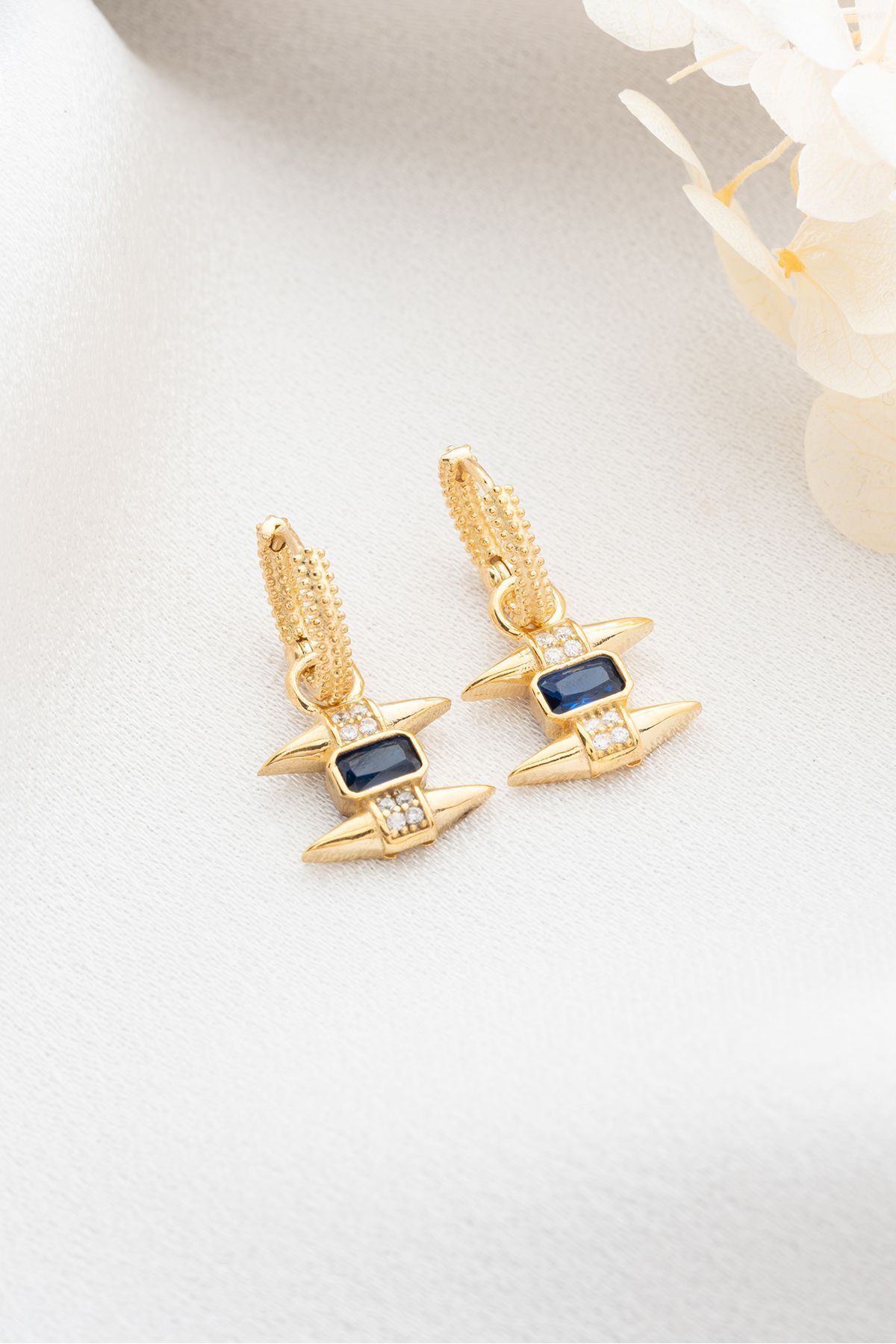 925 Ayar Gümüş Gold Safir Taşlı Trend Küpe