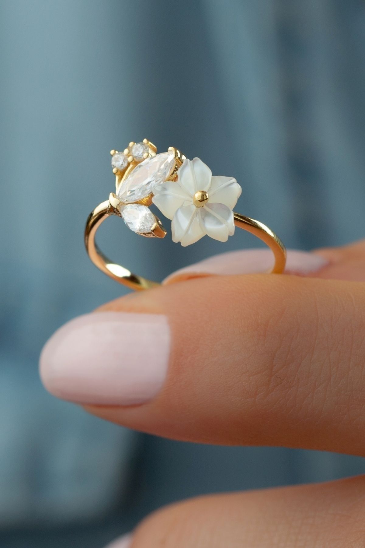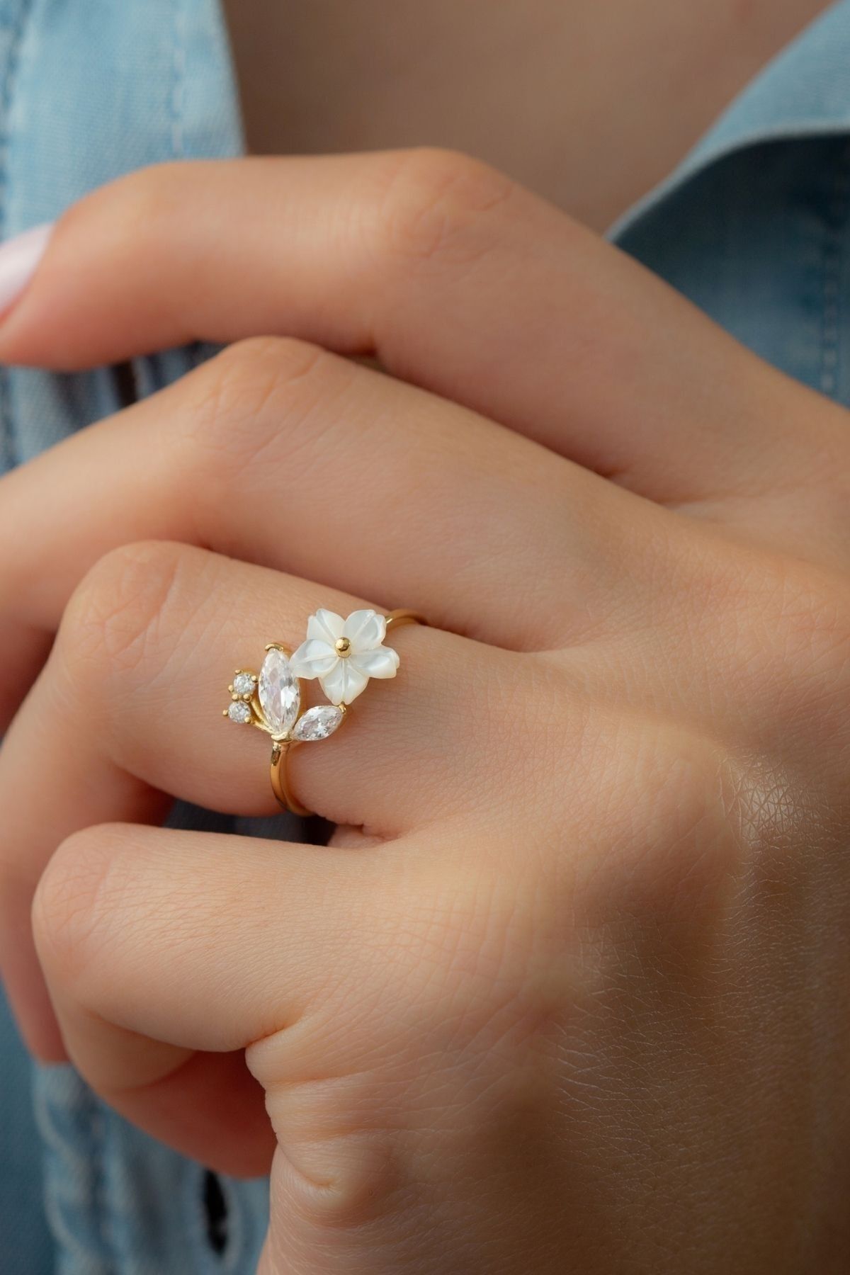 925 Ayar Gümüş Gold Sedefli Çiçek Yüzük