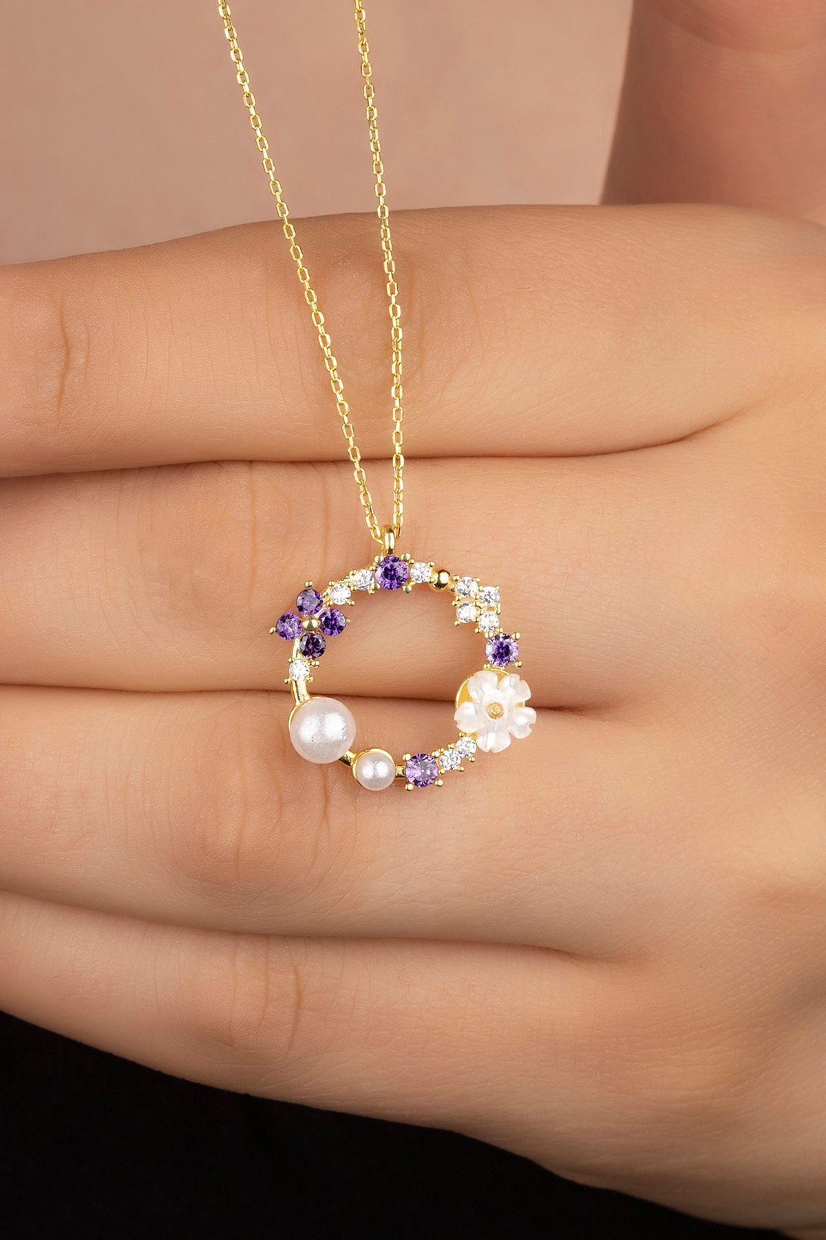 925 Ayar Gümüş Gold Sedefli Güllü Incili Kolye