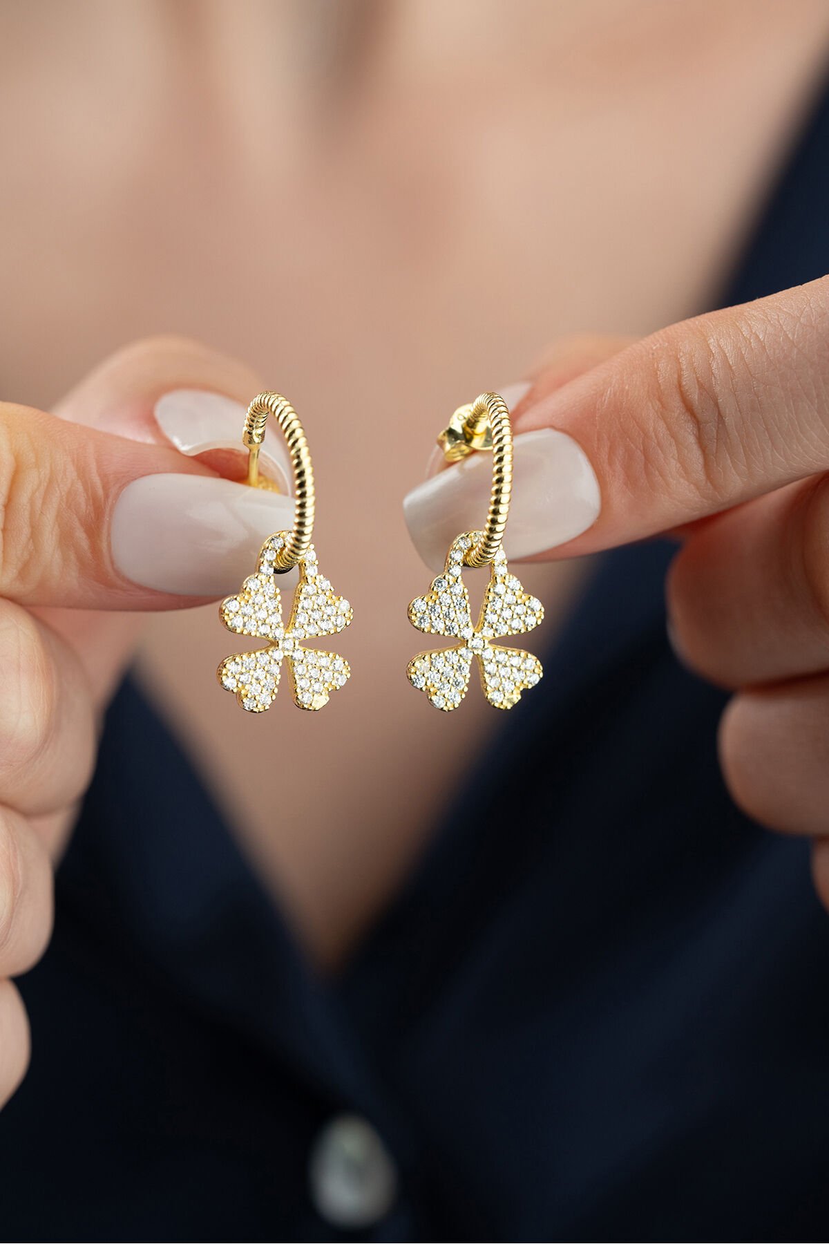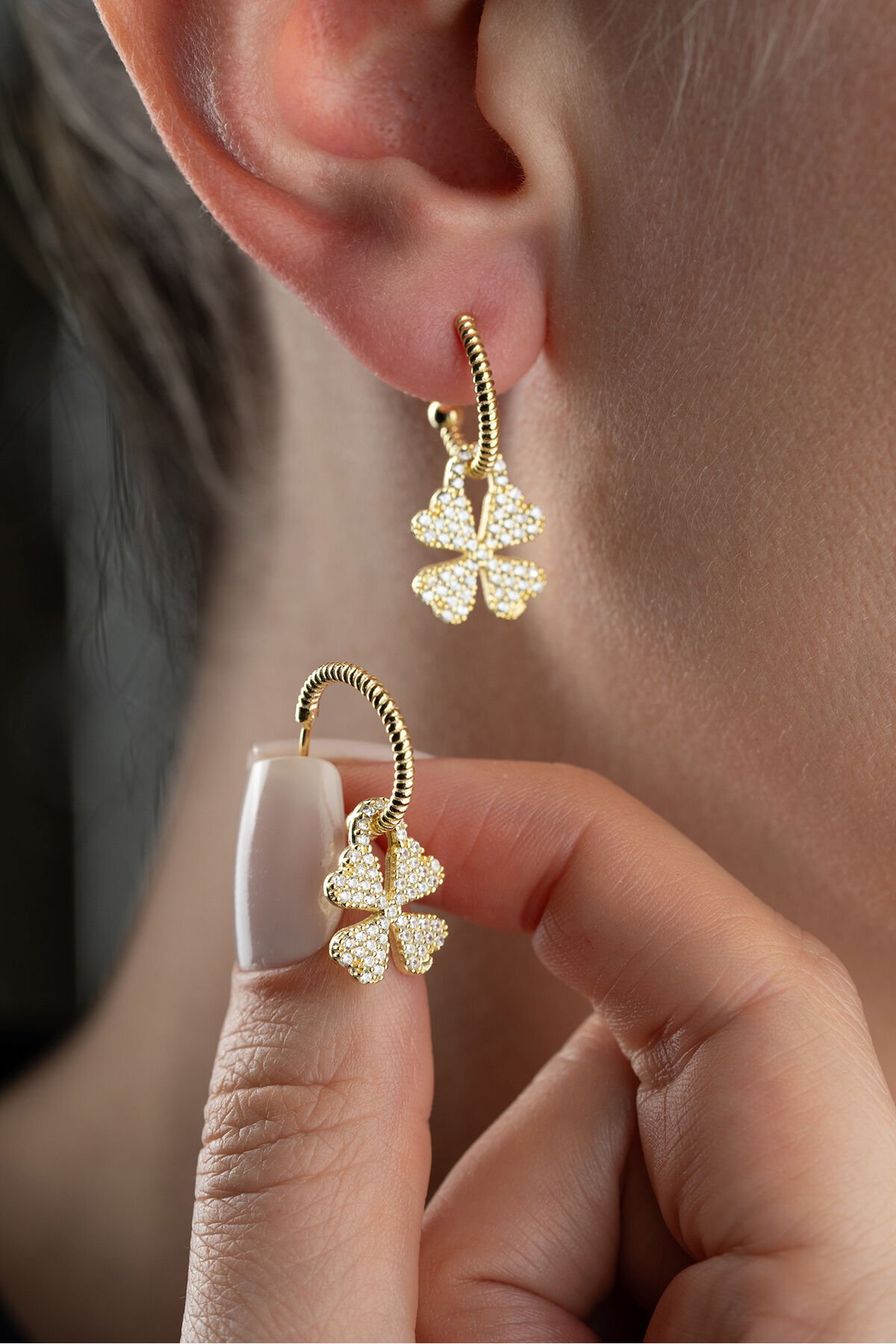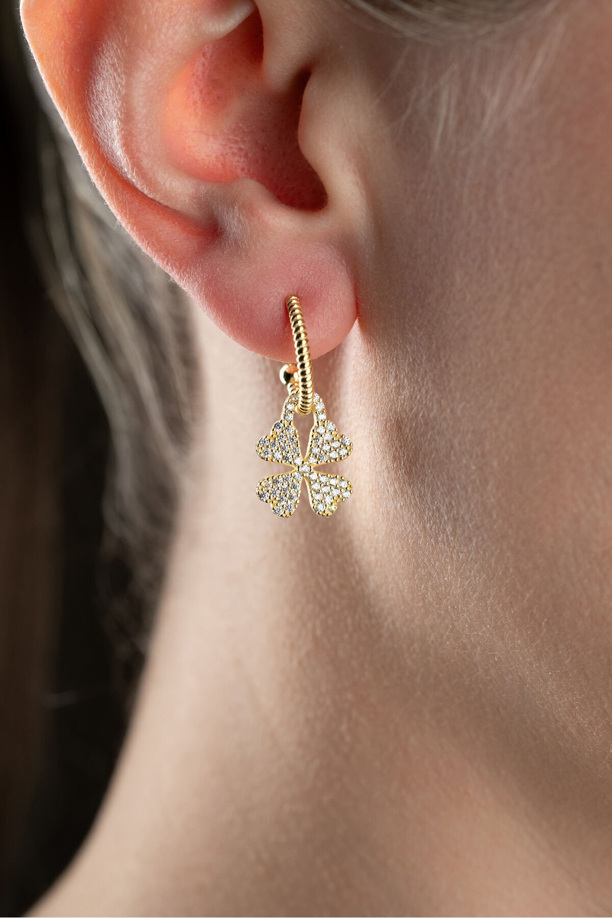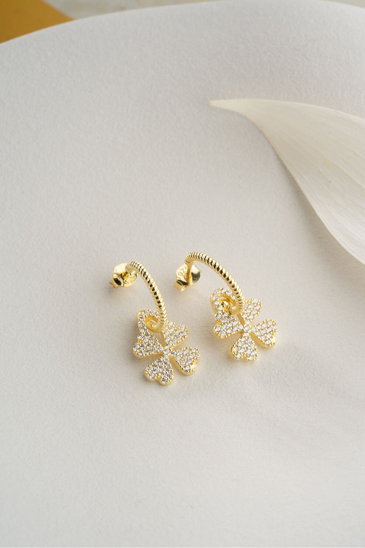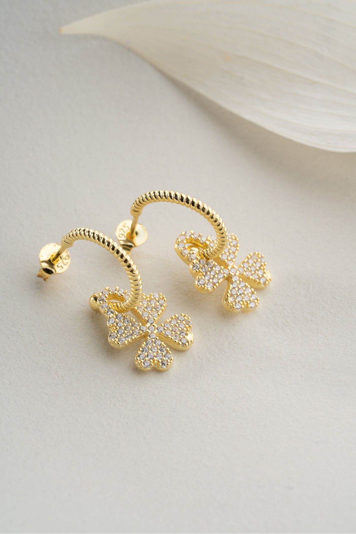 925 Ayar Gümüş Gold Zirkon Taşlı Yonca Küpe
