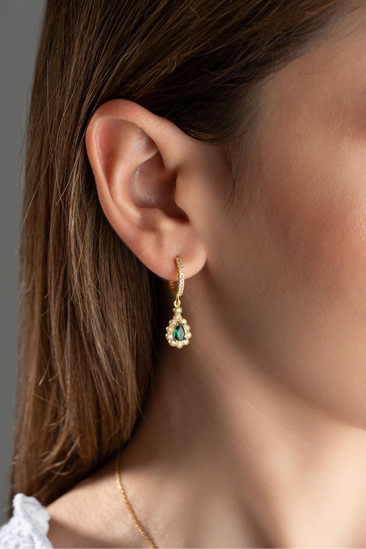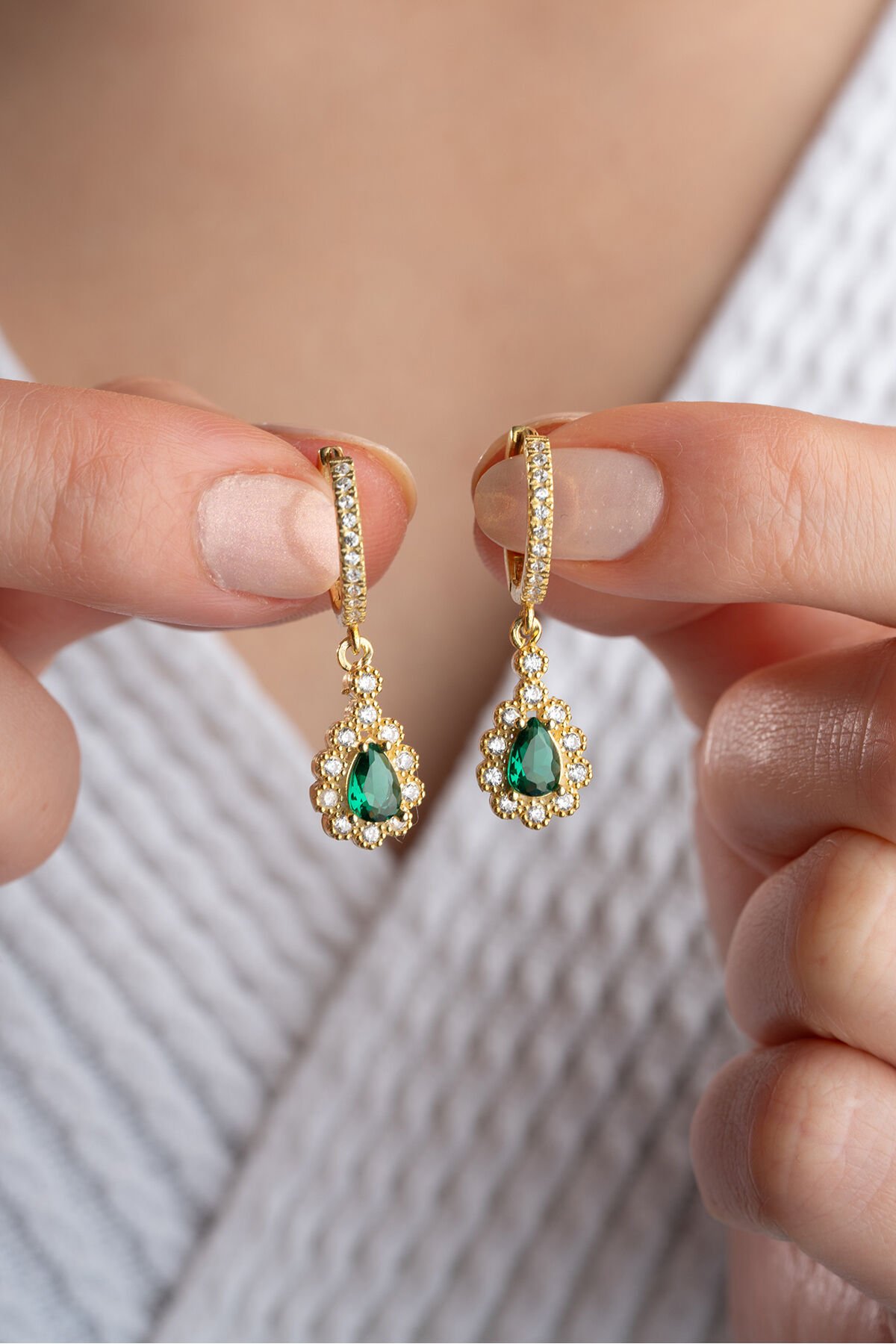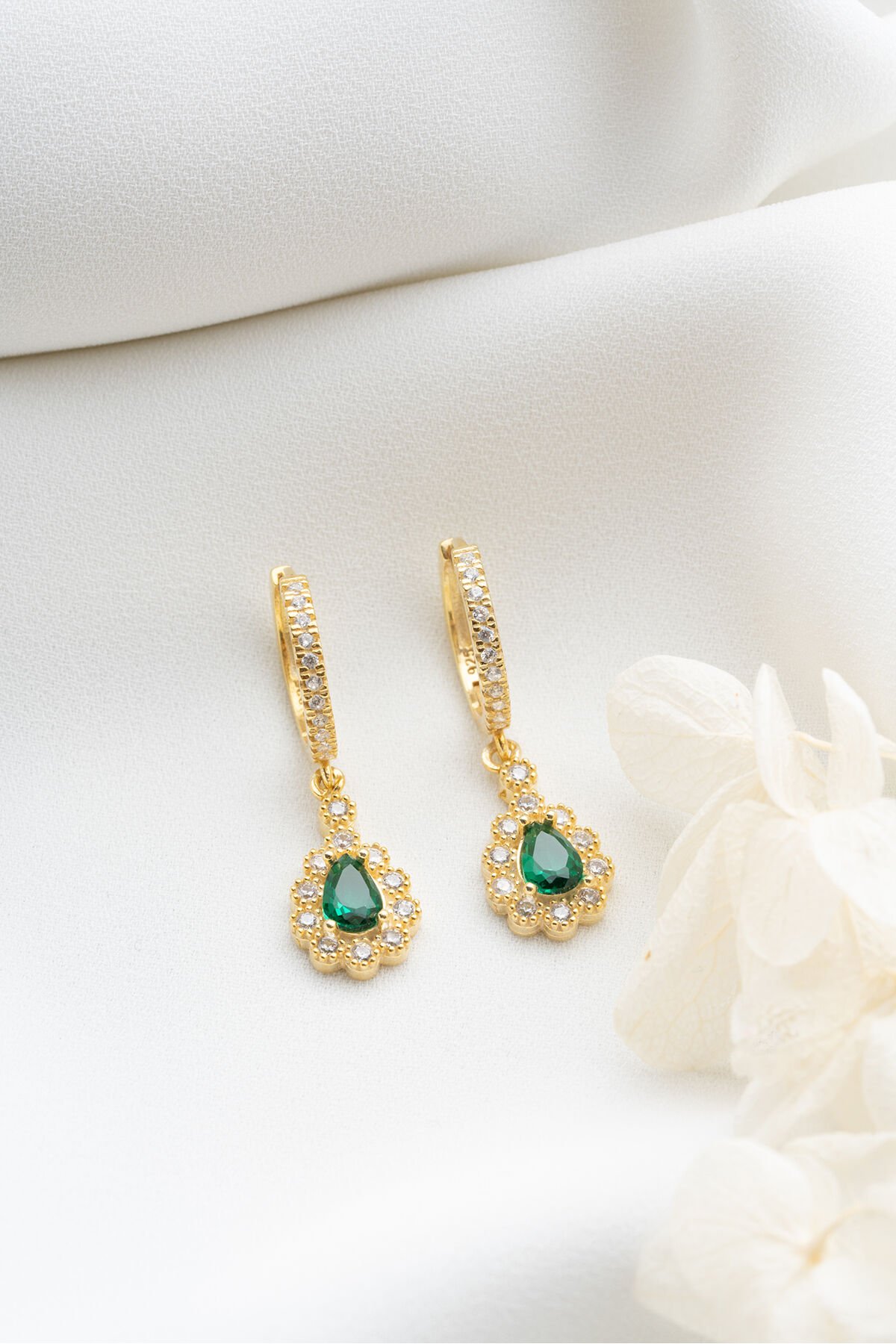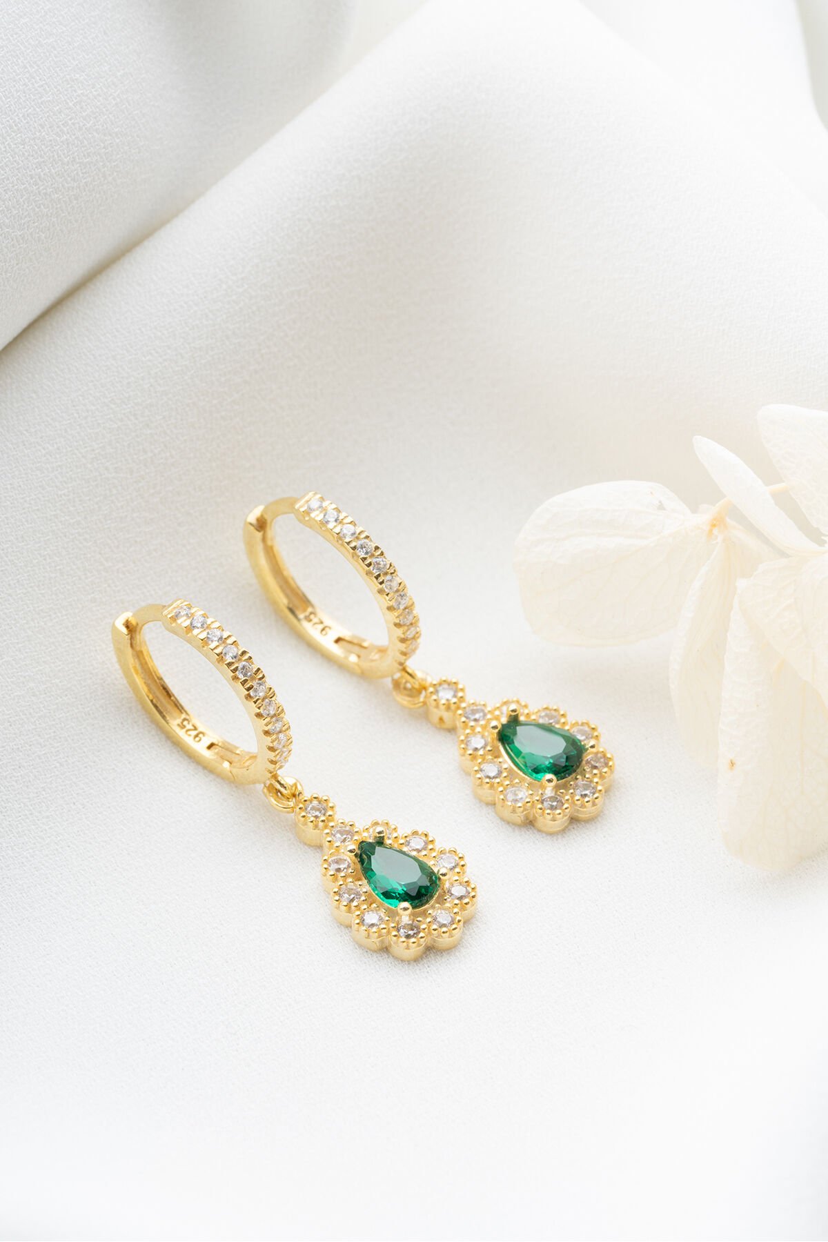 925 Ayar Gümüş Gold Zümrüt Yeşili Damla Küpe