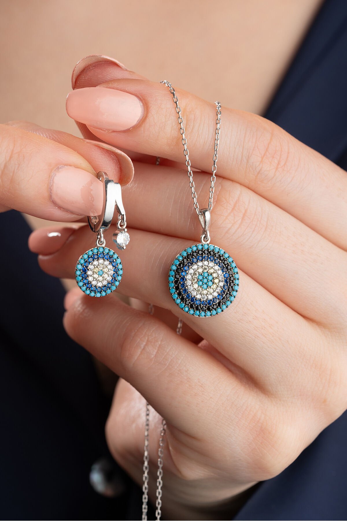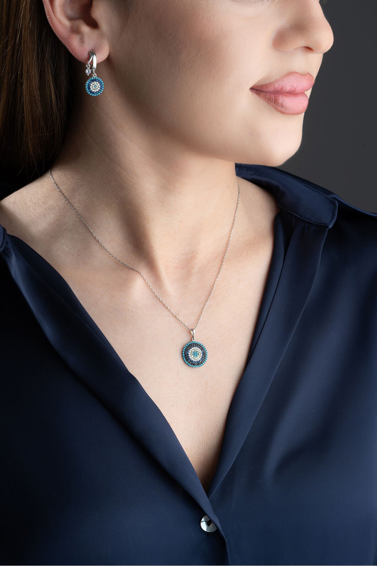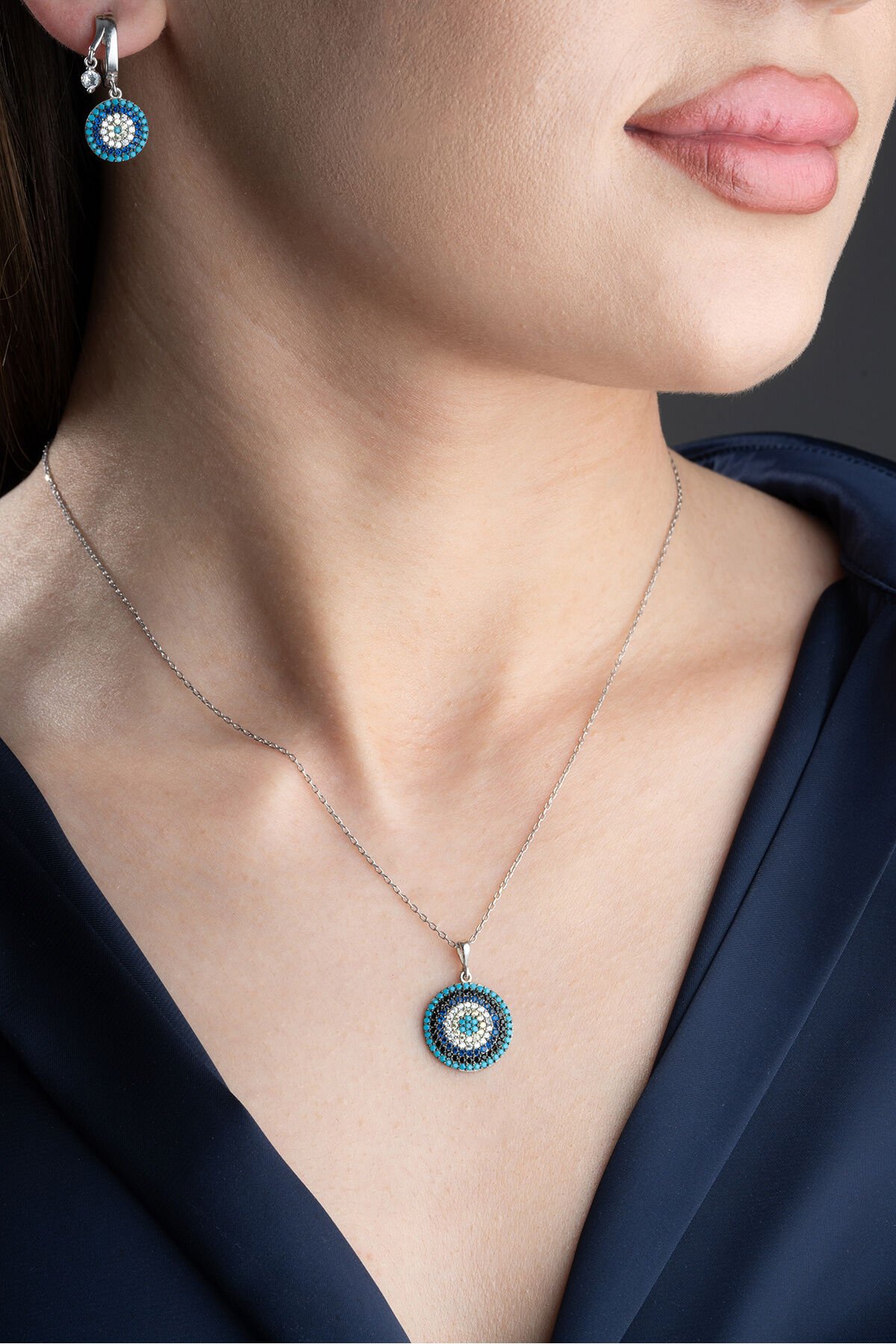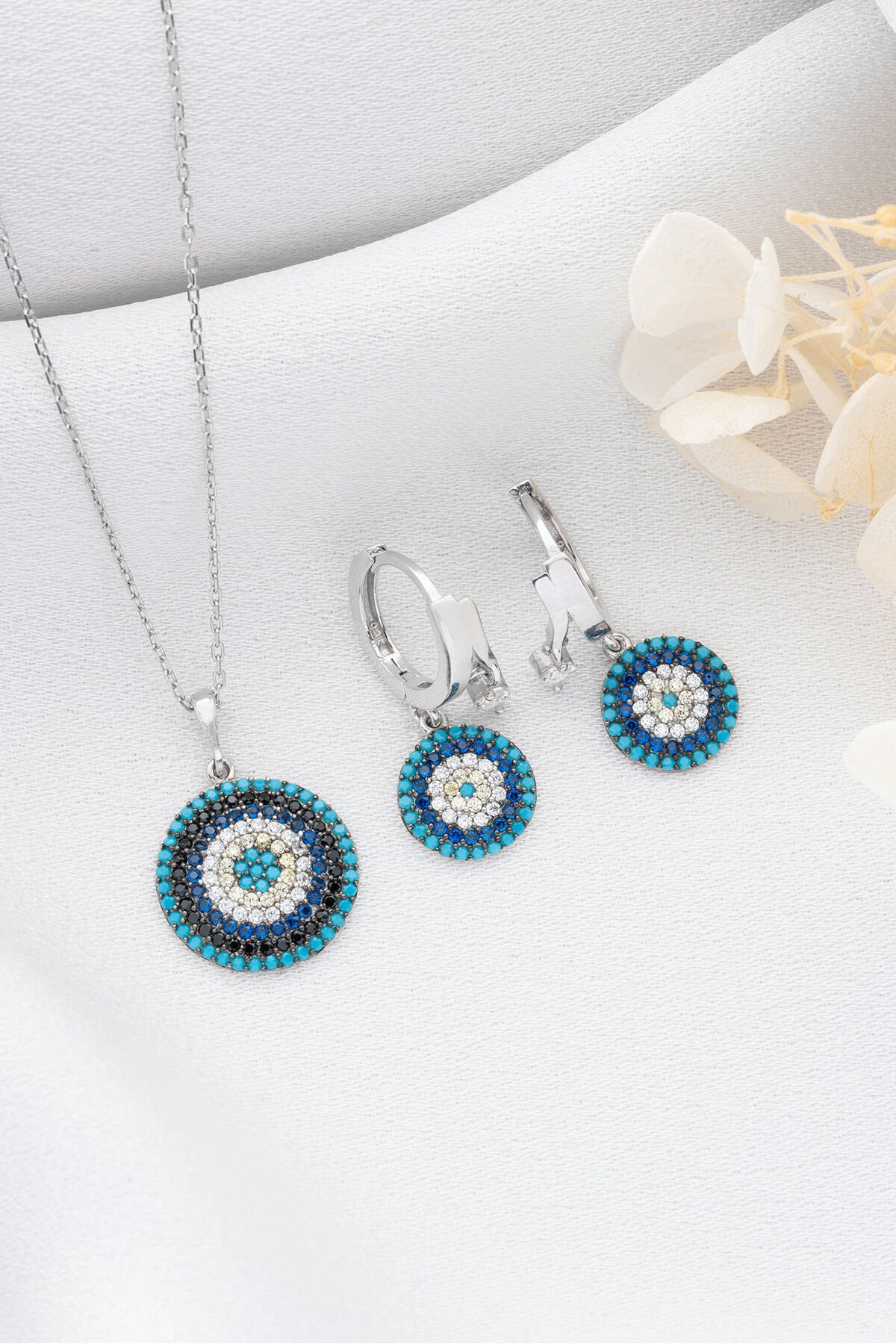 925 Ayar Gümüş Göz Nazar Kolye Küpe Seti