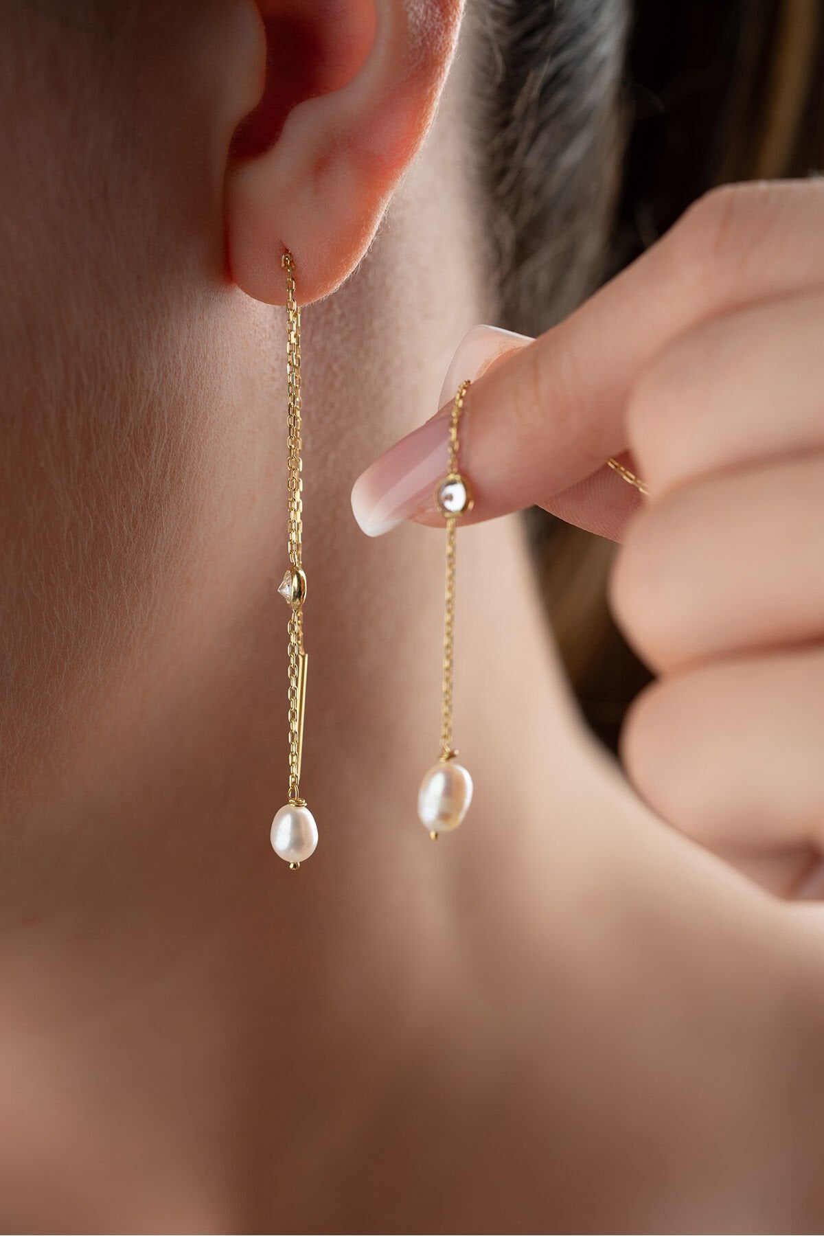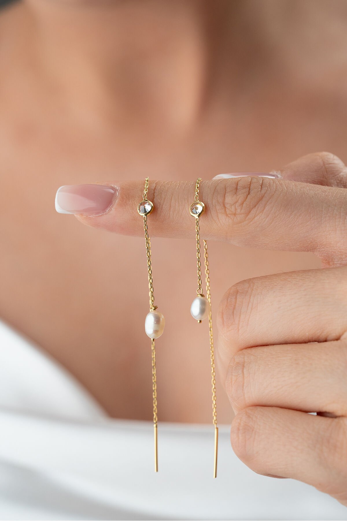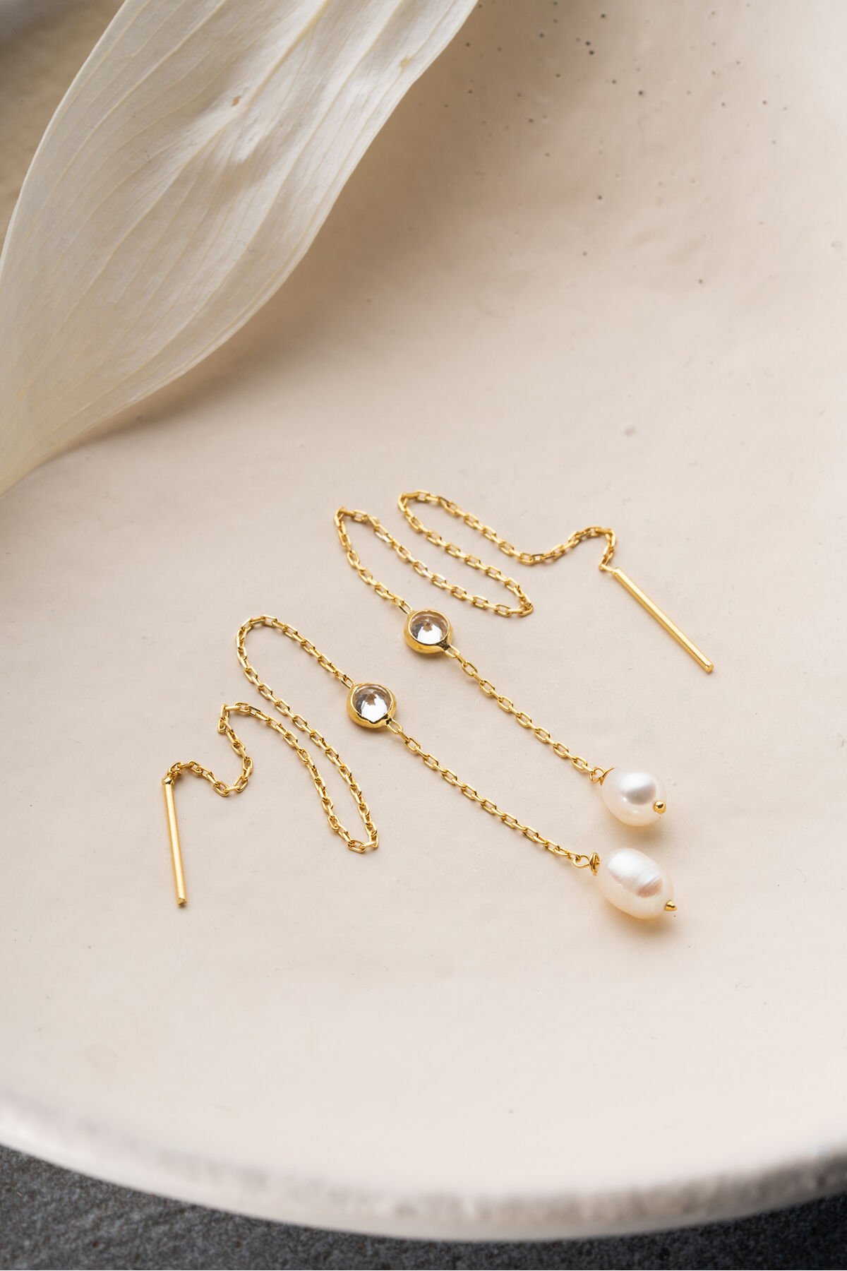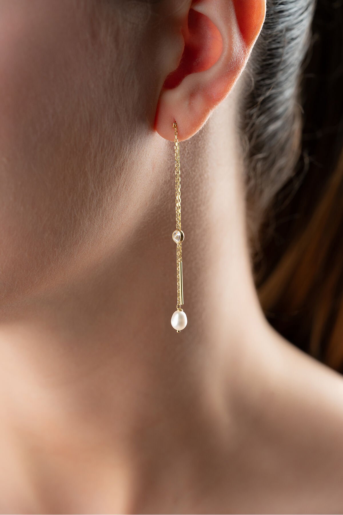 925 Ayar Gümüş İncili Taşlı Zincir Küpe