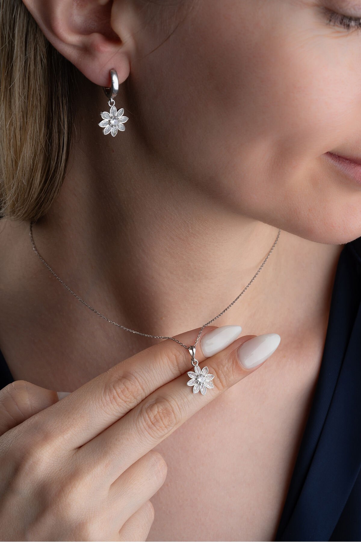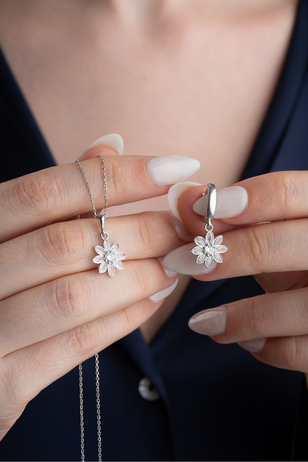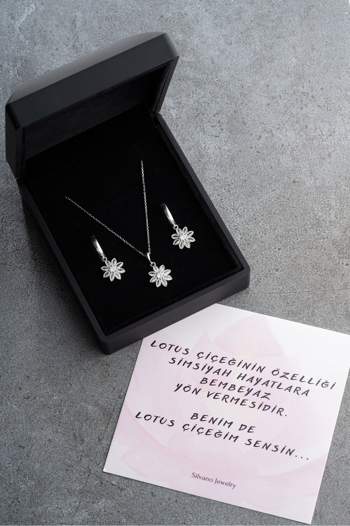 925 Ayar Gümüş Işıklı Kutu Beyaz Taşlı Lotus Takı (Kolye-Küpe) Seti