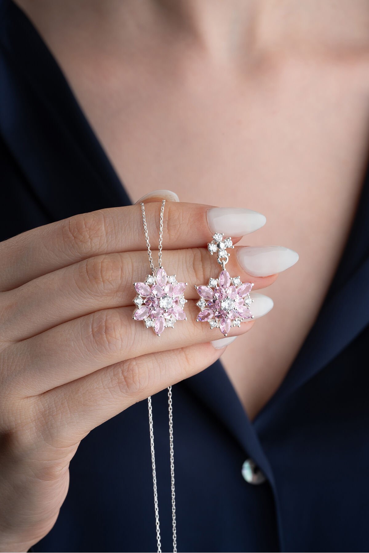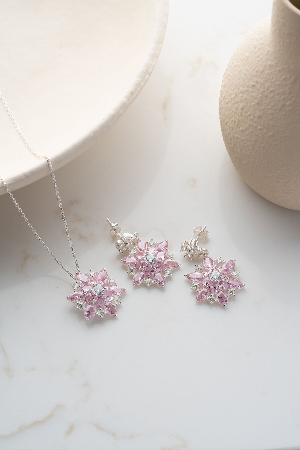 925 Ayar gümüş Işıklı Kutu Pembe Oval Taşlı Takı (Kolye-Küpe) Seti