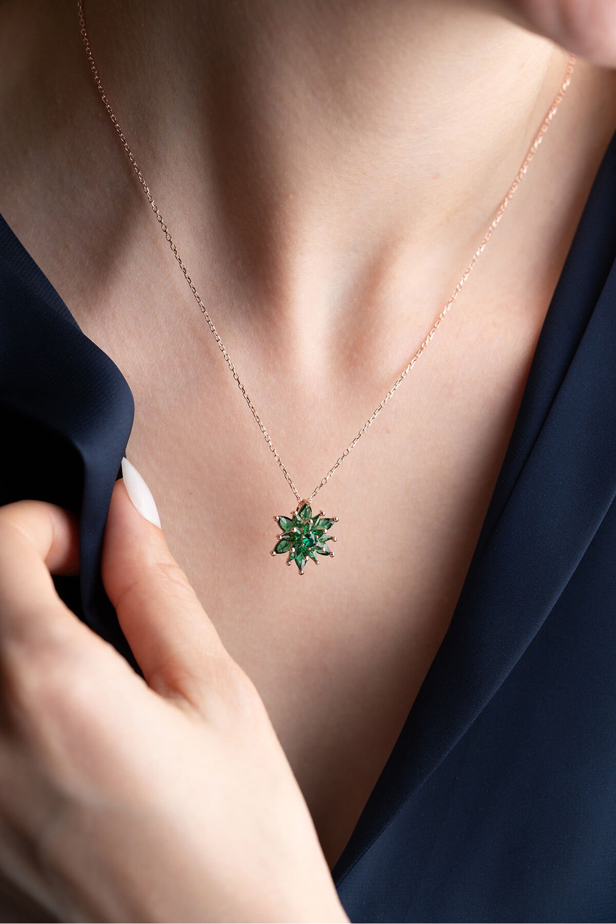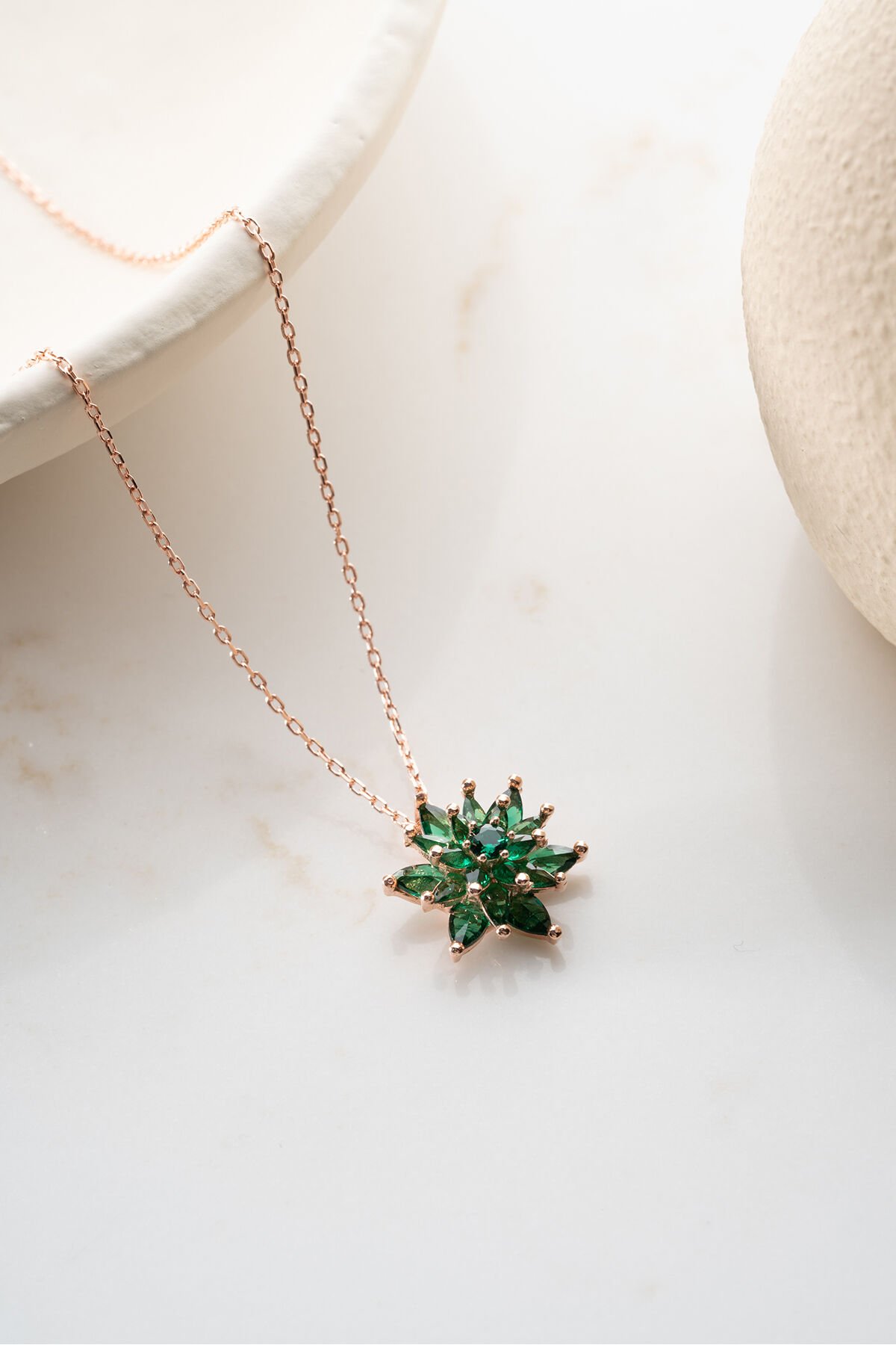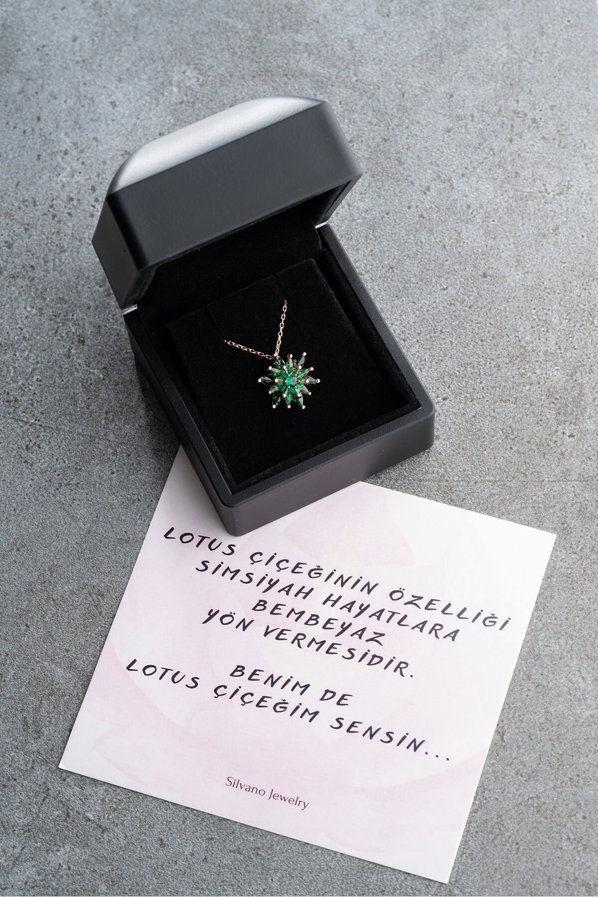 925 Ayar Gümüş Işıklı Kutu Zümrüt Yeşil Taşlı Lotus Kolye