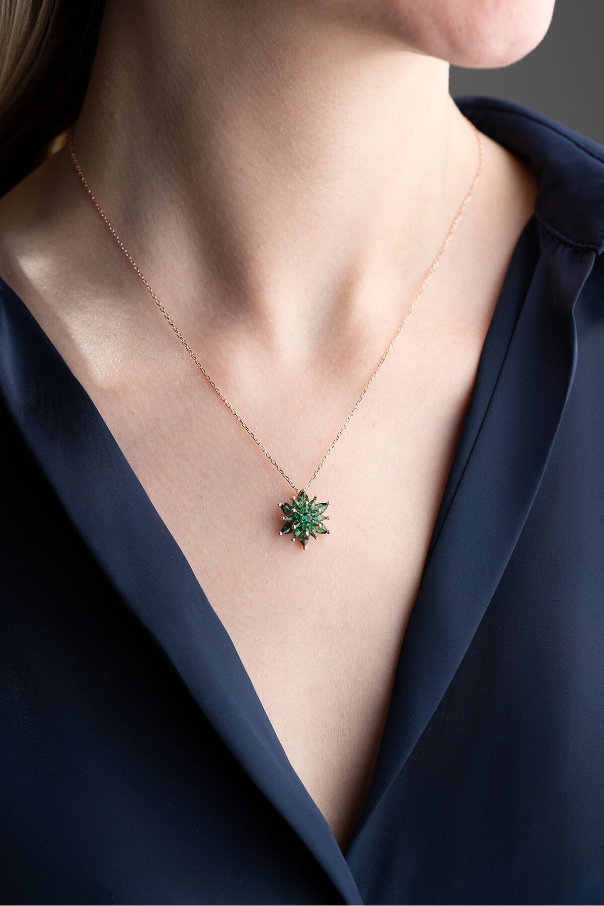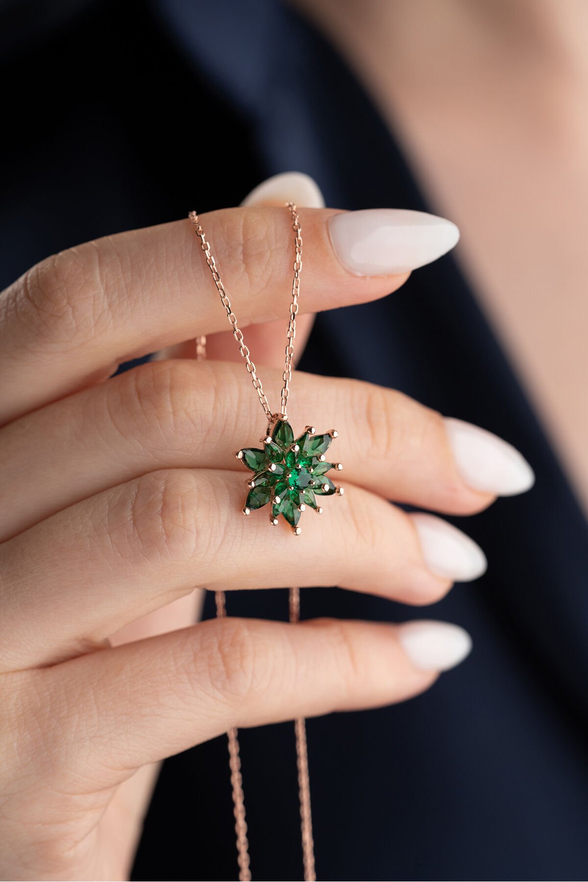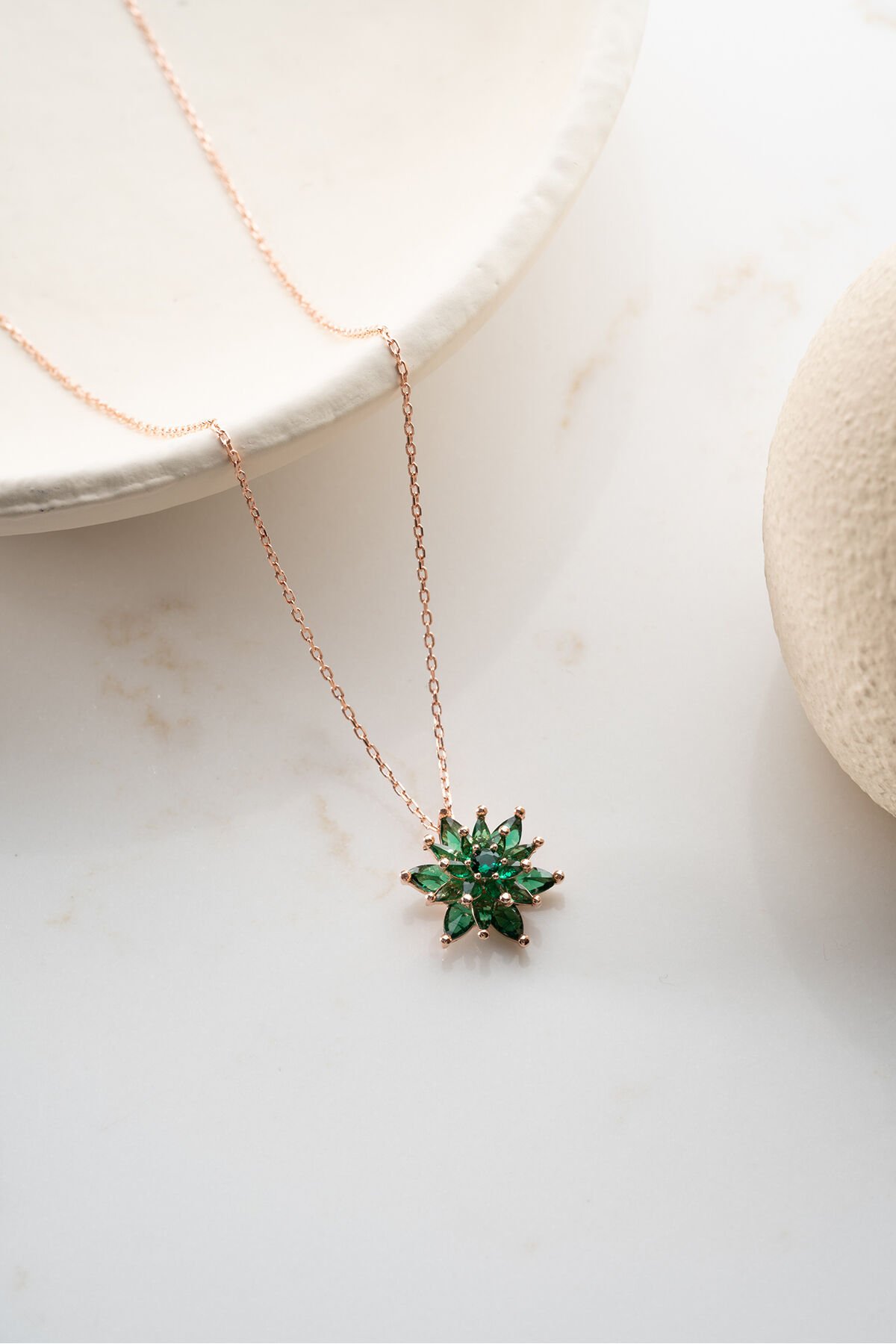 925 Ayar Gümüş Işıklı Kutu Zümrüt Yeşil Taşlı Lotus Kolye