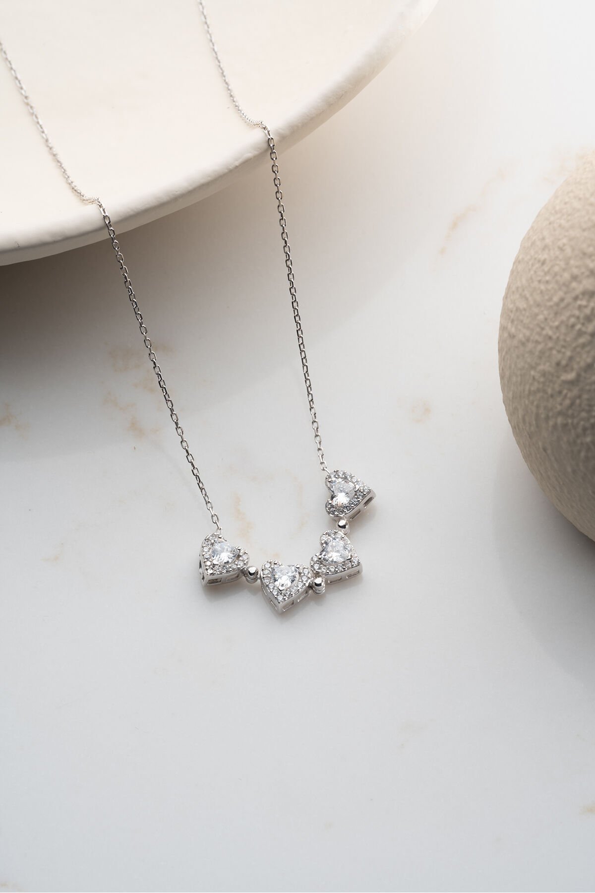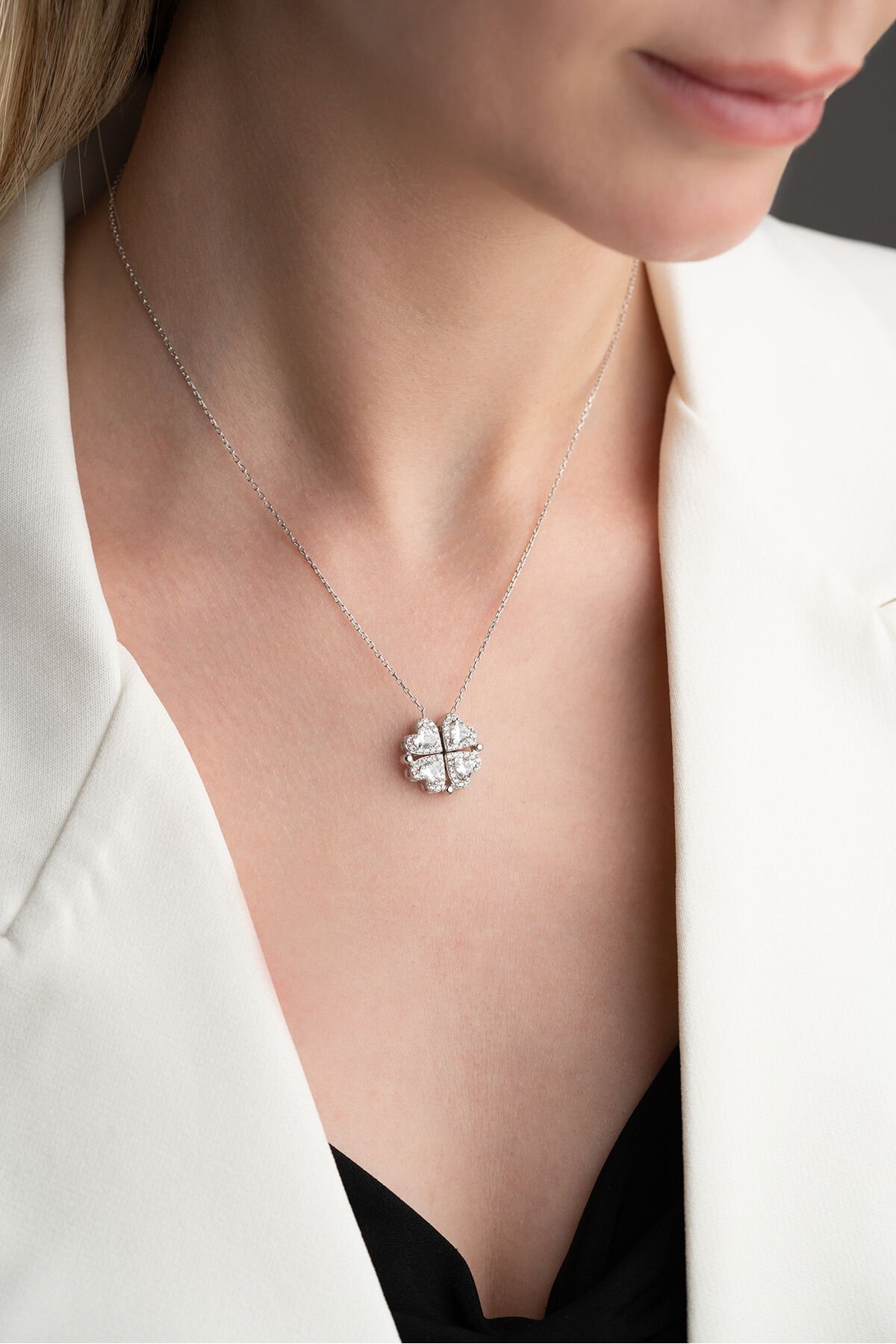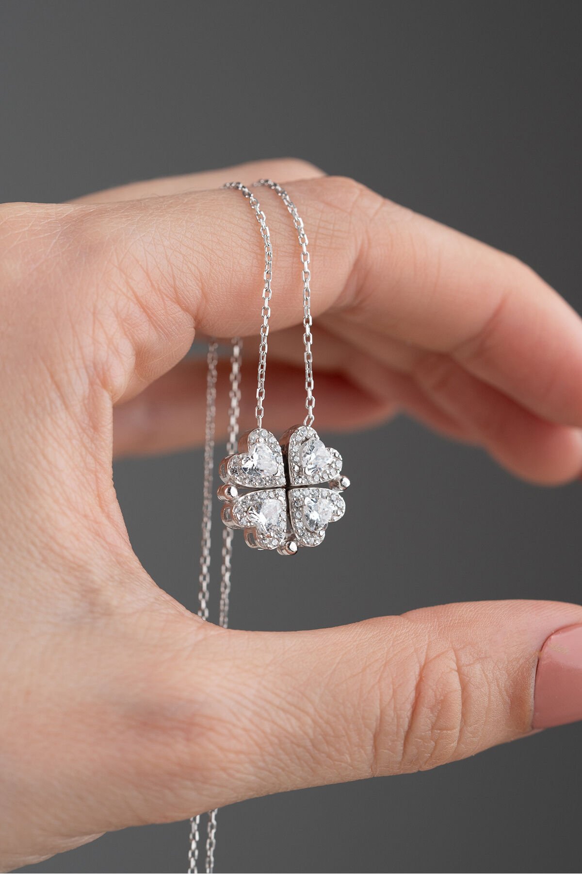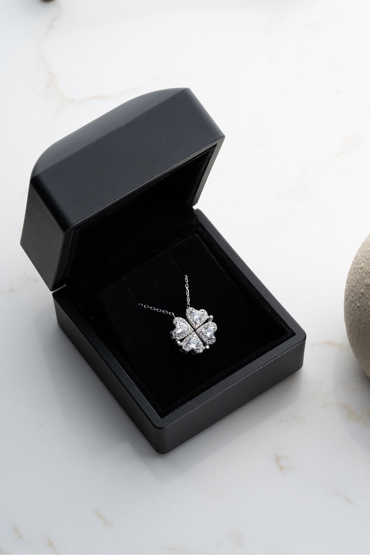 925 Ayar Gümüş Işıklı Kutuda Beyaz Taşlı Mıknatıslı Kalp Kolye