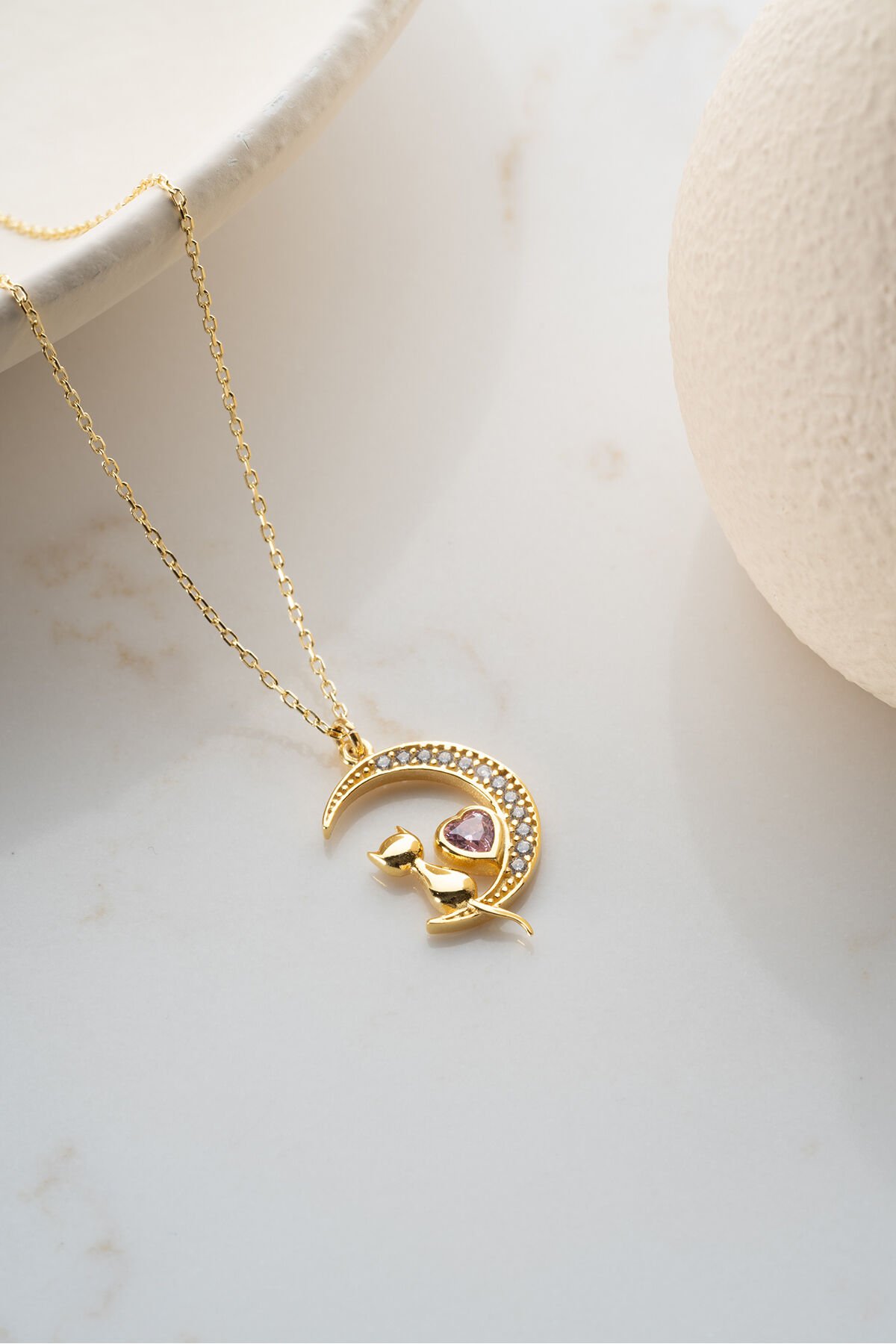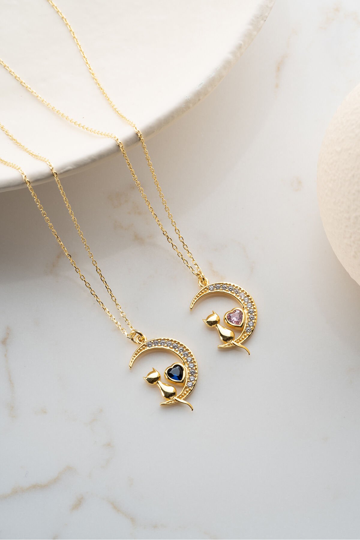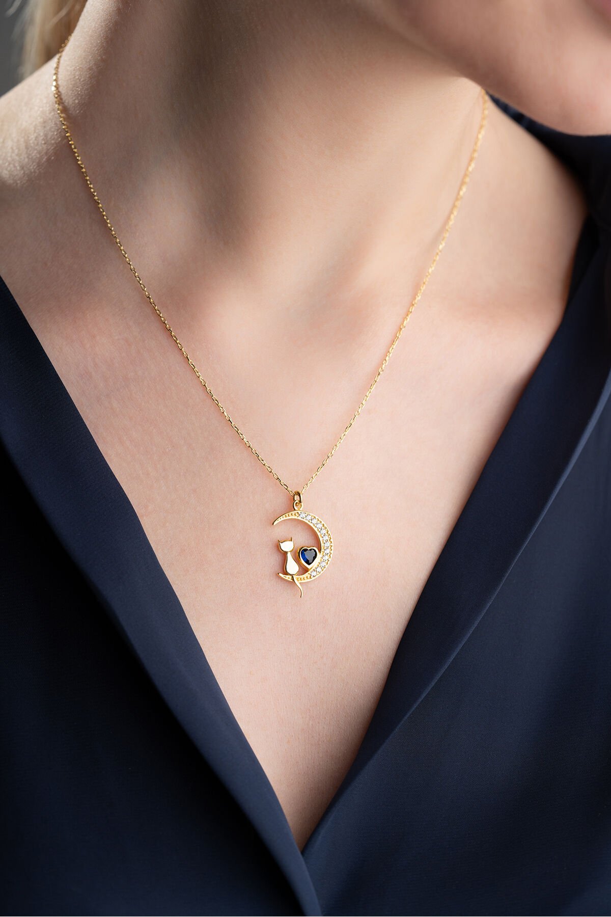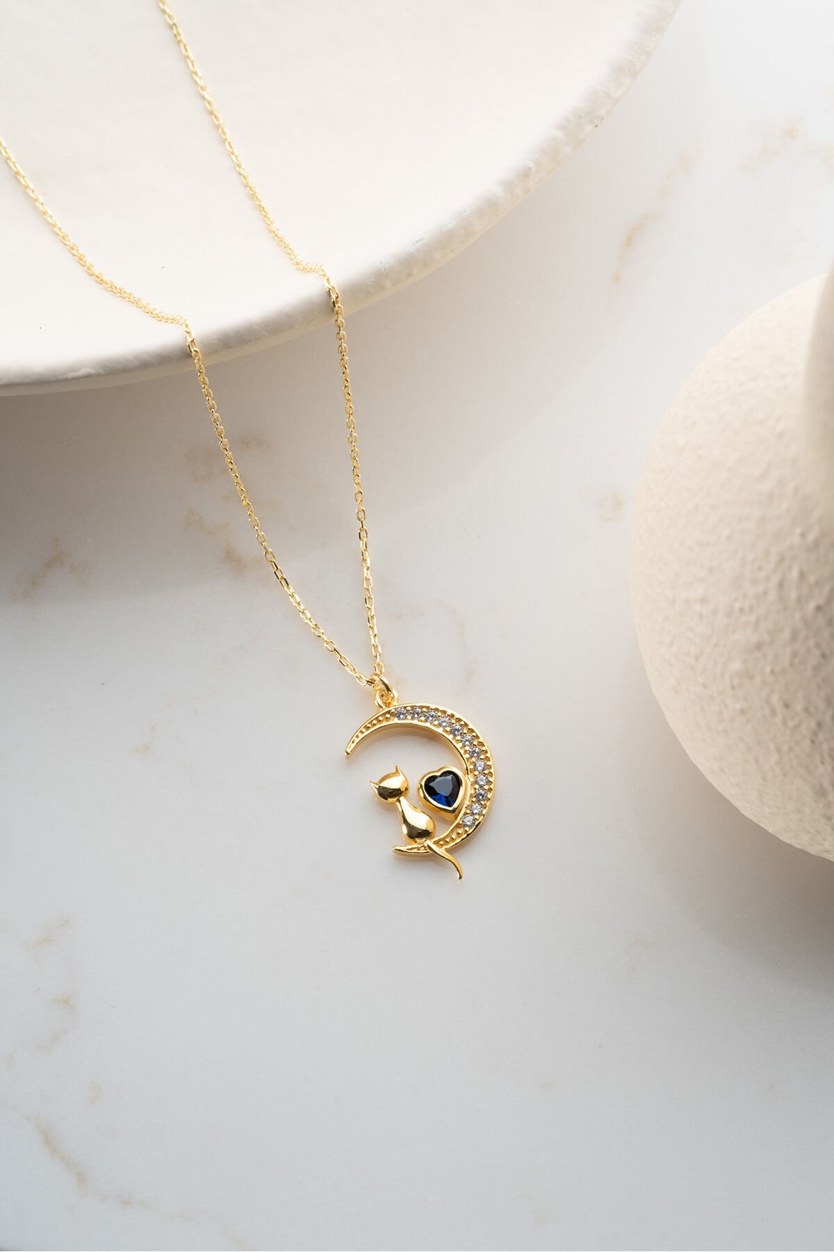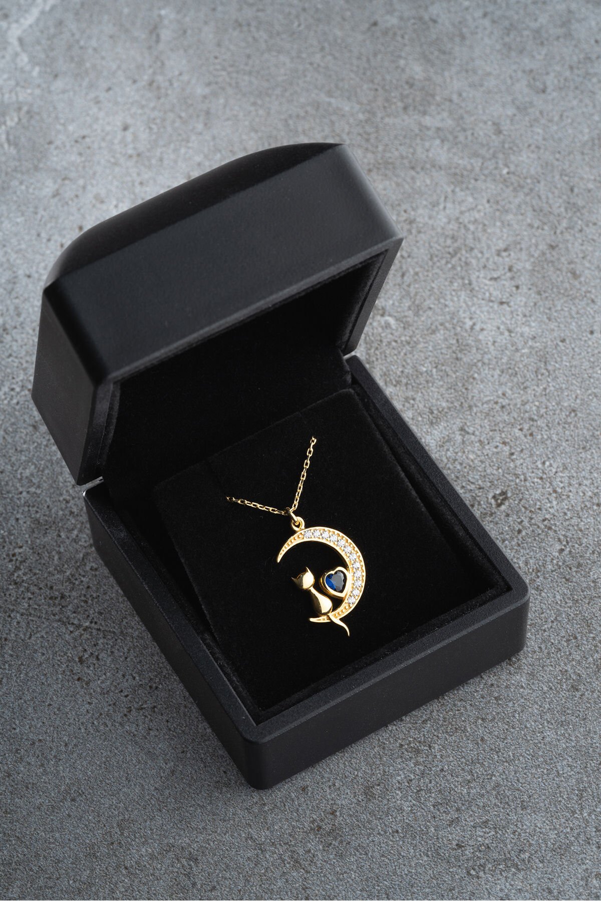 925 Ayar Gümüş Işıklı Kutuda Mavi Taşlı Gold kedi Kolye