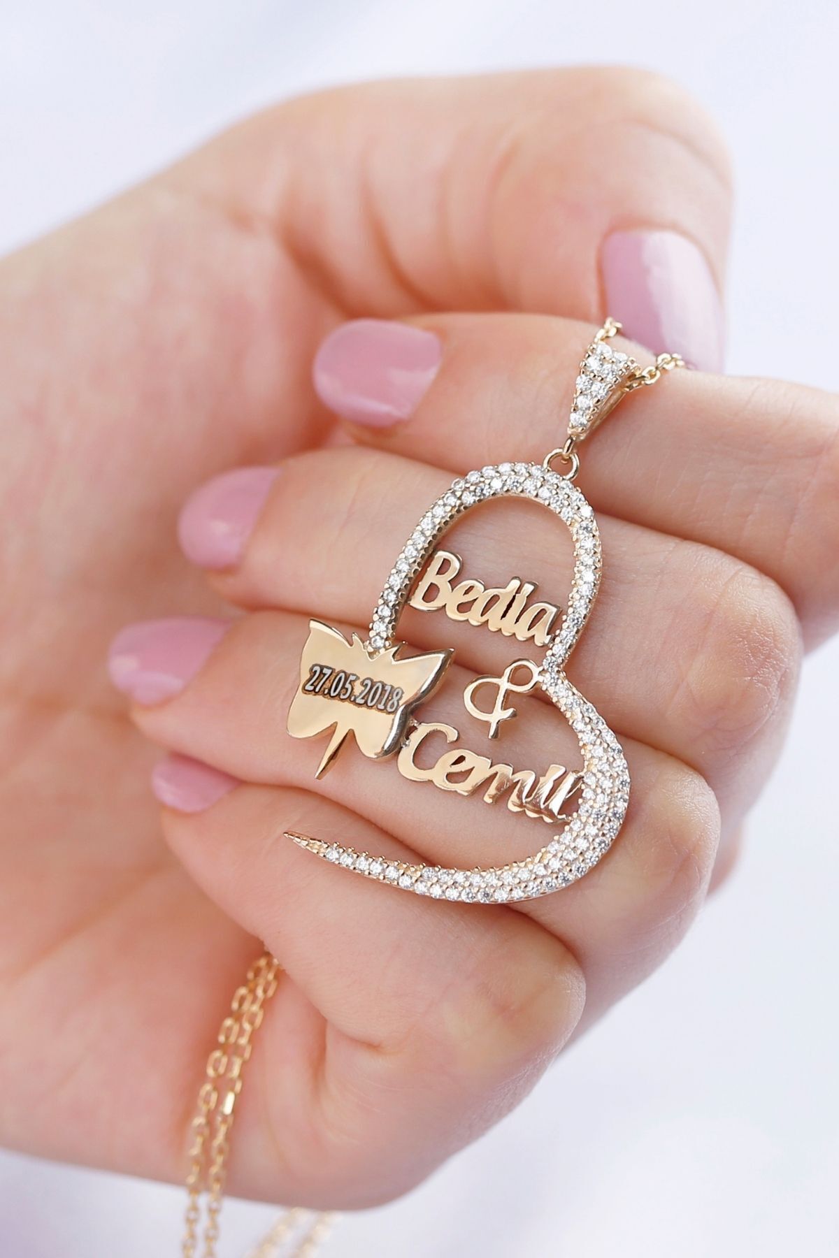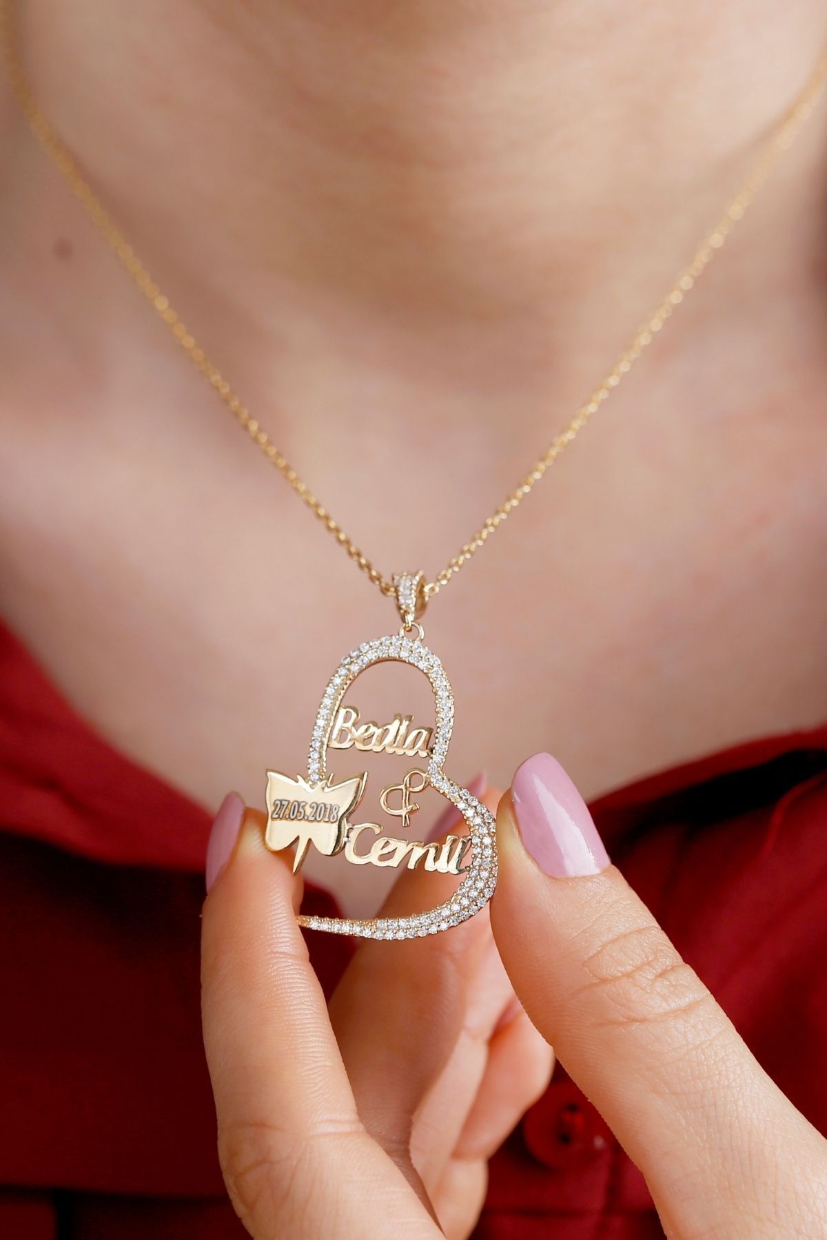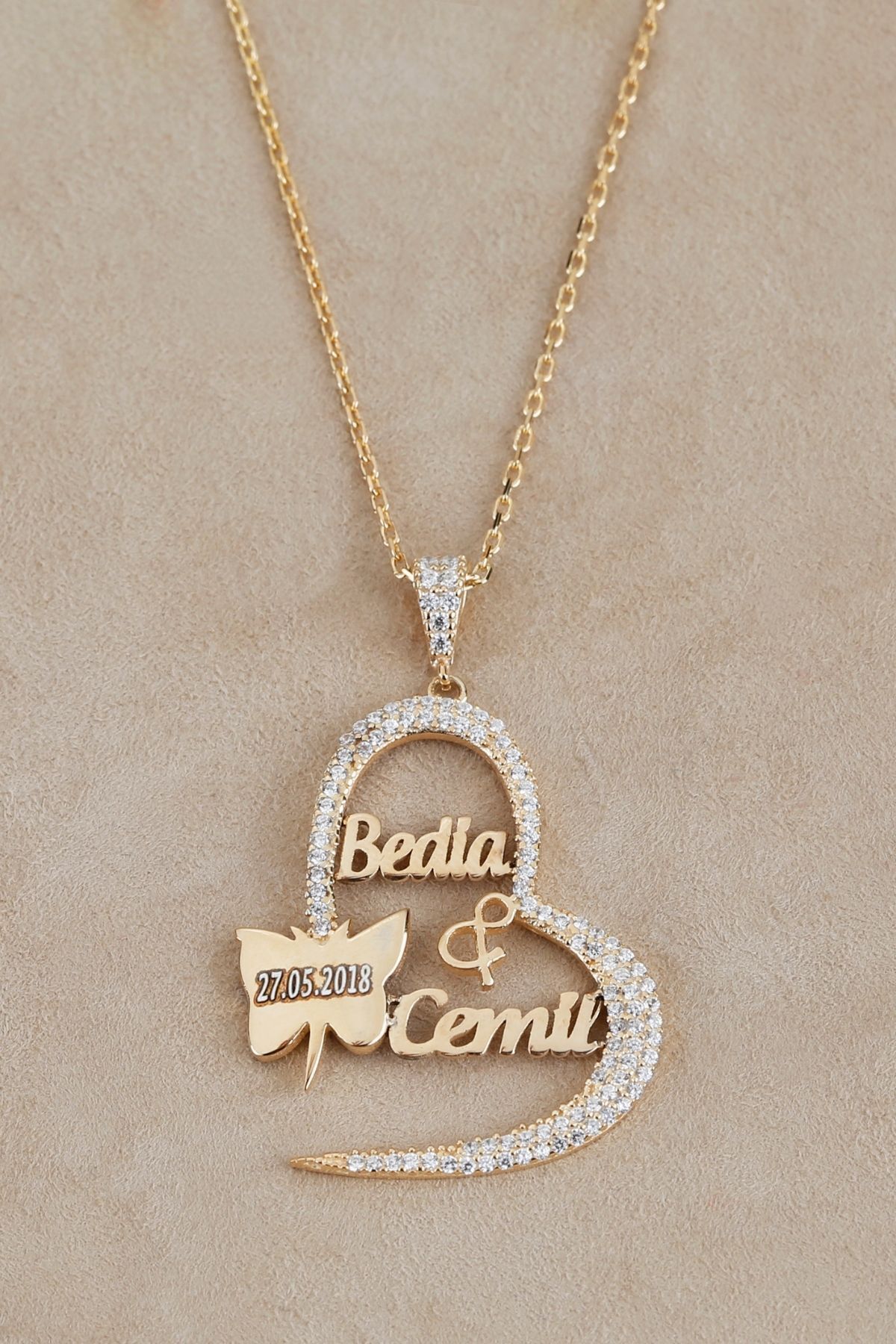 925 Ayar Gümüş Isimli Tarihli Kelebekli Kalp Kolye