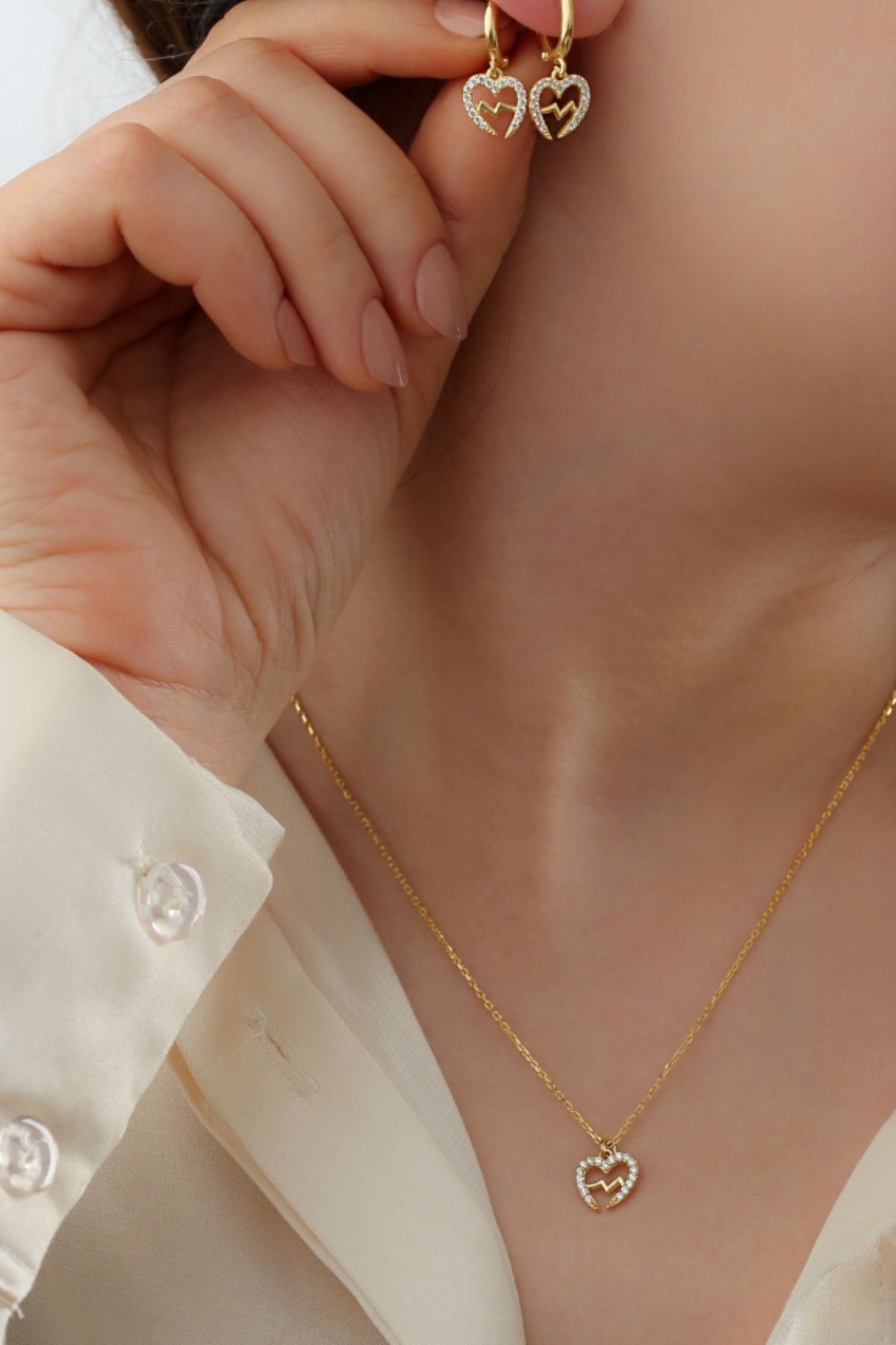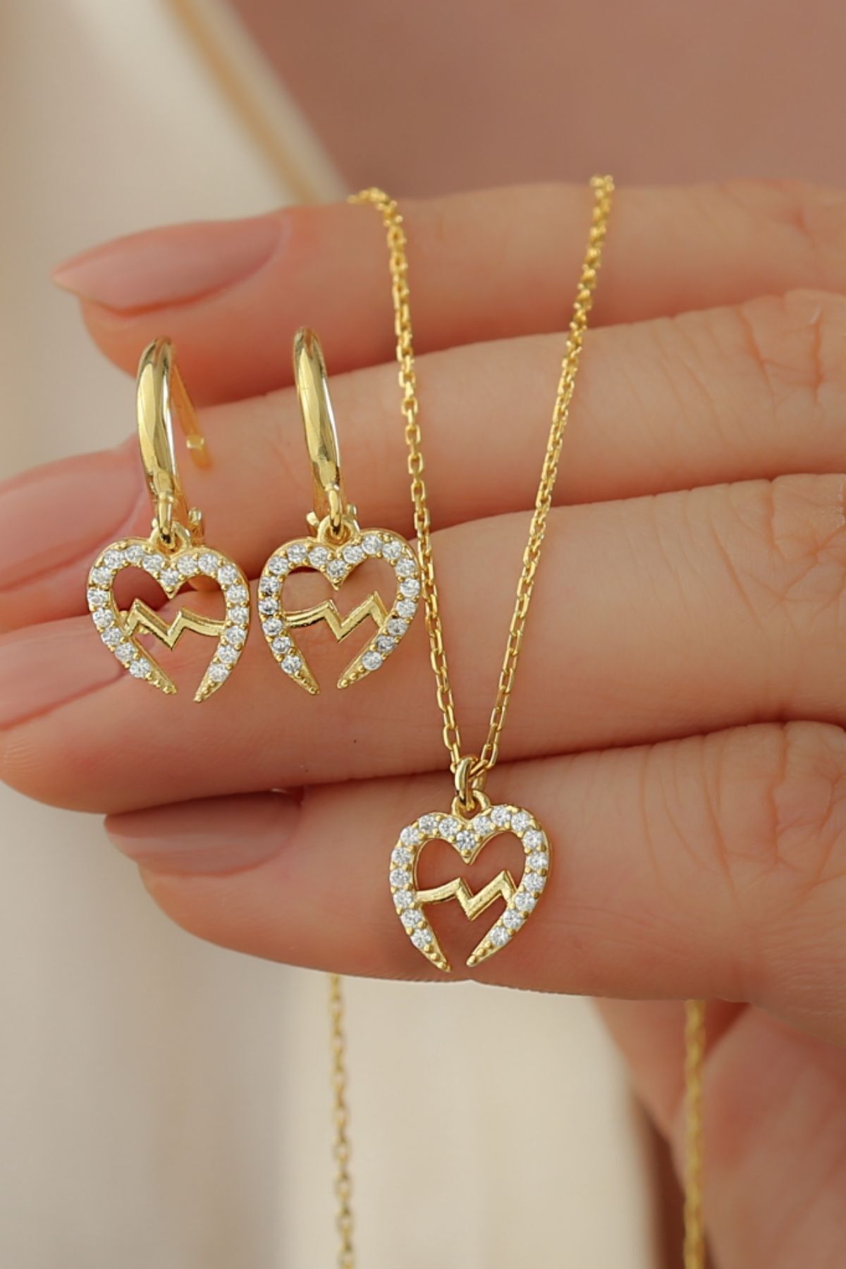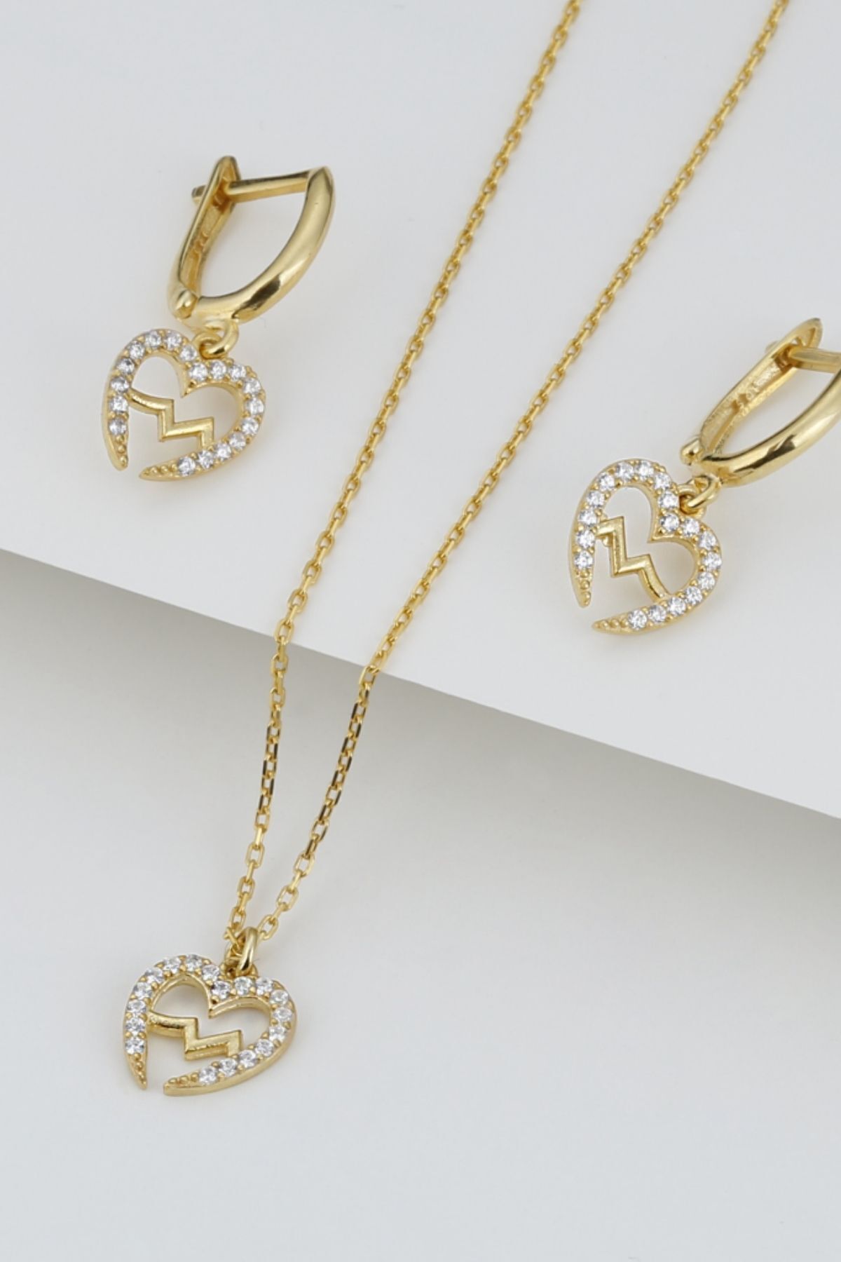 925 Ayar Gümüş Kalp Ritim Kolye Küpe Seti