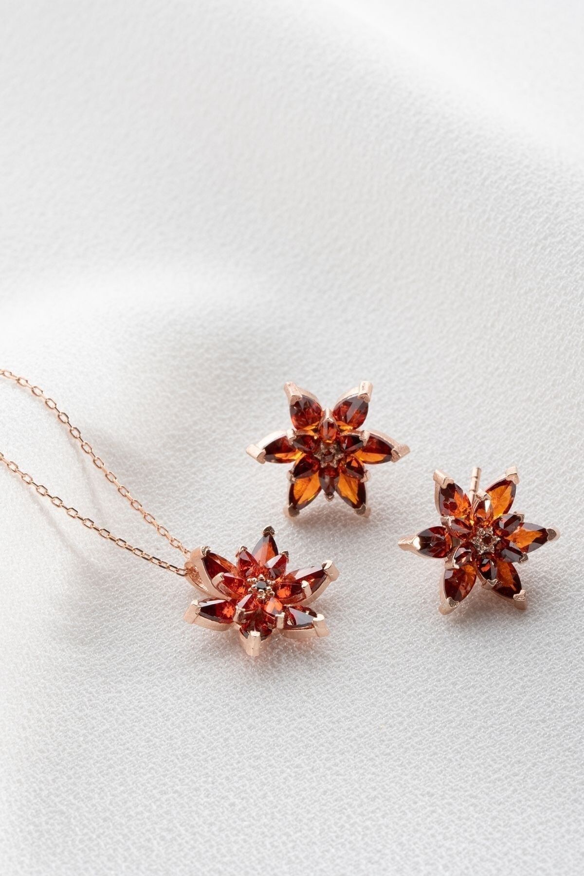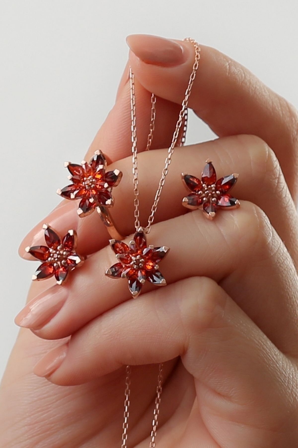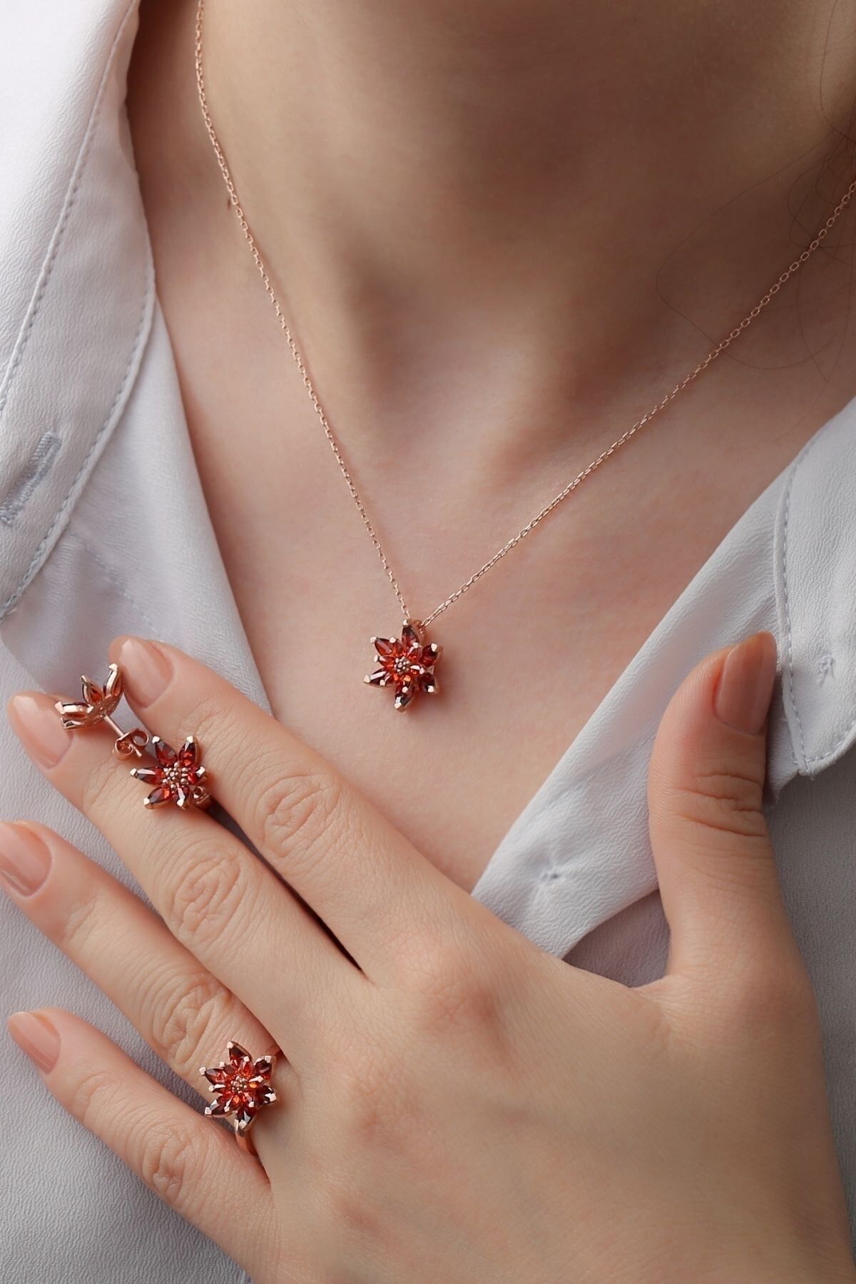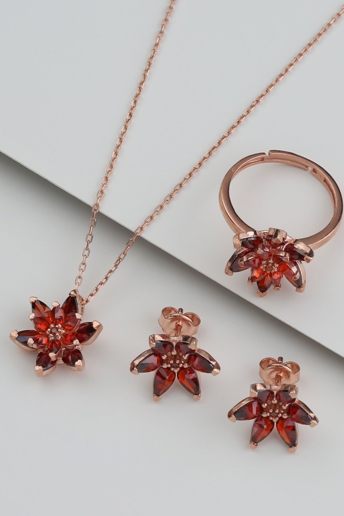 925 Ayar Gümüş Kırmızı Lotus Çiçekli Takı Set