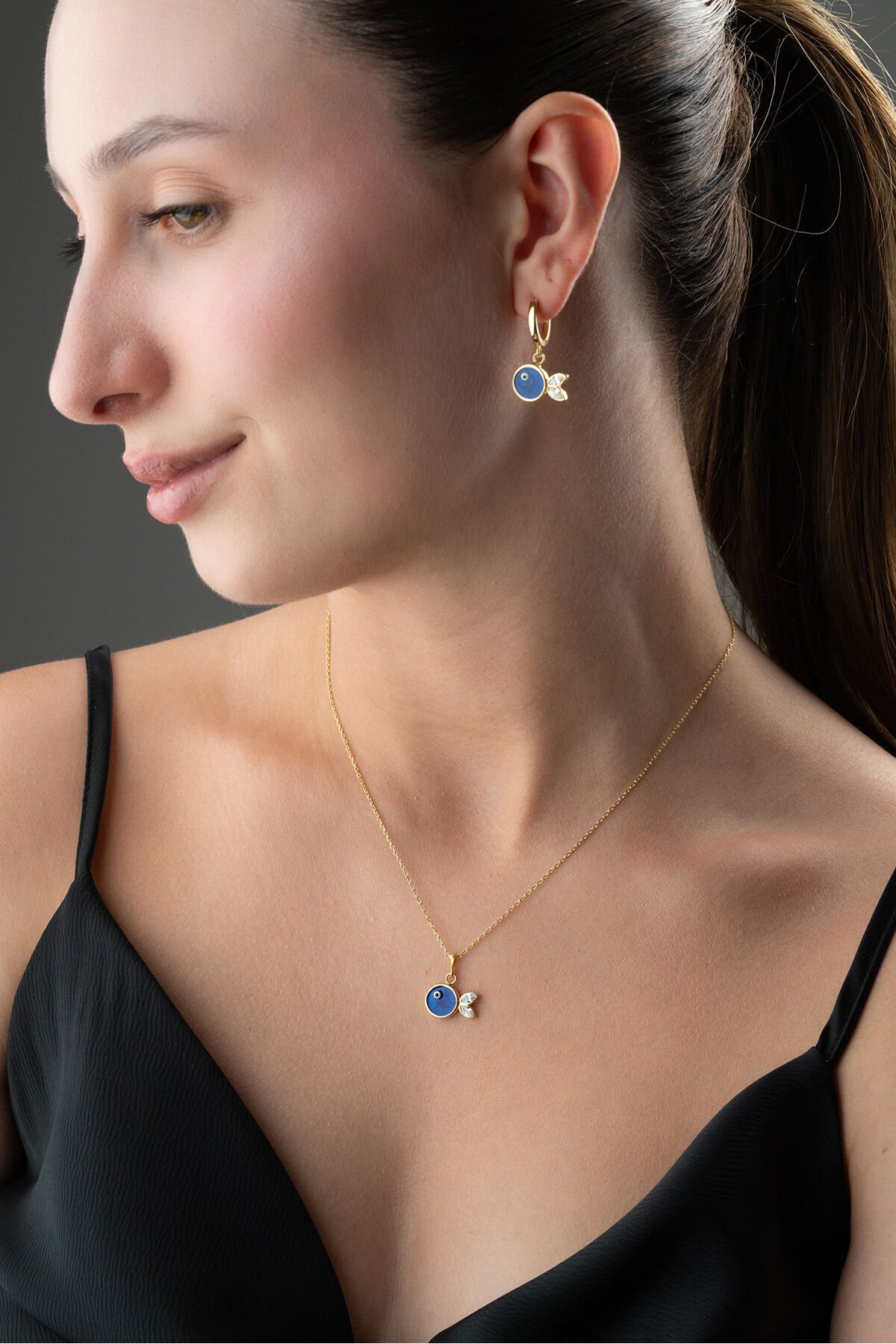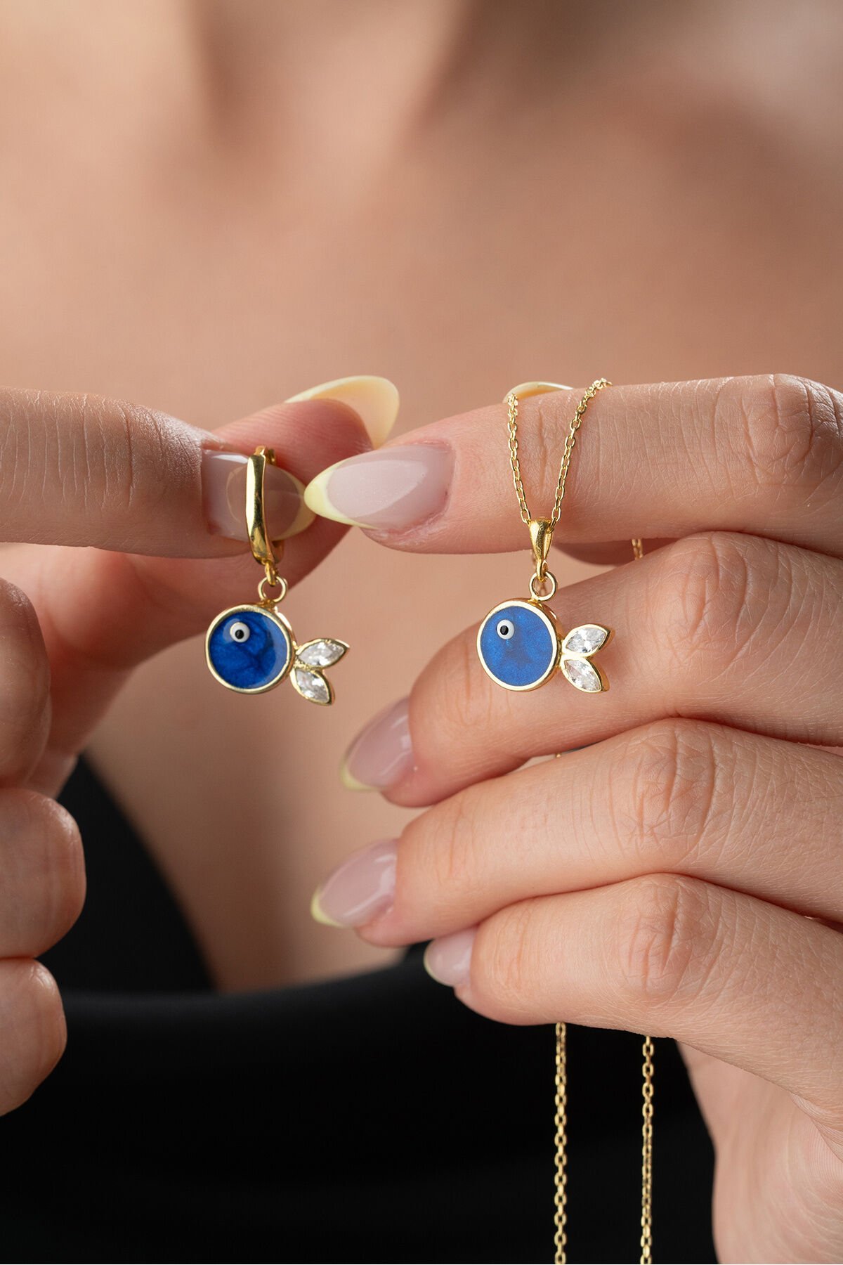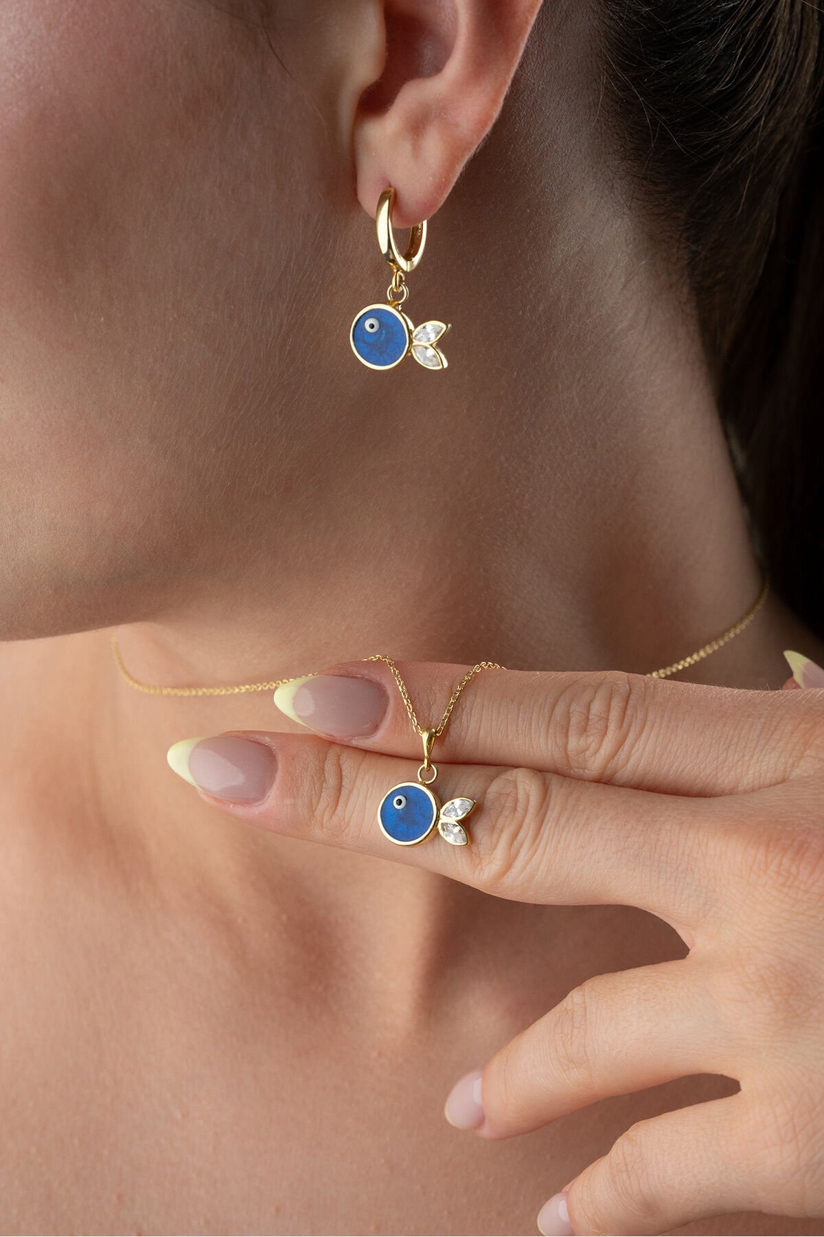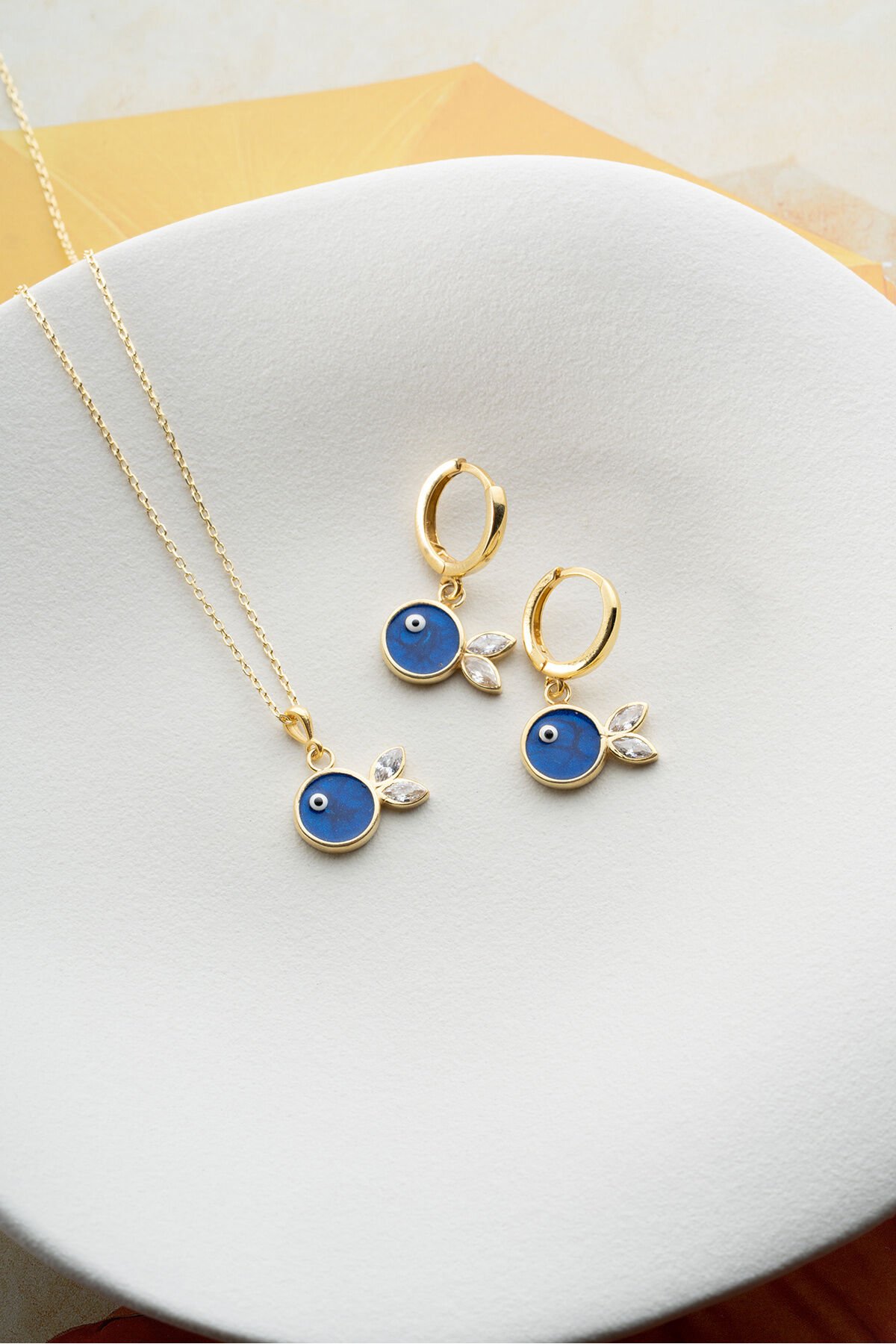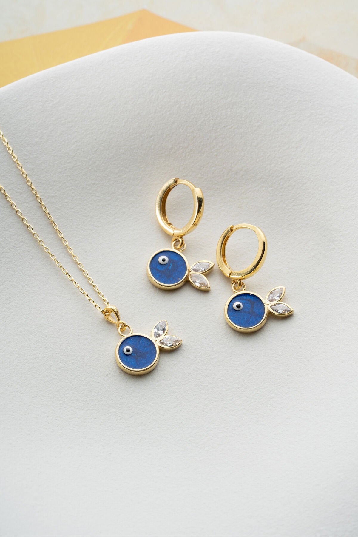 925 Ayar Gümüş Lacivert Mineli Balık (Kolye-Küpe) Takı Seti